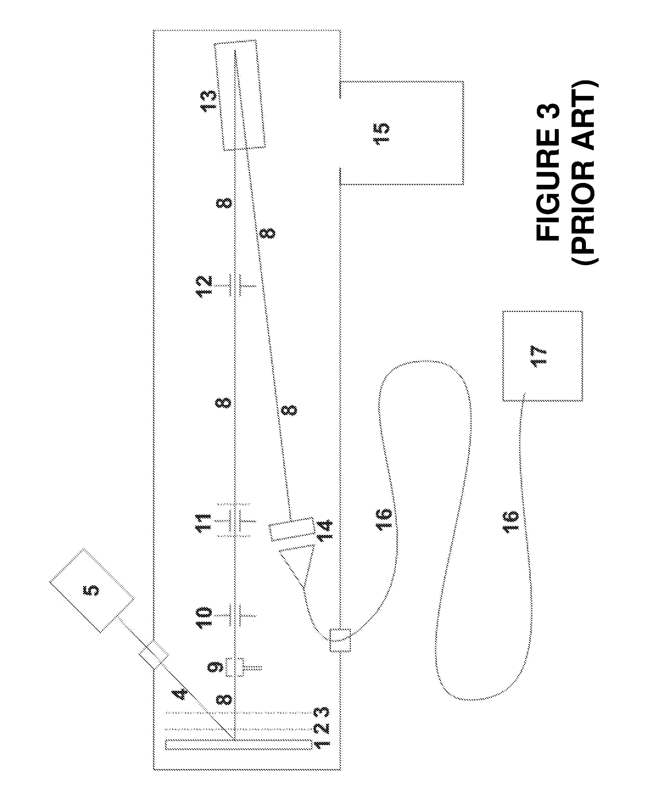 FIG. 3 is a schematic diagram of a conventional MALDI time-of-flight mass spectrometer according to the Prior Art. The samples are located on the sample support plate (1), opposite the accelerating electrodes (2) and (3), and can be ionized by the beam of laser light pulses (4) supplied by the laser (5). The ions are accelerated by the accelerating electrodes (2) and (3) to create an ion beam (8), which passes through a gas cell (9) which may, if required, be filled with collision gas, a parent ion selector (10), a daughter ion post-acceleration unit (11) and a parent ion suppressor (12), and is then reflected by the reflector (13) onto the ion detector (14). The mass spectrometer housing is evacuated by a powerful vacuum pump (15). In this example illustration, the ion detector (14) has a multichannel plate and a metal cone for reflection-free matching to a 500 coaxial cable (16). The 500 coaxial cable is several meters long and feeds the output current to a computer (17) containing the high-speed digitizing unit.