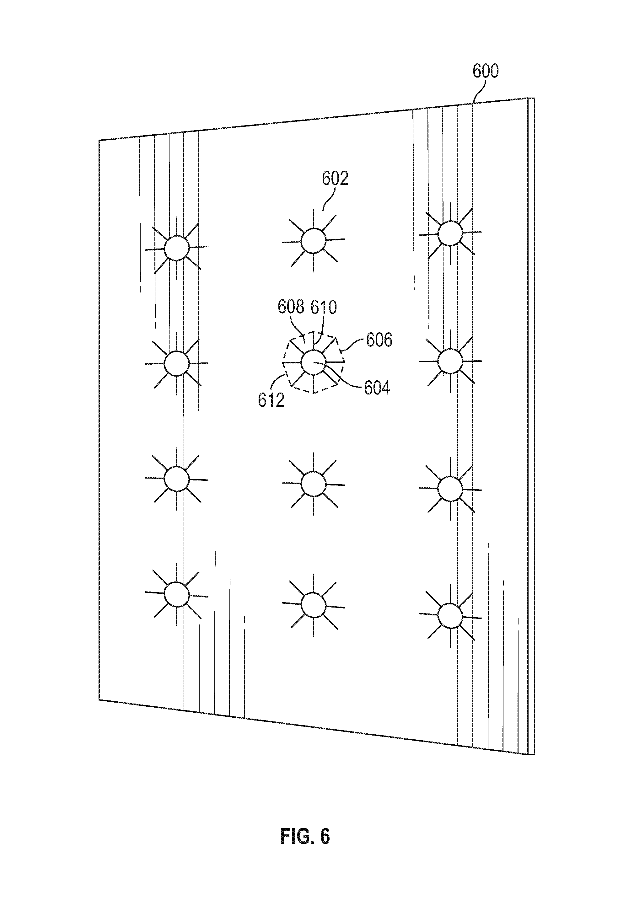 With continued reference to FIG. 16, the assembly includes a top planar component 1622 including a plurality of cut-outs 1610, and a bottom planar component 1624 including a plurality of flap assemblies 1612. In an embodiment, each flap assembly includes a plurality of substantially triangular flaps 1614 bounded by cut lines 1616 and pivotable (bendable) about a pivot line 1611. The top and bottom planar components 1622, 1624 may be foldable about a hinge 1626, as described above. When the top and bottom components are folded upon (and hence parallel to) each other, one or more tabs 1606 may be pressed into a corresponding dock 1608 to maintain the assembly in the folded over condition.