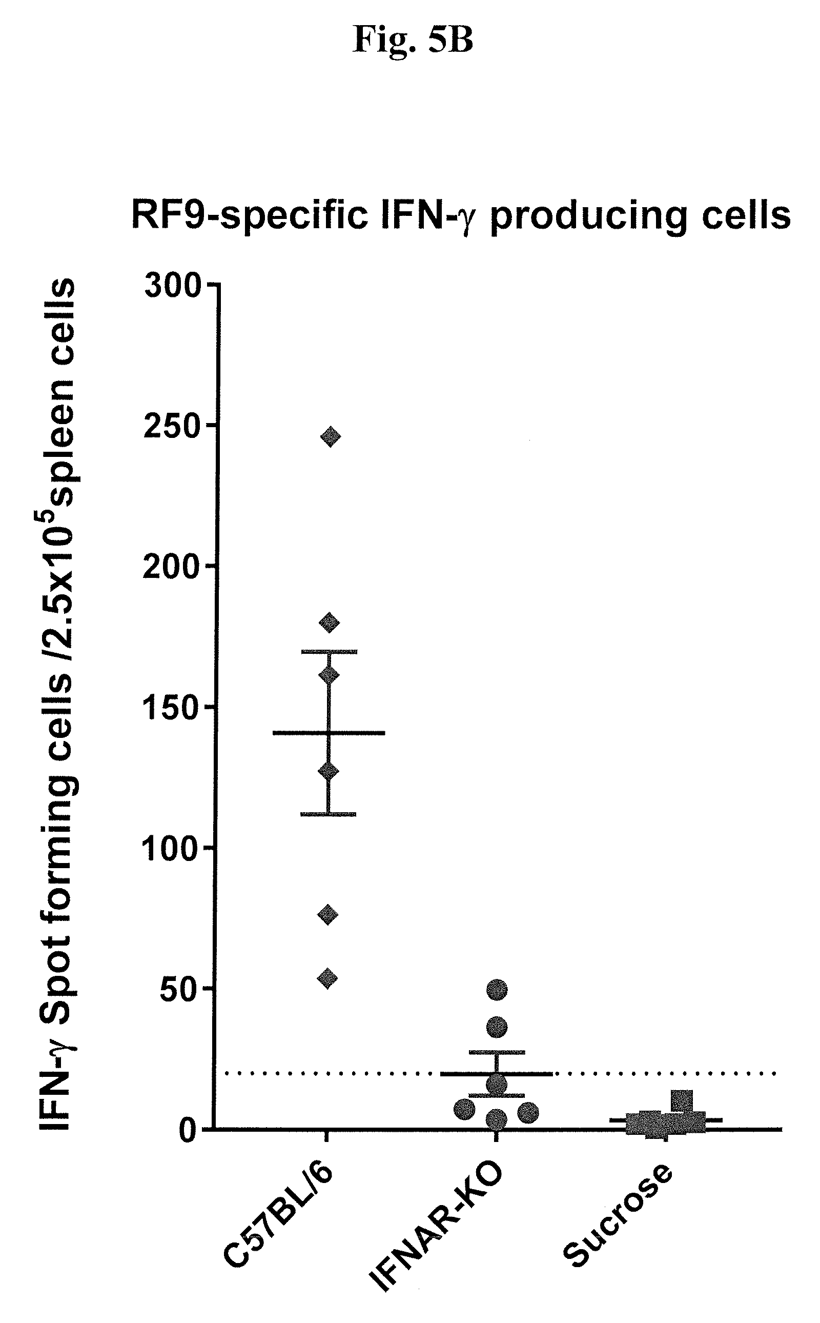 The demonstrated upregulation of Type I IFN-genes by cationic lipids, suggests that cationic lipids target the type I IFN pathway to induce robust CD8+ T-cell responses. To further confirm this hypothesis, an R-DOTAP formulation containing a well-characterized mouse CD8+ T-cell epitope (SIINFEKL (SEQ ID NO:1)) of chicken ovalbumin or HPV16-E7 protein derived CD8 T cell epitope (RF9: RAHYNIVTF (SEQ ID NO:2)) was administered to wild-type C57BL/6J mice and to type I interferon signal deficient IFNAR−/− mice on days 0 and on day 7. Mice were also vaccinated with complete Freund's adjuvant (CFA)+SIINFEKL. The peptide-only vaccine was used as a positive control. On day 14, antigen-specific (SIINFEKL) CD8+ T cell responses induced by R-DOTAP or CFA were assessed using the IFN-γ ELISPOT assay. As shown in FIG. 5A, vaccinating wild-type mice with the DOTAP formulation induced robust antigen-specific CD8+ T cell responses that are higher in magnitude than the CFA-adjuvanted formulation. In contrast, the CD8+ T cell response induced by R-DOTAP is dramatically reduced in the IFNAR−/− mice, although no such difference is noted with the CFA-adjuvanted formulation. We observed similar results (FIG. 5B) even with a tumor associated antigen expressed by HPV16 positive tumors. It is well documented that CFA adjuvant targets multiple TLR pathways and hence can bypass the requirement for type I IFN signaling to induce antigen-specific CD8+ T cell responses.