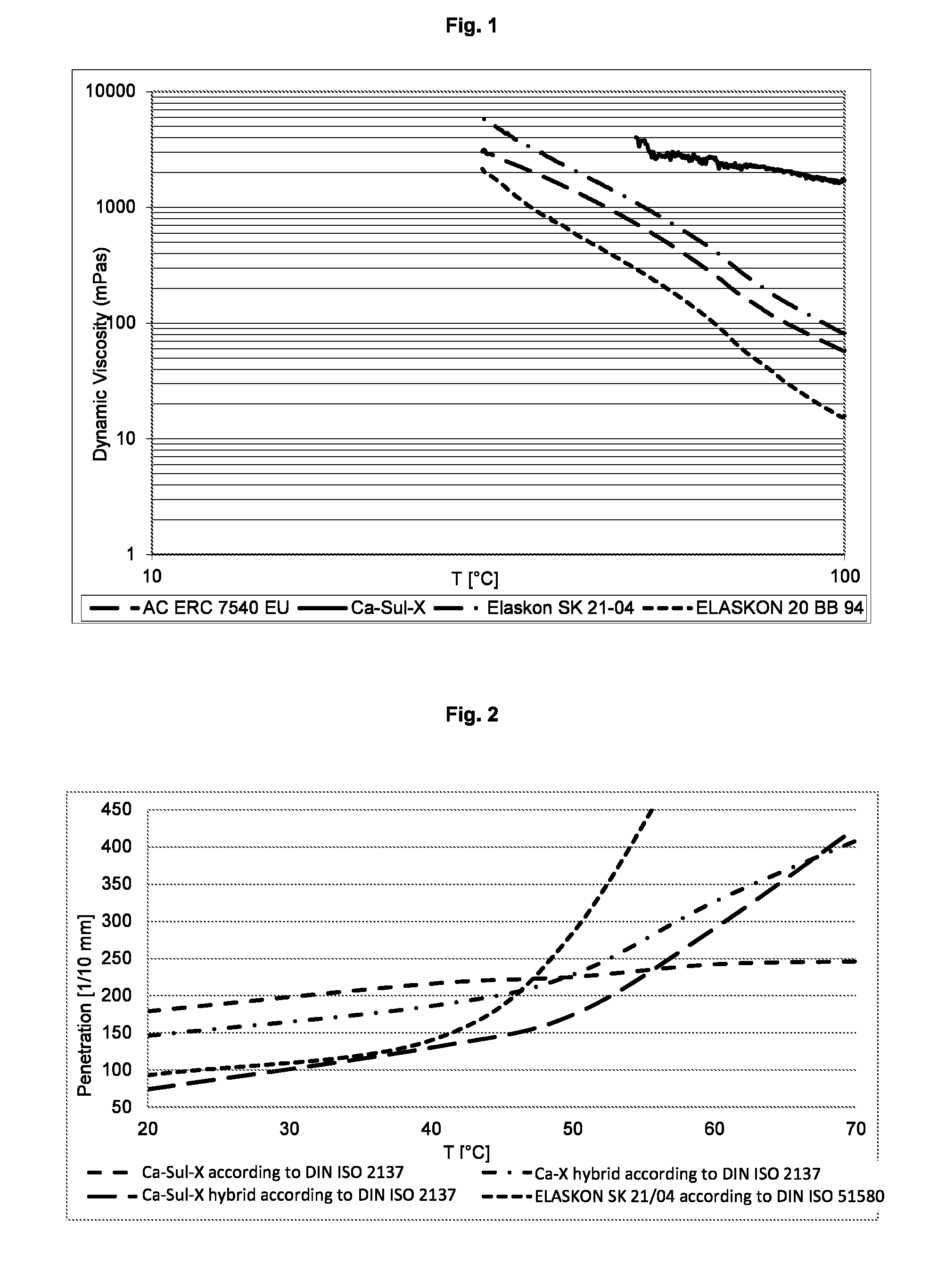 Overbased Ca sulfonate* 54 Base oil 19.7 Tap water 5 Butyl glycol 1.3 Dobanic acid 5.3 Ca(OH)2 2.8 12-hydroxy stearic acid 3.65 Acetic acid (60 weight %) 0.6 Phosphoric acid (75 weight %) 2.75 CaCO3 4.9 *Ca sulfonate with TBN 400, commercial product: Calcinate ® OR from Chemtura Example of a Ca complex soap Materials Used Weight % Base oil 74.08 Ca(OH)2 2.82 Trisodium phosphate 0.42 Sodium tetraborate decahydrate 0.42 Calcium acetate 7.42 Mixed fatty acids* 7.42 Suet 7.42 *commercial product: PRIFAC 5910 from CRODA ** commercial product: Suet, technical grade from SONAC Overbased Ca sulfonate 27% Base oil 59.0% Tap water 2.5% Butyl glycol 0.65% Dobanic acid 2.65% Optional Ca(OH)2 1.4% 12-hydroxy stearic acid 1.8% Acetic acid 0.3% Phosphoric acid 1.85% CaCO3 2.45% ANTICORIT from FUCHS in Mannheim, Germany (ANTICORIT ERC 7540 EU ERC 7540 EU is a product from base oil wax with additives for improving corrosion protection and reducing wear) ELASKON from Elaskon in Dresden, Germany (wax-based rope SK 21-04 lubricant) ELASKON from Elaskon in Dresden, Germany (wax-based rope 20 BB 94 lubricant) NYROSTEN T55 from Nyrosten in Geldern, Germany (wax-based rope lubricant) RENOLIT from FUCHS in Mannheim, Germany - Li/Ca 12- LC-WP 2 hydroxystearate with a corrosion protection additive RENOLIT from FUCHS in Mannheim, Germany - Ca 12- CA-FG 50 hydroxystearate without corrosion protection additive Elaskon SK-U from Elaskon in Dresden, Germany (wax-based rope lubricant) Elaskon SK-CE from Elaskon in Dresden, Germany (wax-based rope lubricant) Berucoat AK 376 from Beechem in Hagen, Germany - PTFE-based aqueous paste with organic binder Macromelt from Henkel in Düsseldorf, Germany Bio Grease MP 2 from INTERFLON in Roosendaal, Netherlands - PTFE-functionalized lithium soap grease with a wear protection additive containing phosphorous. OKS 450 from OKS Spezialschmierstoffe, Maisach-Gernlinden in Germany, synthetic oil with ZnDTP with Mo wear protection additive and calcium sulfonate as a corrosion protection additive Ca-Sul-X −62 ANTICORIT ERC 7540 EU −40 ELASKON SK 21/04 −38 ELASKON 20BB −36 NYROSTEN T55 −20 t [h] 30 50 125 150 220 290 310 370 460 Corrosion [%] Ca-Sul-X 0 0 0 0 5 5 5 40 70 Ca-Sul-X 0 0 0 0 10 30 60 75 90 hybrid Hybrid Ca-X 0 0 5 10 60 75 90 90 95 ANTICORIT 0 0 5 10 15 30 40 50 60 ERC 7540 EU Elaskon 20 15 50 100 100 100 100 100 100 100 BB 94 t [h] 490 550 620 650 770 Corrosion [%] Ca-Sul-X 80 95 100 100 100 Ca-Sul-X hybrid 90 100 100 100 100 Hybrid Ca-X 95 100 100 100 100 ANTICORIT 70 90 100 100 100 ERC 7540 EU Elaskon 20 BB 94 100 100 100 100 100 Distilled Water 3% NaCl Solution Ca-Sul-X — 0-1 Hybrid Ca-X 1 (1)-2 ANTICORIT ERC 7540 EU (0)-1 4 RENOLIT LC-WP 2 0 5 RENOLIT CA-FG 50 3 — Elaskon 20 BB 94 1 2-3 Corrosion Level Meaning Description 0 No corrosion Unchanged 1 Traces of No more than 3 corrosion spots, of which corrosion none has a diameter above 1 mm 2 Slight corrosion No more than 1% of the surface corroded, but more or larger spots of corrosion than for Corrosion Level 1 3 Moderate More than 1%, but not more than 5% corrosion of the surface corroded 4 Heavy corrosion More than 5%, but not more than 10% of the surface corroded 5 Very heavy More than 10% of the surface corroded corrosion Ca-Sul-X 6500 ANTICORIT ERC 7540 EU 1800 Elaskon SK-U 1800 Elaskon SK-CE 2600 Ca-Sul-X 0.33 Hybrid Ca-X 0.28 ANTICORIT ERC 7540 EU 0.82 Elaskon 20 BB 94 0.52 Ca-Sul-X 0 0 0 ANTICORIT ERC 7540 EU 1 1 0 Berucoat AK 376 113 3 3 Macromelt 145 4 4 Bio Grease MP 2 0 1 1 OKS 450 0 2 0
