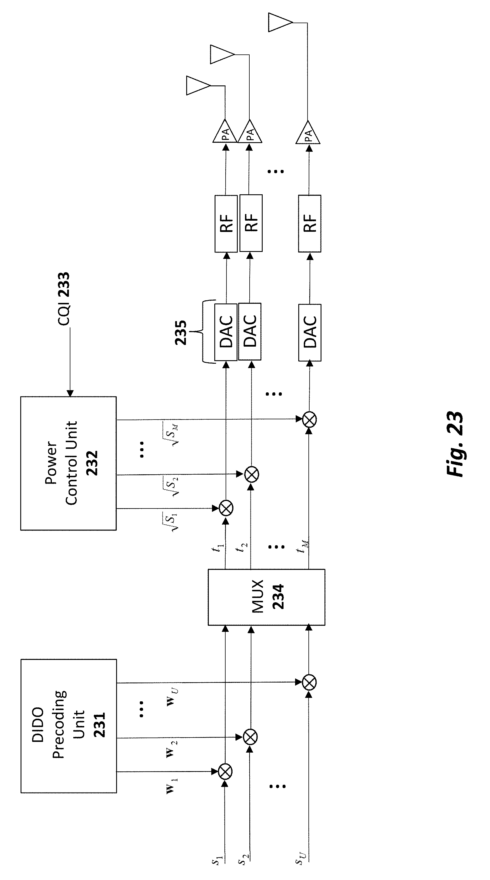 In another embodiment, the adverse effect of Doppler on the performance of DIDO precoding systems is reduced via linear prediction, which is one technique to estimate the complex channel coefficients in the future based on past channel estimates. By way of example and not limitation, different prediction algorithms for single-input single-output (SISO) and OFDM wireless systems were proposed in [7-11]. Knowing the future channel complex coefficients it is possible to reduce the error due to outdated CSI. For example, FIG. 62 shows the channel gain (or CSI) at different times: i) tCTR is the time at which the CTR in FIG. 58 receives the CSI from the UEs in FDD systems (or equivalently the BTSs estimate the CSI from the UL channel exploiting DL/UL reciprocity in TDD systems); ii) tCP is the time at which the CSI is delivered to the CP via the BSN; iii) tBTS is the time at which the CSI is used for precoding over the wireless link. In FIG. 62 we observe that due to the delay TBSN (also depicted in FIG. 58), the CSI estimated at time tCTR will be outdated (i.e., complex channel gain has changed) by the time is used for wireless transmission over the DL channel at time tBTS. One way to avoid this effect due to Doppler is to run the prediction method at the CP. The CSI estimates available at the CP at time tCTR is delayed of TBSN/2 due to CTR-to-CP latency and corresponds to the channel gain at time t0 in FIG. 62. Then, the CP uses all or part of the CSI estimated before time to and stored in memory to predict the future channel coefficient at time t0+TBSN=tCP. If the prediction algorithm has minimal error propagation, the predicted CSI at time tCP reproduces reliably the channel gain in the future. The time difference between the predicted CSI and the current CSI is called prediction horizon and in SISO systems typically scales with the channel coherence time.