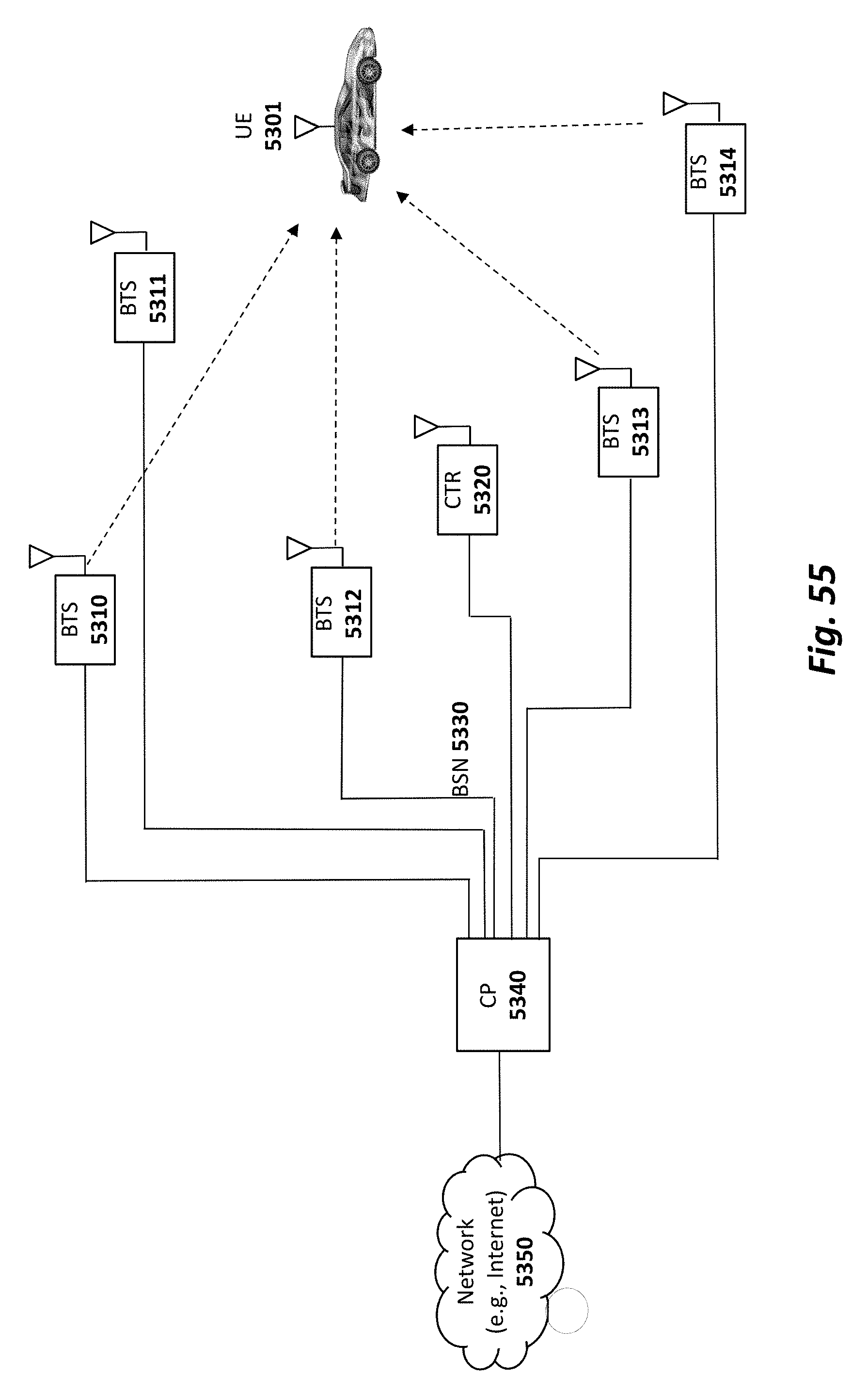 The BTSs 5310-5314 are placed anywhere that is convenient where there is access to the Internet or BSN. In one embodiment of the invention, the UEs 5301-5305 are placed randomly between, around and/or surrounded by the BTSs or distributed antennas as depicted in FIG. 54.