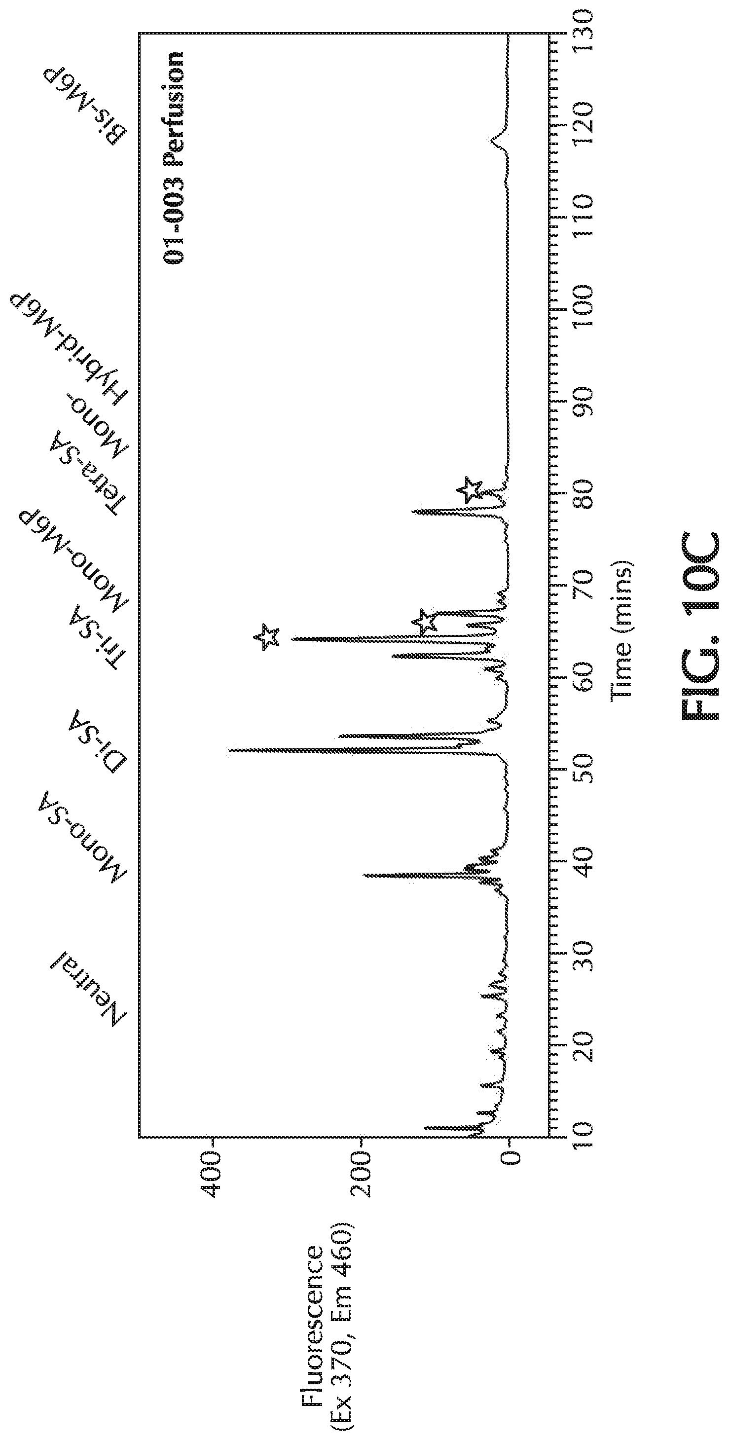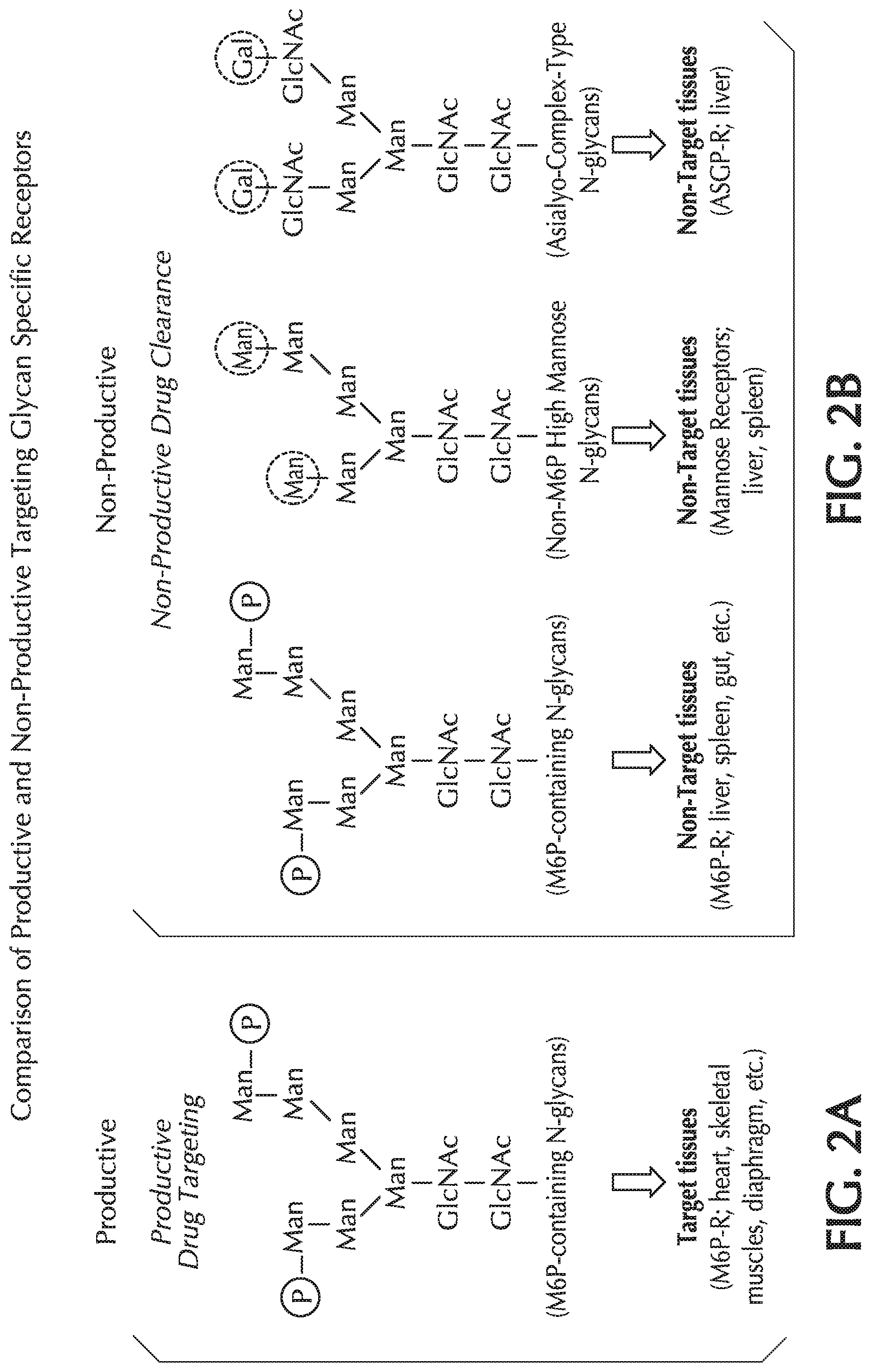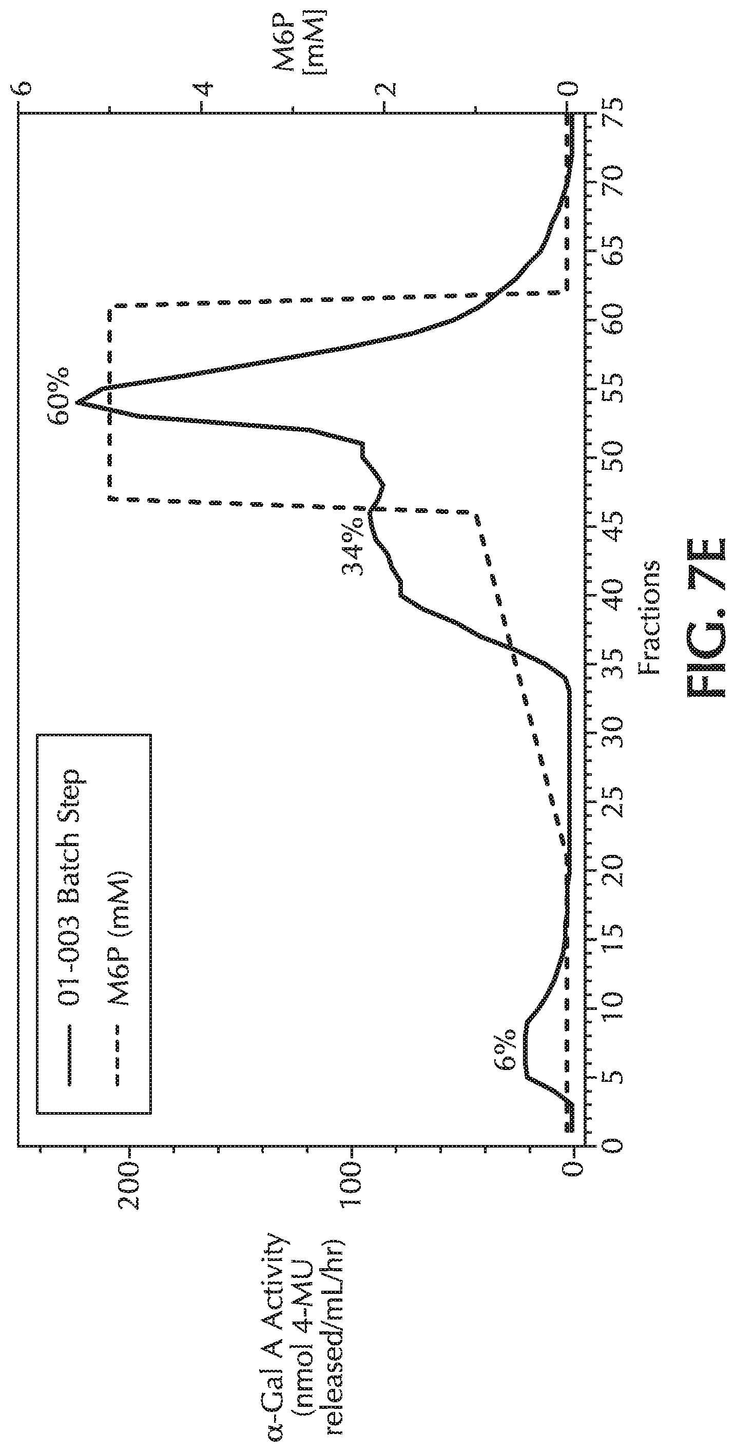 Replagal (agalsidase alfa) 1.8 4.9 Fabrazyme (agalsidase 3.4 4.8 beta) rhα-Gal A (04-023) 3.7 4.5 rhα-Gal A (01-003) 3.8 5.6 Neutral Complex and High 24.5 12.9 17.8 6.5 Mannose Sialylated Complex 45.2 42.0 35.8 48.2 Hybrid 1.5 10.6 0.2 6.4 Phosphorylated Mono-M6P (Hybrid) 1.5 10.6 0.2 6.4 Bis-M6P (Hybrid) Not determined 1.2 Not determined 3.0 Mono-M6P (High 25.7 20.7 31.9 20.8 Mannose) Bis-M6P (High 3.1 6.8 14.5 11.1 Mannose) Covered Mono-M6P Not determined 3.4 Not determined 1.8 (High Mannose) Covered Bis-M6P (High Not determined 0.1 Not determined 0.0 Mannose) 1Glycan values derived from HPLC analysis of 2AA labeled glycans 2Glycan values derived from LC/MS/MS method Neutral (High Mannose 24.5 12.9 17.8 6.5 and Complex) Mono-Sialylated 20.7 5.7 11.6 10.1 (Complex) Mono- or Di-Sialylated 2.4 0 3.4 0 (Complex) Di-Sialylated (Complex) 13.0 19.3 6.9 22.7 Tri-Sialylated (Complex) 8.5 13.1 11.8 10.6 Tetra-Sialylated 0.7 3.9 1.6 4.8 (Complex) Mono-M6P; Mono- 1.5 10.6 0.2 6.4 Sialylated (Hybrid) Mono-M6P (High 25.7 20.7 31.9 20.8 Mannose) Bis-M6P (High 3.1 6.8 14.5 11.1 Mannose) Bis-M6P (Hybrid) Not determined 1.2 Not determined 3.1 Covered Bis-M6P Not determined 0.1 Not determined 0.0 Covered Mono-M6P Not determined 3.3 Not determined 1.8 1Glycan values derived from HPLC analysis of 2AA labeled glycans 2Glycan values derived from LC/MS/MS method A1G1 0.19 A1G1S1 0.37 A2G1S1 0.29 A2G2 0.37 A2G2S1 1.67 A2G2S1Sg1 0.26 A2G2S2 5.09 A2G2Sg1 0.06 A3G3S2 0.16 A3G3S3 0.30 A4G4S3 0.04 FA1 0.20 FA1G1 0.23 FA1G1S1 0.55 FA2G1 0.52 FA2G1S1 0.87 FA2G2 0.66 FA2G2 2(Ac)S2 0.06 FA2G2AcS1 0.04 FA2G2AcS2 0.13 FA2G2S1 4.31 FA2G2S1Sg1 0.70 FA2G2S2 14.99 FA2G2Sg1 0.19 FA3G1S1 0.08 FA3G2 0.04 FA3G2S1 0.16 FA3G2S1K1 0.00 FA3G2S2 0.35 FA3G3 0.11 FA3G3S1 0.47 FA3G3S1Sg1 0.04 FA3G3S2 1.59 FA3G3S3 8.35 FA4G3S2 0.04 FA4G3S3 0.14 FA4G4S2 0.19 FA4G4S2Sg1 0.00 FA4G4S3 1.16 FA4G4S3Sg1 0.43 FA4G4S4 4.70 FA5G5S3 0.14 FA5G5S4 0.04 A1 2(P)M5 3.01 A1G1M5 0.21 A2G1K1/A1G1S1M4 0.77 A1G1S1M5 0.72 A1G1S1PM6 4.67 A1G1Sg1M4 0.03 A1G1Sg1M5 0.02 A1PM6 0.00 A1PM7 1.72 FA1G1S1M4 0.05 FA1G1S1M5 0.06 FA1G1S1PM6 0.00 FA2G2S2M4 0.10 2(P)M7 10.17 2(P)M8 0.98 CPM6 1.48 CPM7 0.35 M4 0.29 M5 2.19 M6 0.63 M7 0.27 M8 0.21 M9 0.33 PM5 1.60 PM6 9.22 PM7 9.91 PM8 0.07 Total Mono-M6P (% of total glycans) 29.0 Total Bis-M6P (% of total glycans) 14.2 Total M6P (% of total glycans) 43.2 Total M6P (mol/mol protein) 3.4 Total Sialic (% of total glycans) 57.7 Total Sialic Acid (mol/mol protein) 7.0 Total Neutral (% of total glycans) 6.5 Example 5