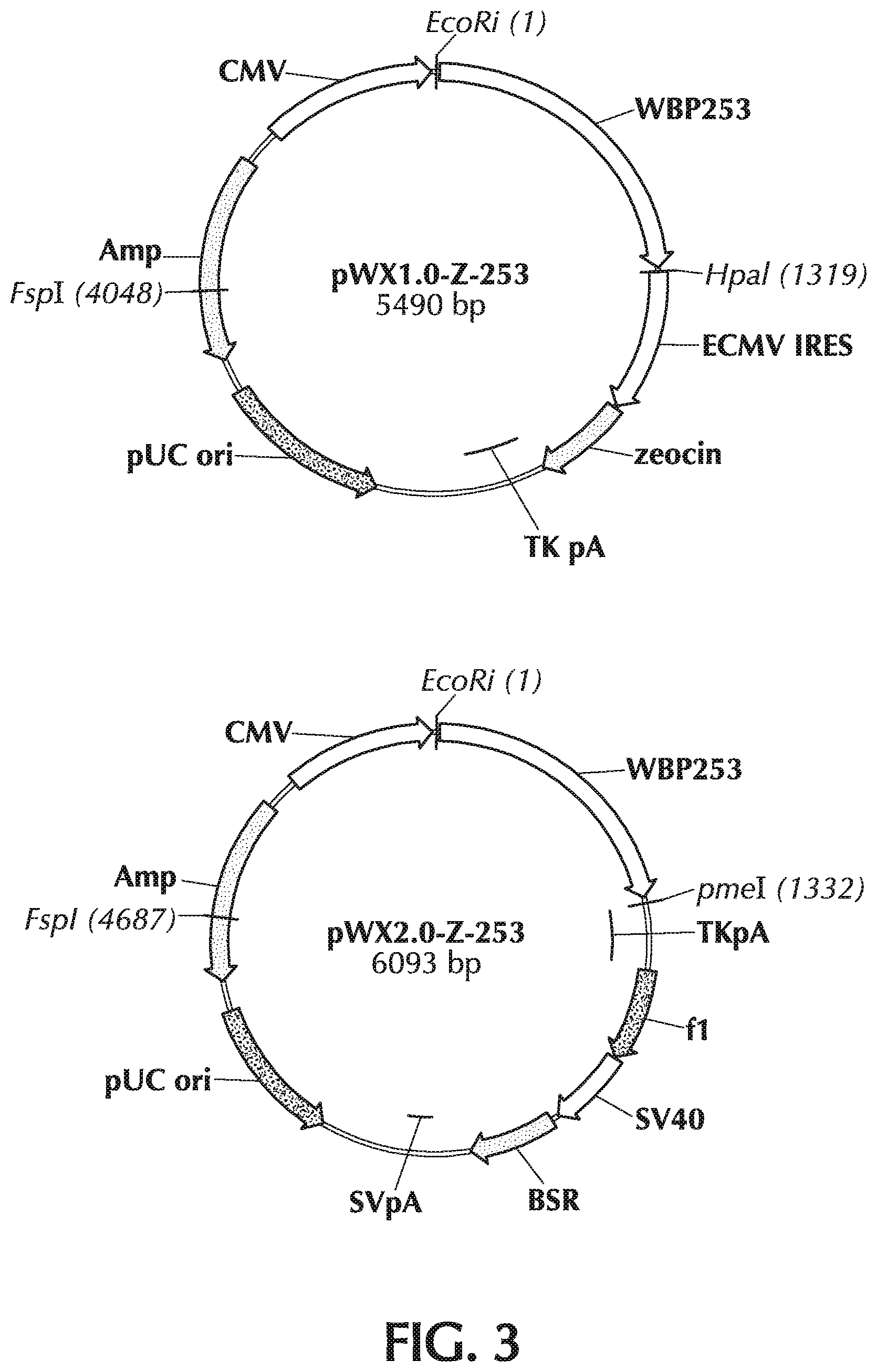 Any of the embodiments in the list above may be combined with one or more of the other embodiments in the list. The compositions and processes of the present invention will be better understood in connection with the following examples, which are intended as an illustration only and not limiting of the scope of the invention. Various changes and modifications to the disclosed embodiments will be apparent to those skilled in the art and such changes and modifications including, without limitation, those relating to the processes, formulations and/or methods of the invention may be made without departing from the spirit of the invention and the scope of the appended claims. DNA coding for wild-type human alpha-galactosidase A (α-Gal A) was cloned into a dual vector expression system for transfection into suspension CHO-K1 cells. The two vectors used for transforming CHO cells with DNA encoding rhα-Gal A (e.g. SEQ ID NO: 3) are shown in For transfections, each vector was linearized with FspI, which cuts within the Amp resistance gene. The digested DNA was purified with phenol chloroform extraction and quantified on a NanoDrop (Thermo Scientific, ND2000). The linearized DNA was sent for coding sequence confirmation and transfections. CHO K1 host cells were passaged at 7×105 cells/ml in medium M1 (CD CHO+4 mM Glutamine+1% HT Supplement) 24 hours before transfection. On the day of transfection, the host cell cultures were sampled and counted. During transfection, the host cell cultures were diluted to 10×105 cells/ml with medium M1 pre-warmed in water bath (36.5° C.) about 30 min and 5 ml of the diluted cells were added to a 50 ml spin tube and kept in a Kuhner incubator (36.5° C., 85% humidity, 6% CO2 at 225 RPM). 12 μg of each vector ( The diluted host cell cultures were removed from the Kuhner incubator, and 667 μl of DNA-Freestyle Max mixture was added into the host cell cultures. The transfected cell cultures were incubated in a Kuhner incubator (36.5° C., 85% humidity, 6% CO2 at 225 RPM) for 6 hours. 5 ml of fresh M1 medium was added into the transfected cell cultures. In total six independent transfections were performed using the above procedure. Forty-eight hours after transfection, cells from each transfection were plated in three 96-well plates at cell densities of 1-1.6×106 cells/ml and plating densities of 3000-4000 cells/100 μL/well in the selective medium M2 (Medium M1+9 μg/ml Blasticidin+400 μg/ml Zeocin). The 96-well plates were incubated in a CO2 incubator (36.5° C., 6% CO2). Three or four days after plating, 120 μl of fresh selective medium M2 was added to each well of the 96-well plates. Over the following 2-3 weeks, 150 μl of cell supernatant was replaced with equal volume of fresh selective medium every 3 or 4 days. To determine which of the six stable CHO pools would provide the best product attributes, the pools were compared for cell culture viability, expression of rhα-Gal A and binding to the CIMPR. Approximately 16-18 days after plating, when most of the wells reached >70% confluency, 150 μl of cell supernatant was replaced with equal volume of fresh selective medium M2 24 hours prior to the expression analysis. The cell pools were expanded in a pilot culture to investigate the viability over an extended period of time. The top 9 minipools with highest enzyme activity from each transfection were selected and expanded from 96- to 24-, to 6-well plates and into spin tubes for batch refeeding screening with selective medium M2. Vials were frozen down (Cryopreservation Medium: 90% M1+10% DMSO) during minipool expansion. Frozen vials were placed in cryobox freezing containers in −80° C. freezer overnight and stored in liquid nitrogen tanks. When the T9 pools were recovered, N-1 cell cultures were inoculated for batch refeeding cultures by 1:5 dilution into fresh production medium M3 (CDM4+4 mM Glutamine+1% HT Supplement) to obtain a seeding density of 3.8-5.7×105 cells/ml in spin tubes (day 0). The pool batch refeeding cultures (20 ml) were incubated in a Kuhner shaker (35° C., 85% humidity, 6% CO2, and 225 RPM). Starting from day 3, cells were spun down (300 RPM, 5 min, 25° C.) and 80% supernatant was exchanged with fresh medium. When viable cell density was above 20×106 cells/ml, certain amount of cells was discarded according to their growth to target viable cells density between 25×106 and 30×106 cells/ml on the next day. Pool batch refeeding cultures were harvested on day 20 by centrifugation (3000 RPM, 10 min, 4° C.). During 18 days of culture, the viability of each cell pool was greater than 90% and the density of viable cells was about 20-30×106 cells/ml. ( The expression of rhα-Gal A and binding to the CIMPR were assessed by 4-methylumbelliferyl-α-D-galactoside enzyme assay (4MU) and binding to a column with immobilized cation independent mannose-6-phosphate receptor (CIMPR), respectively. A desirable product attribute is high binding to the CIMPR. Binding to CIMPR presents a pathway for enzyme uptake into the lysosome which represents a major reservoir of accumulated substrate. The ability of the enzyme candidates to bind in vivo to the correct receptor for internalization was estimated by applying the cell supernatant from each pool to a CIMPR column ( The supernatants were further evaluated for binding in a 96-well plate based CIMPR binding assay. In summary, the supernatants from various time points were diluted 1; 100, 1:1,000, and 1:10,000 in CIMPR binding buffer and then added to wells coated with CIMPR receptor. After 1 hour incubation at 37° C., the unbound enzyme was washed away and the bound enzyme was measured in the 4MU enzyme activity assay. The activity was converted to nanograms of enzyme bound and the calculated values were plotted against the dilution. Pools 1 and 4 showed the best (compared to Fabrazyme (agalsidase beta)) and most consistent binding of the 6 pools. Based on the enzyme activity data and the CIMPR