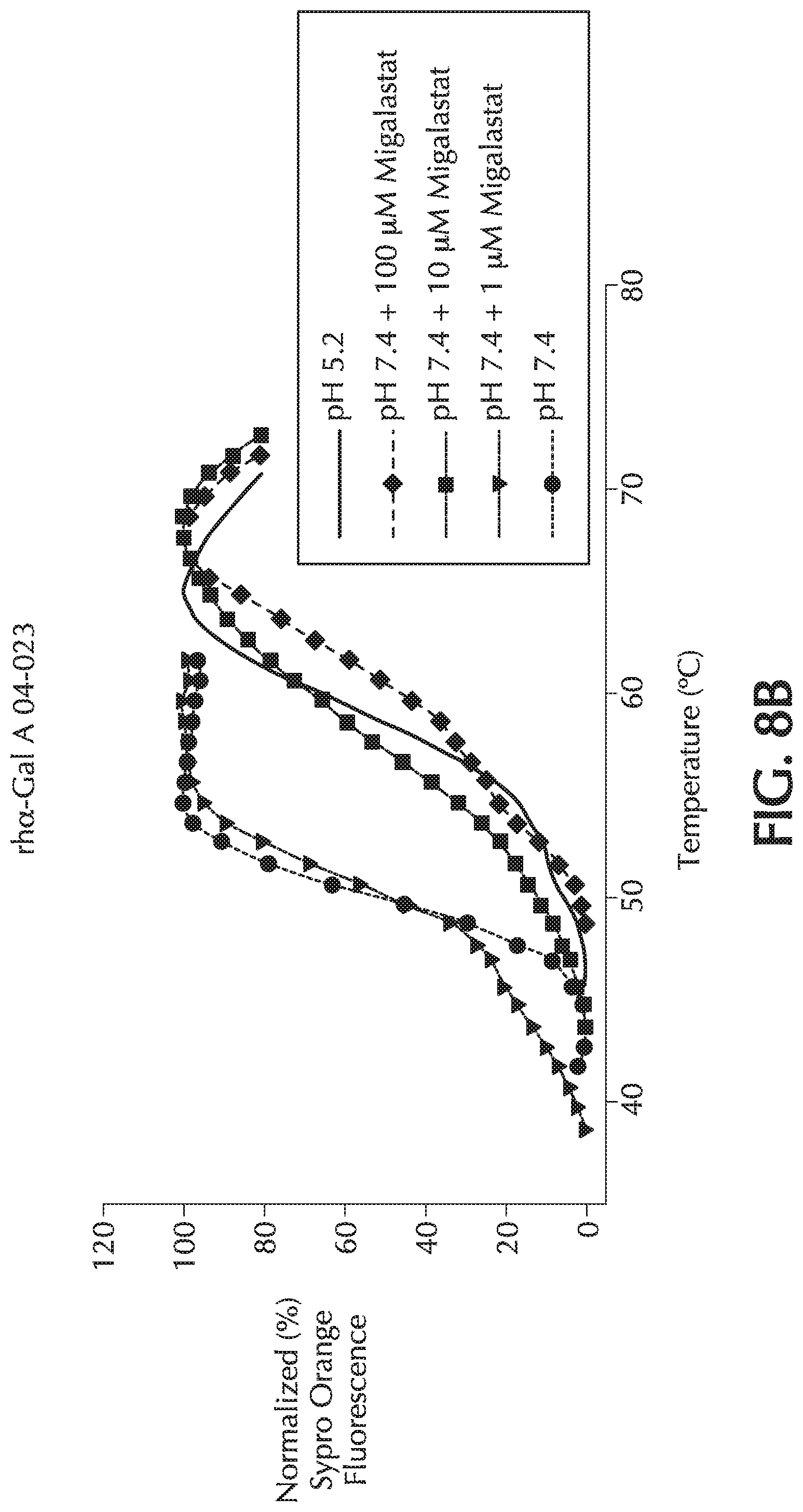 Sypro Orange Thermostability Tm ° C. Tm ° C. Tm ° C. Tm ° C. pH 7.4 + 1 μM pH 7.4 + 10 μM pH 7.4 + 100 μM Tm ° C. pH 7.4 Migalastat Migalastat Migalastat pH 5.2 rhα-Gal A 48.9 49.4 54.6 58.4 57.7 (01-003) rhα-Gal A 49.9 50.3 57.0 60.0 58.3 (04-023) Example 4