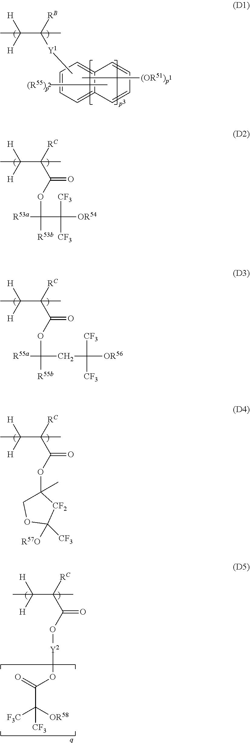 Example 1-1 R-1 Polymer A1 — PAG-A (2) Q-1 TMGU — PF-636 (80) PAG-1 (8) (4.5) (8.154) (0.075) 1-2 R-2 Polymer A1 — PAG-A (2) Q-1 TMGU Polymer D1 PF-636 (80) PAG-1 (8) (4.4) (8.154) (3) (0.075) 1-3 R-3 Polymer A1 — PAG-A (2) Q-1 TMGU Polymer D2 PF-636 (80) PAG-1 (8) (4.4) (8.154) (3) (0.075) 1-4 R-4 Polymer A1 — PAG-A (2) Q-1 TMGU Polymer D3 PF-636 (80) PAG-1 (8) (4.4) (8.154) (3) (0.075) 1-5 R-5 Polymer A2 — PAG-1 Q-1 TMGU — PF-636 (80) (10) (4.5) (8.154) (0.075) 1-6 R-6 Polymer A3 — PAG-2 Q-1 — — — (80) (10) (4.8) 1-7 R-7 Polymer A4 — PAG-2 Q-1 — — — (80) (10) (4.3) 1-8 R-8 Polymer A5 — PAG-2 Q-1 — — — (80) (10) (4.5) 1-9 R-9 Polymer A6 — PAG-2 Q-1 — — — (80) (10) (4.4) 1-10 R-10 Polymer A7 — PAG-2 Q-1 — — — (80) (10) (5.0) 1-11 R-11 Polymer A8 — PAG-2 Q-1 — — — (80) (5) (5.5) 1-12 R-12 Polymer A9 — PAG-2 Q-1 — — — (80) (2) (5.5) 1-13 R-13 Polymer A10 — PAG-2 Q-1 — — — (80) (5) (5.5) 1-14 R-14 Polymer A11 — PAG-2 Q-1 — — — (80) (5) (4.0) 1-15 R-15 Polymer A12 — PAG-2 Q-1 — — — (80) (5) (5.5) 1-16 R-16 Polymer A13 — PAG-2 Q-1 — — — (80) (5) (5.3) 1-17 R-17 Polymer A14 — PAG-2 Q-1 — — — (80) (5) (4.0) 1-18 R-18 Polymer A15 — PAG-2 Q-1 — — — (80) (5) (6.2) 1-19 R-19 Polymer A16 — PAG-2 Q-1 — — — (80) (5) (6.2) 1-20 R-20 Polymer A17 — PAG-2 Q-1 — — — (80) (10) (5.2) 1-21 R-21 Polymer A18 — PAG-2 Q-1 — — — (80) (5) (5.1) 1-22 R-22 Polymer A19 — PAG-2 Q-1 — — — (80) (10) (4.0) 1-23 R-23 Polymer A20 — PAG-2 Q-1 — — — (80) (5) (4.2) Example 1-24 R-24 Polymer A8 Polymer A3 PAG-1 Q-1 — — — (40) (40) (7) (5.2) 1-25 R-25 Polymer A8 Polymer A3 PAG-2 Q-1 — — — (40) (40) (7) (5.0) 1-26 R-26 Polymer A8 Polymer A3 PAG-2 Q-1 — Polymer D1 — (40) (40) (7) (5.0) (3) 1-27 R-27 Polymer A8 Polymer A3 PAG-2 (5) Q-1 — Polymer D1 — (40) (40) PAG-B (2) (5.2) (3) 1-28 R-28 Polymer A8 Polymer A3 PAG-2 Q-1 — Polymer D2 — (40) (40) (7) (5.0) (3) 1-29 R-29 Polymer A8 Polymer A3 PAG-2 Q-1 — Polymer D3 — (40) (40) (7) (5.0) (3) 1-30 R-30 Polymer A8 Polymer A3 PAG-2 Q-2 — Polymer D1 — (40) (40) (7) (4.0) (3) 1-31 R-31 Polymer A8 Polymer A3 PAG-2 Q-3 — Polymer D1 — (40) (40) (7) (3.0) (3) 1-32 R-32 Polymer A8 Polymer A3 PAG-2 Q-3 TMGU Polymer D1 — (40) (40) (7) (3.0) (2.0) (3) 1-33 R-33 Polymer A8 Polymer A3 PAG-3 Q-1 — Polymer D1 — (40) (40) (7) (4.8) (3) 1-34 R-34 Polymer A8 Polymer A3 PAG-4 Q-1 — Polymer D1 — (40) (40) (7) (4.9) (3) 1-35 R-35 Polymer A8 Polymer A3 PAG-5 Q-1 — Polymer D1 — (40) (40) (7) (4.9) (3) 1-36 R-36 Polymer A8 Polymer A3 PAG-6 Q-1 — Polymer D1 — (40) (40) (7) (4.9) (3) 1-37 R-37 Polymer A8 Polymer A19 PAG-3 Q-2 — Polymer D1 — (40) (40) (7) (2.5) (3) 1-38 R-38 Polymer A18 Polymer A17 PAG-2 Q-1 — Polymer D1 — (40) (40) (7) (5.4) (3) 1-39 R-39 Polymer A20 Polymer A19 PAG-3 Q-1 — Polymer D1 — (40) (40) (7) (3.0) (3) Comparative Example 1-1 CR-1 Polymer A1 — PAG-A (2) Q-1 TMGU — PF-636 (80) c-PAG-1 (8) (4.5) (8.154) (0.075) 1-2 CR-2 Polymer A3 — c-PAG-1 Q-1 — — — (80) (7) (5.2) 1-3 CR-3 Polymer A8 Polymer A3 c-PAG-1 Q-1 — — — (40) (40) (7) (5.2) 1-4 CR-4 Polymer A8 Polymer A3 c-PAG-2 Q-1 — — — (40) (40) (7) (5.2) 1-5 CR-5 Polymer A8 Polymer A3 c-PAG-3 Q-1 — — — (40) (40) (7) (5.2) 1-6 CR-6 Polymer A8 Polymer A3 c-PAG-4 Q-1 — — — (40) (40) (7) (5.2) 1-7 CR-7 Polymer A8 Polymer A3 c-PAG-5 Q-1 — — — (40) (40) (7) (5.2) [5] EB Writing Test