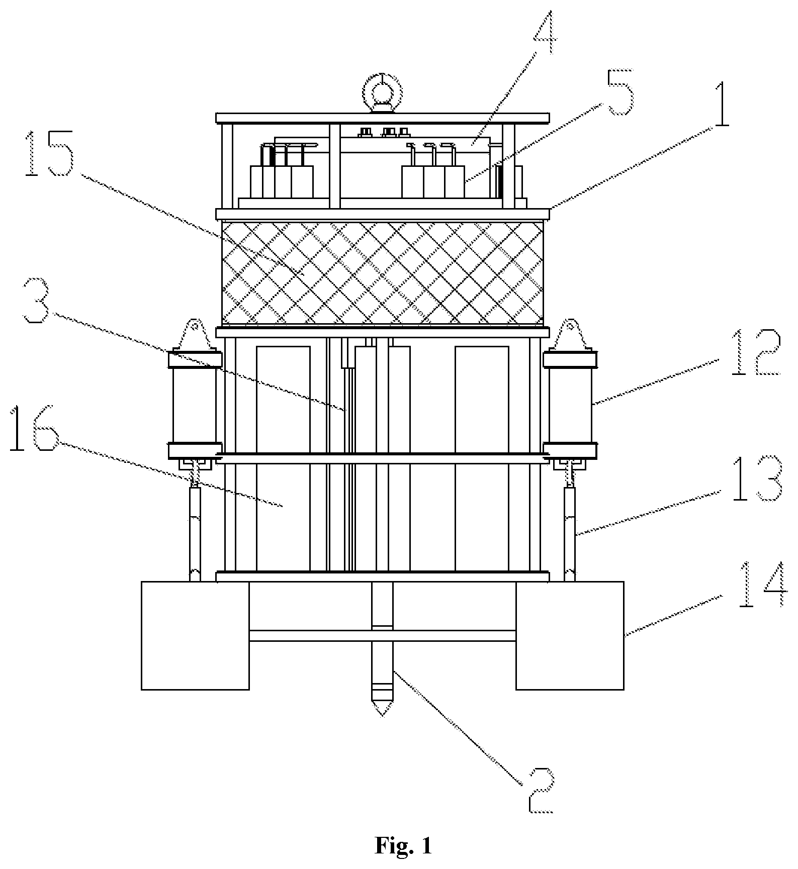 1. A long-term in-situ sampling and analysis device for sediment pore water, comprising a bracket, a probe, an elevator, a diverting device, a first water storage device, a second water storage device, a peristaltic pump, a dissolved gas of sediment pore water analysis device, and an in-situ environment measurement device, wherein