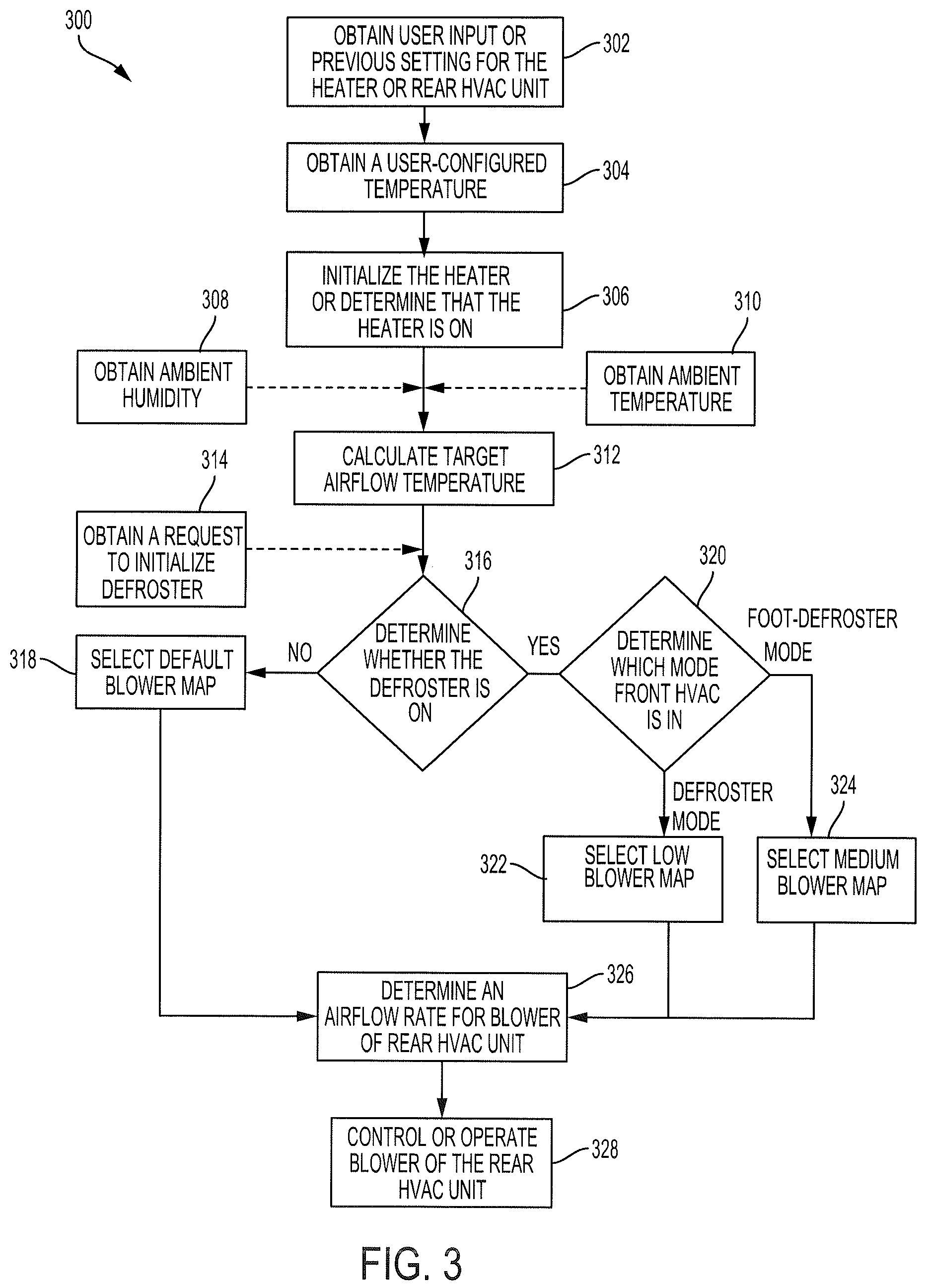 a rear heating, ventilation and air conditioning (HVAC) unit configured to move air into a rear cabin of the vehicle; a front heating, ventilation and air conditioning (HVAC) unit having a plurality of defroster settings and configured to move air into a front cabin of the vehicle; a memory for storing a plurality of blower maps that map different target airflow temperatures to different air flow rates within the rear cabin of the vehicle; and a processor connected to the rear HVAC unit and the memory, the processor being configured to: