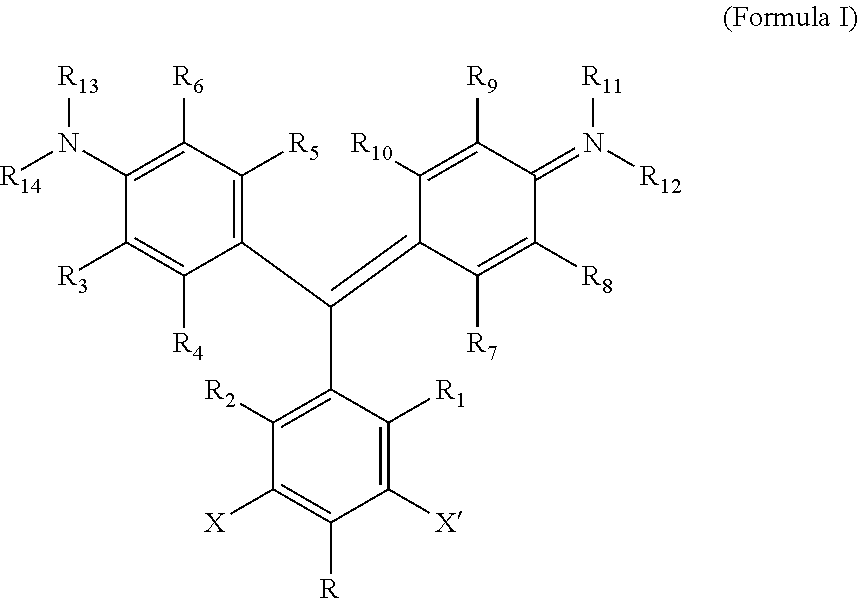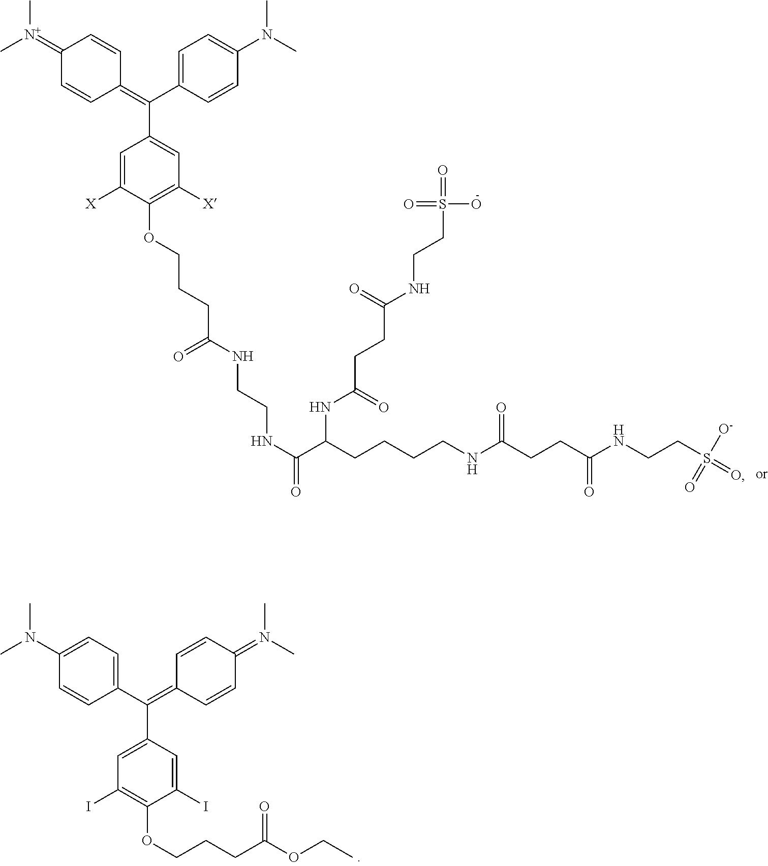 where X and X′ are, independently, heavy atoms, R1, R2, R3, R4, R5, R6, R7, R8, R9, and R10 are, independently H or F, R11, R12, R13 and R14 are, independently, methyl, H, aziridine or azetidine, wherein when R11, R12, R13, and/or R14 are aziridine or azetidine, R11 and R12 form a single ring and/or R13 and R14 form a single ring, and where R is selected from —H, —OH, —COO−, —SO3−, —PO4−, —NO2, —NH2, —N(CH3)(R15), —OR16, alkyl, ether, polyether, PEG1-30, —(C1-C4alkyl)-R17, heterocyles containing N, S or O atoms, substituted acetylenic groups, cyano, and carbohydrate groups, wherein R15 and R16 are: straight- or branched-chain alkyl; straight or branched-chain C1-6alkyl; straight-chain or branched poly(C1-C4alkyl amide); straight-chain or branched poly(C1-C4alkyl amide) having from 2 to 6 amide moieties; poly(C1-C4alkylene glycol); poly(C1-C4alkylene glycol) having from 2 to 30 or from 2-10 C1-C4alkylene glycol moieties; straight-chain or branched poly(C1-C4alkyl amide):poly(C1-C4alkylene glycol) diblock copolymer; straight-chain or branched poly(C1-C4alkyl amide):poly(C1-C4alkylene glycol) diblock copolymer having from 2 to 6 amide moieties and from 2 to 10 C1-C4alkylene glycol moieties; sulfonyl or bis-sulfonyl-terminated straight-chain or branched poly(C1-C4alkyl amide), optionally having from 2 to 6 amide moieties; bis-taurine branched poly(C1-C4alkyl amide), optionally having from 2 to 6 amide moieties; ethyl butyrate; C1-6alkyl C1-6alkanoate; —(CH2)n—C(O)—O—(CH2)m—CH3, where n=1-4 and m=0-3, and wherein R17 is selected from H, —OH, —COO−, —SO3−, —PO4−, —NO2, or —NH2.