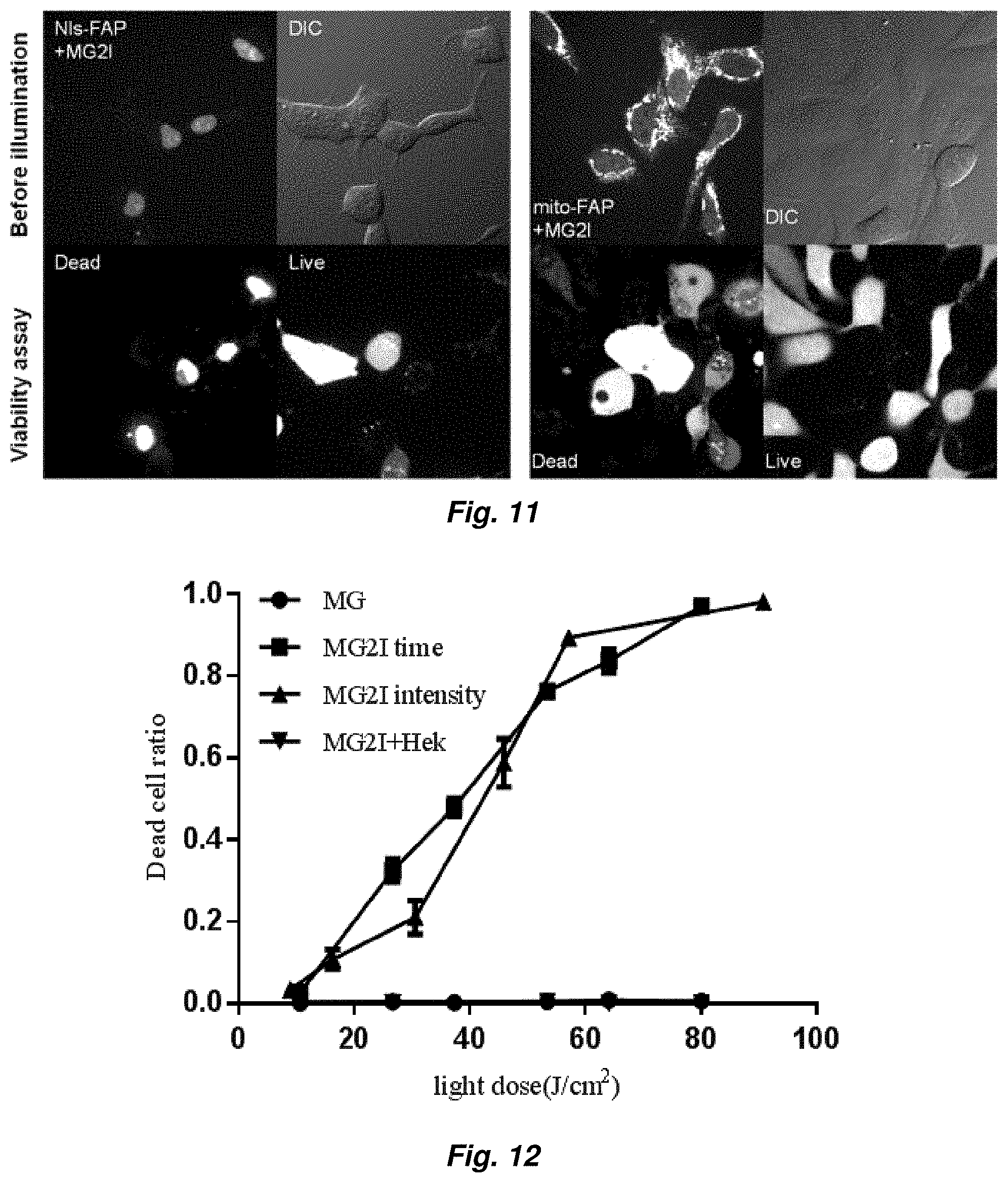 Properties of FAP-Fluorogen λAbs (nm) λex λem KD ε Fluorogen (Fluorogen) (nm) (nm) (pM) (104M−1cm−1) ΦF ΦΔ MG 606 633 668 5 10.3(9.18) 0.123 <0.005 MG2I 628 666 693 73 10.1(9.02) 0.037 0.13 Two-Component FAP Photosensitizer (AffiFAP) Construction and Expression