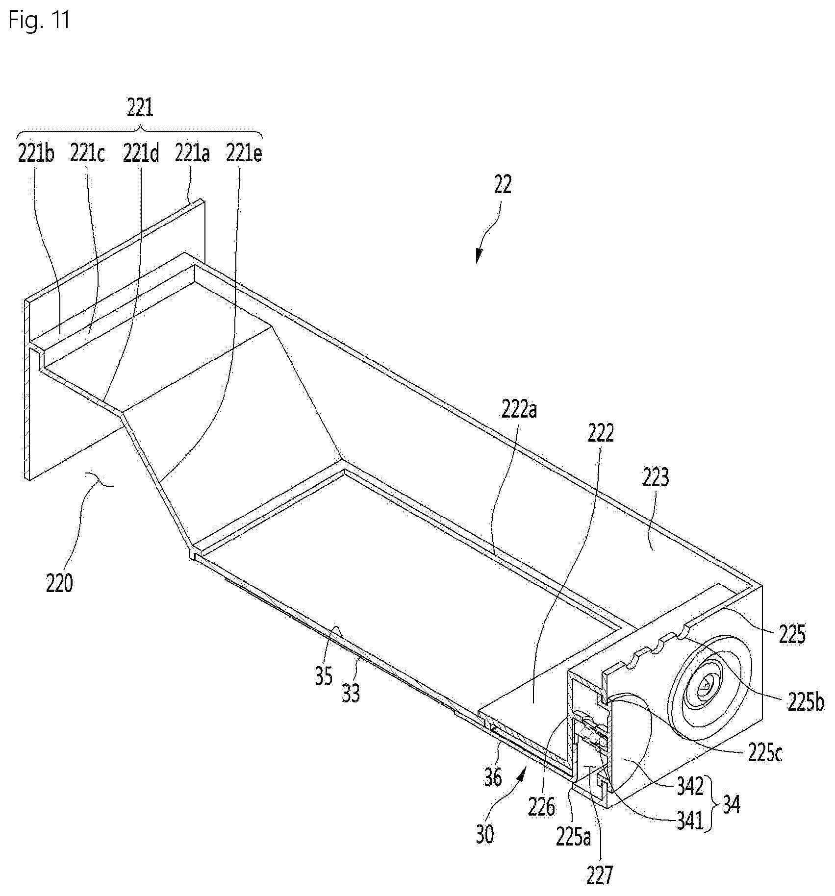 In detail, the case 22 includes a front portion 221, a left side portion 223 and a right side portion 224 extending vertically from the left and right ends of the front portion 221, a bottom portion 222 extending horizontally from the lower end of the front portion 221 to the rear side, and a rear portion 225 connecting the rear ends of the bottom portion 222, the left side portion 223, and the right side portion 224. The upper surface of the case 22 is opened.