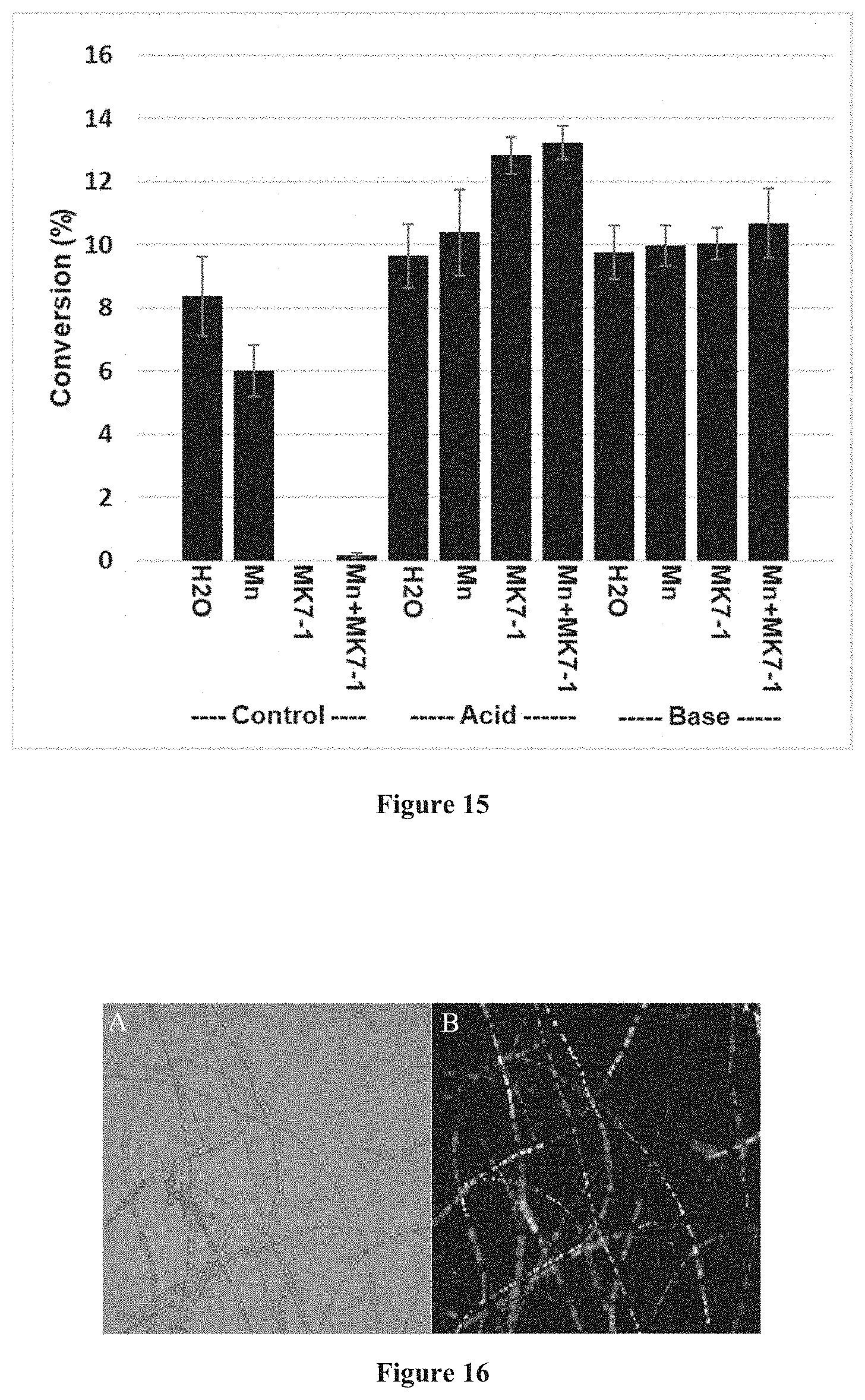g/L NH4NO3 5.25 Urea 1.75 KH2PO4 5.0 CaCl2 1.0 MgSO4•7 H2O 1.0 Micronutrients mg/L FeSO4•7 H2O 2.50 Zn SO4•7 H2O 1.10 MnCl2•4 H2O 0.25 CoCl2•6 H2O 0.08 Cu SO4•5 H2O 0.08 (NH4)6Mo7O24•4 H2O 0.06 H3BO3 0.06 EDTA, free acid 19.63 Example 21: Strain MK7 Cultivation on Municipal Organic Waste Surrogate (Grass Clippings and Leaves as a Function of Pretreatment)
