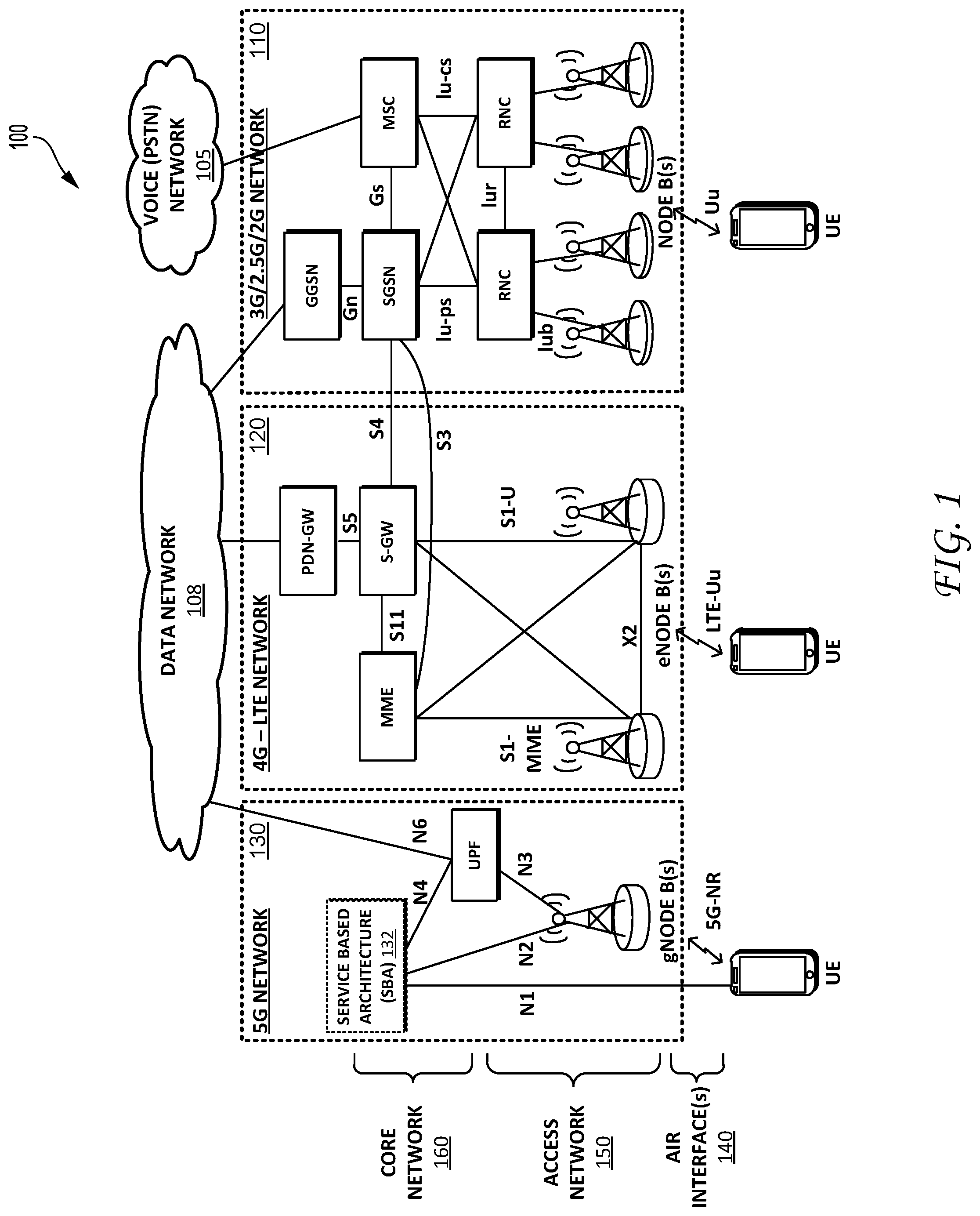 FIG. 1 illustrates a block diagram of an example telecommunications networks, including a 3G network, a 4G network, and a 5G network.
