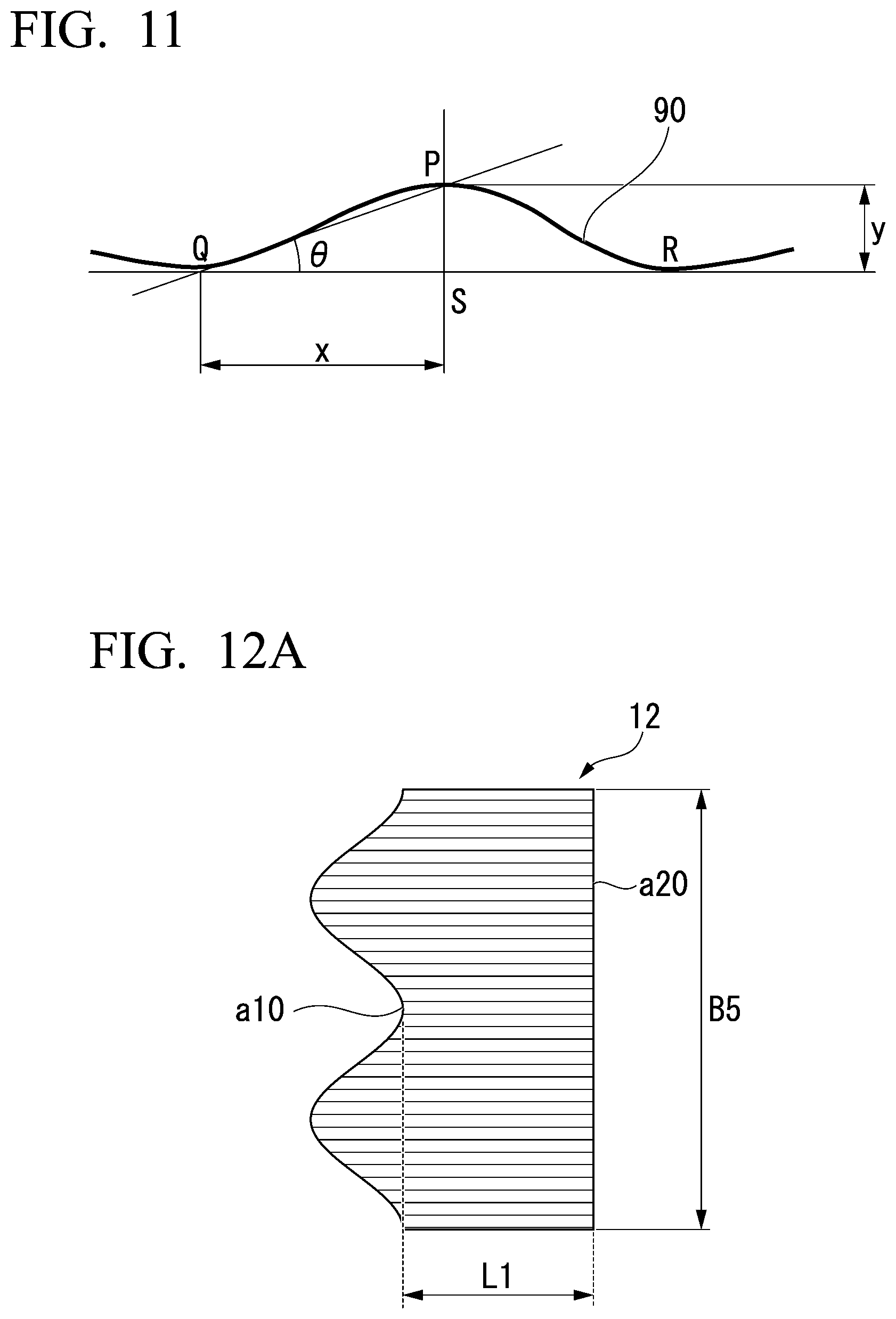 Procedure (1): As shown in FIG. 12A, the prepreg sheet (A) was cut into a sine wave shape in which one side of a rectangle in a plan view was as shown in FIG. 16 to obtain a prepreg sheet (A13). The position of the bottom of a sine wave side a10 in the prepreg sheet (A13) corresponded to the middle point on a side a20 that faced the side a10. The distance L1 between the bottom of the side a10 and the side a20 was 90 mm, the length B5 of the side a2 was 180 mm, and the sine wave of the side a10 was shown in the formula “W=12.5 mm and T=90 mm when height (H)=width (W)sin 2π/period (T)” in FIG. 16. In addition, the fiber direction of reinforcing fibers was at 90° with respect to the length direction of the side a20.