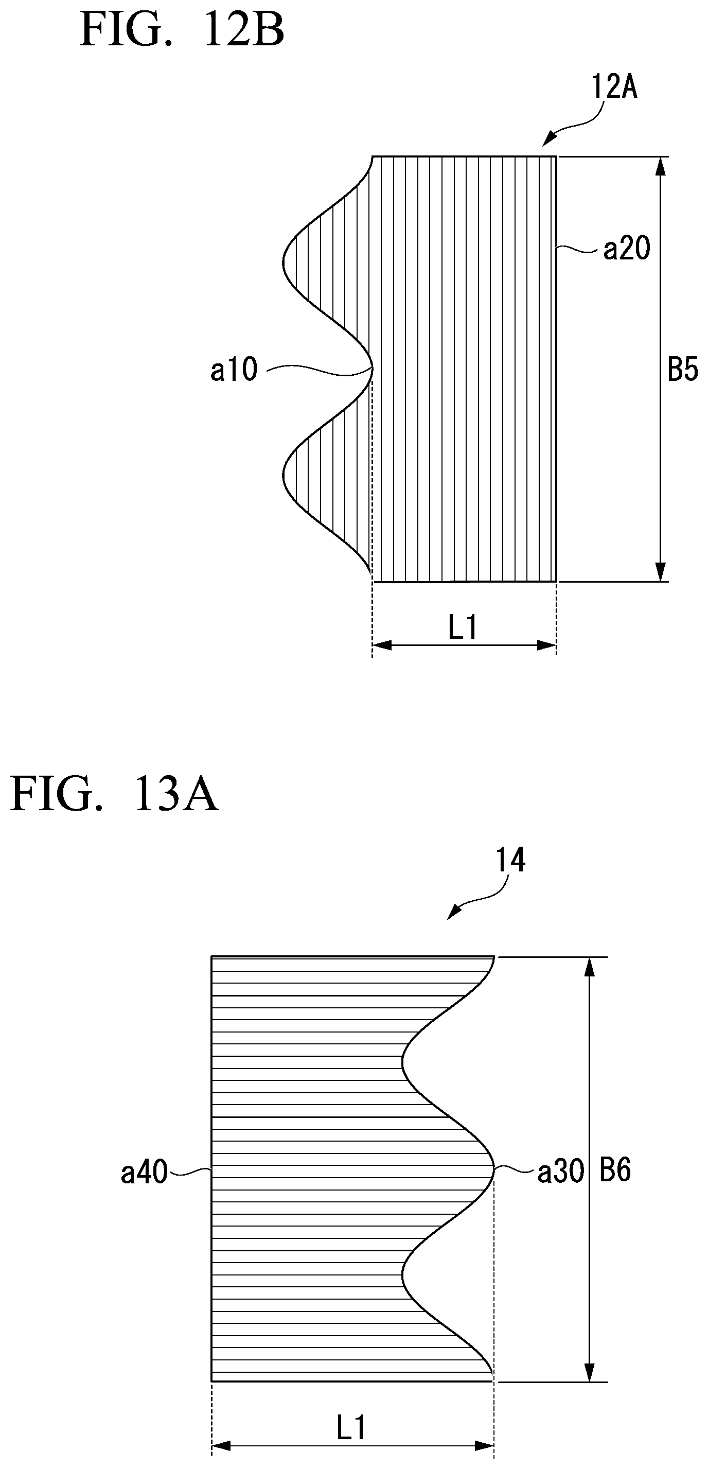 Procedure (2): As shown in FIG. 12B, a prepreg sheet (A14) was obtained by performing cutting in the same manner as in the procedure (1) except that the fiber direction of reinforcing fibers was at 0° with respect to the length direction of the side a20.