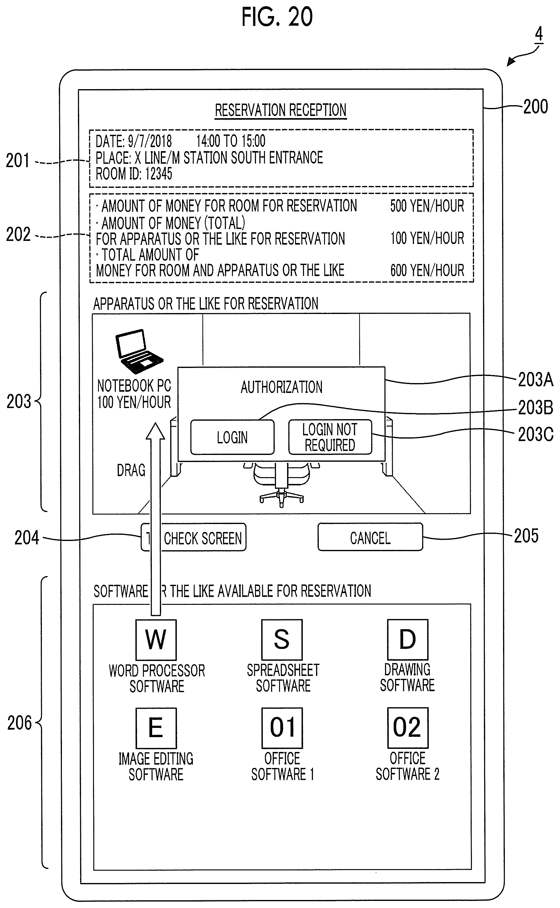 A display field 208 in which the display field 201 showing information related to the space 3 (refer to FIG. 1) as the reservation target is combined with the display field 202 showing the cost of the reservation is arranged in FIG. 55.