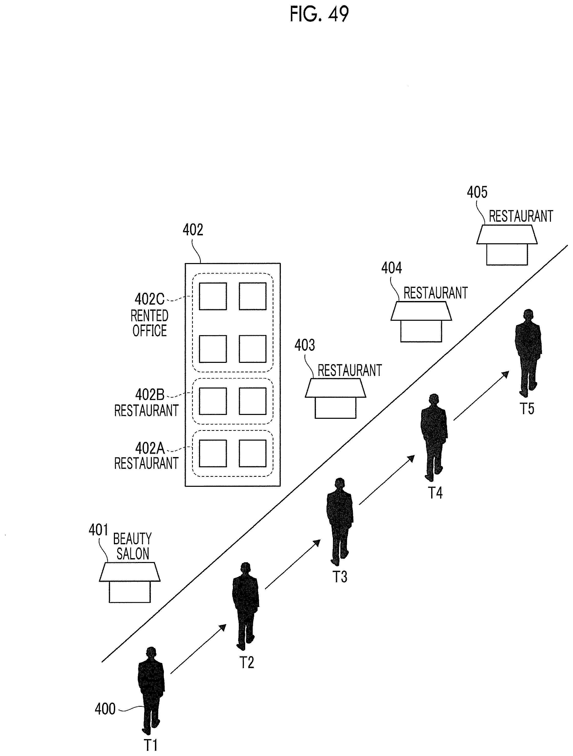In FIG. 51, a mark 411 of “available reservation” that is not present in the real space is added to an image in which the ABC beauty salon 401 is the subject. This technology may use a technology called augmented reality. This display can be made using location type augmented reality or markerless type augmented reality.