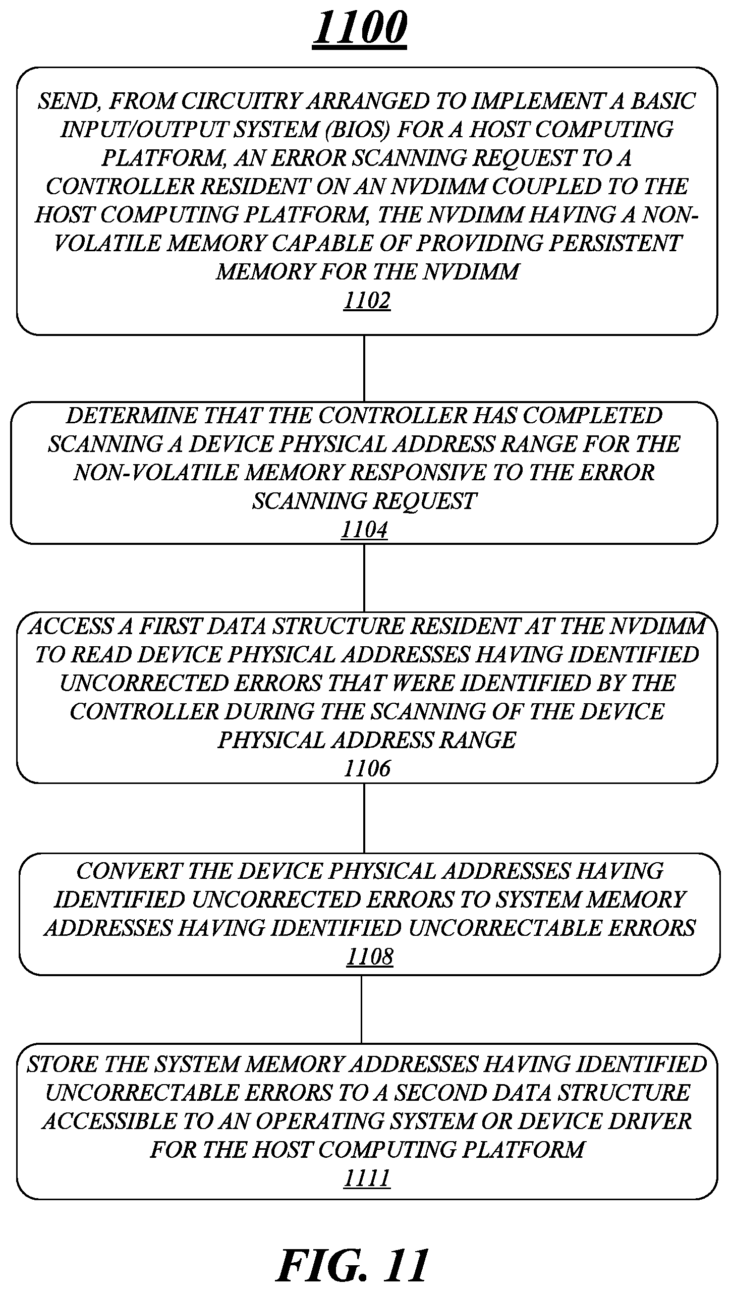 This application is a continuation of U.S. patent application Ser. No. 15/687,957, filed on Aug. 28, 2017, now U.S. Pat. No. 10,417,070, and entitled “TECHNIQUES FOR HANDLING ERRORS IN PERSISTENT MEMORY”, which is a continuation of U.S. patent application Ser. No. 14/319,387, filed on Jun. 30, 2014, now U.S. Pat. No. 9,753,793, and entitled “TECHNIQUES FOR HANDLING ERRORS IN PERSISTENT MEMORY”. The entire specifications of which are hereby incorporated herein by reference in their entirety. Examples described herein are generally related to handling errors for persistent memory in a non-volatile dual in-line memory module (NVDIMM). Memory modules coupled with computing platforms or systems such as those configured as a server may include dual in-line memory modules (DIMMs). DIMMs may include types of volatile memory such dynamic random access memory (DRAM) or other types of memory such as non-volatile memory. As DRAM and other types of memory technologies have advanced to include memory cells having higher and higher densities, memory capacities for DIMMs have also substantially increased. Since DRAM is a volatile memory, power failures or resets may result in loss of most if not all data maintained in DRAM at the time of power failure or reset. Also, some non-volatile memory technologies may utilize encryption schemes that may result in a loss of encryption information following a power failure or reset and thus non-volatile memory for these technologies may function as a sort of volatile memory since encrypted data may be inaccessible due to the loss of encryption information. Further, large memory capacities for these types of memory technologies present a challenge for an operating system (OS) or an application (e.g., device driver) to sense a power failure and attempt to prevent or reduce data loss. In some examples, in order to mitigate or reduce data loss in the event of a power failure or reset, a type of memory module that includes both volatile memory and non-volatile memory has been developed. This type of memory module is commonly referred to as a non-volatile DIMM (NVDIMM). Typically, NVDIMMs may be a combination of DRAM and a type of non-volatile memory such as NAND flash memory or may be a combination of DRAM and a type of non-volatile memory technology such as 3-D cross-point memory that may function as both volatile and non-volatile memory. NVDIMMs may provide persistent memory via use of non-volatile memory by capturing images (e.g., check pointing) of volatile memory content following a cutoff of power to the NVDIMM due to an intentional or unintentional system or component/device reset. A super-capacitor package may be coupled with an NVDIMM to maintain power to the NVDIMM for long enough to capture images of the volatile memory content to the non-volatile memory. According to some examples, an NVDIMM including non-volatile memory to provide persistent memory for types of memory at the NVDIMM such as DRAM or some types of non-volatile memory (e.g., 3-D cross-point memory) may have uncorrected errors in volatile memory that are generally not recoverable. However, these uncorrected errors may vanish on reboot or reset of the NVDIMM either because the error was due to a data error or a basic input/out system (BIOS) for a computing platform coupled with the NVDIMM may cause memory addresses deemed as error prone to be mapped out of system memory. However, uncorrected errors for non-volatile memory used as persistent memory may not vanish on reboot or reset. BIOS may not be able to clean these uncorrected errors because data loss may occur. As a result, uncorrected errors in the non-volatile memory used as persistent memory may have a potential to cause a “groundhog day” scenario that may result in a system at a computing platform continuing to fail on access to non-volatile memory address locations having uncorrected errors. Software such as an operating system (OS) or device driver needs a priori knowledge of uncorrected errors in the non-volatile memory used as persistent memory so a decision can be made to not map or access persistent memory address locations having uncorrected errors. In some examples, the OS or device driver for a computing platform coupled to the NVDIMM may not have access to device physical addresses (DPAs) since these addresses remain within the NVDIMM and are not exposed to the OS or device driver. Also, system physical addresses (SPAs) may incorporate multiple NVDIMMs and/or interleaved NVDIMMS while DPAs are device specific. Therefore, identified uncorrected errors having DPAs need to be converted to SPAs so that the OS or device driver can decide not to map or access persistent memory address locations having uncorrected errors. It is with respect to these and other challenges that the examples described herein are needed. Techniques for handling errors in persistent memory included in an NVDIMM may be implemented via one or more example methods. A first example method may include a controller resident on an NVDIMM receiving an error scanning request. Responsive to the error scanning request, a DPA range for a non-volatile memory at the NVDIMM capable of providing persistent memory for the NVDIMM may be scanned by the controller. Uncorrected errors may be identified in the DPA range and the DPA addresses having the identified uncorrected errors may be indicated to a BIOS for a computing platform coupled with the NVDIMM. A second example may include a BIOS arranged to be implemented by circuitry at a host computing platform. The BIOS may send an error scanning request to a controller resident on an NVDIMM coupled to the host computing platform. The NVDIMM may have a non-volatile memory capable of providing persistent memory for the NVDIMM. For this second example method, the BIOS may be capable of determining that the controller has completed scanning a DPA range for the non-volatile memory responsive to the error scanning request a