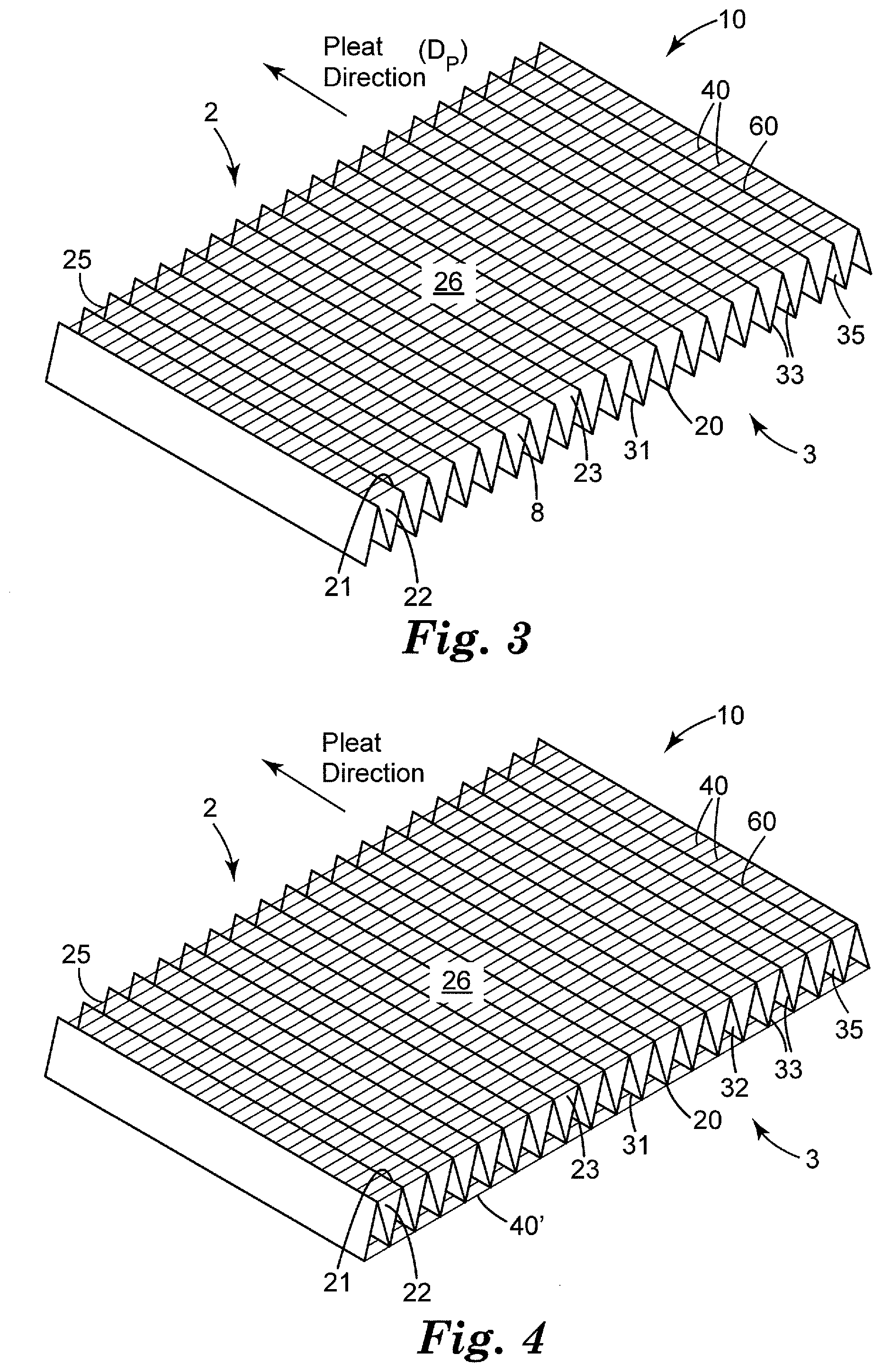 FIG. 3 is a perspective view of an exemplary air filter media comprising a pleated fibrous filtration web.
