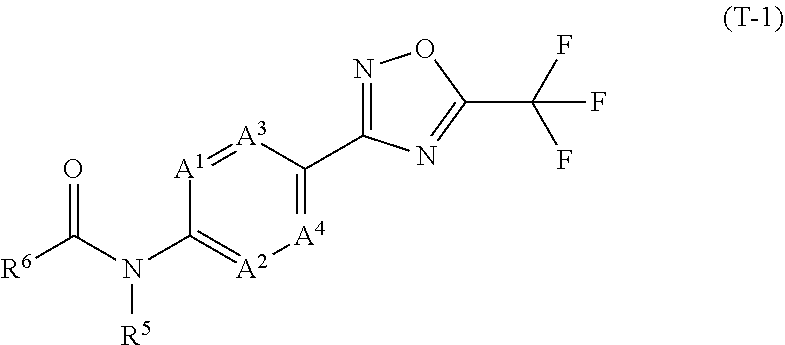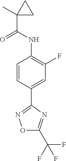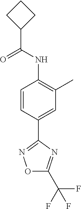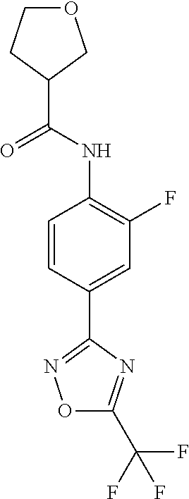 Melting point (mp) data and/or retention times (RT) for compounds according to Formula (I): RT [M + H] mp Entry Compound name Structure (mins) (measured) Method (° C.) 1.1 N-[2-methyl-4-[5- (trifluoromethyl)-1,2,4- oxadiazol-3- yl]phenyl]cyclopropane carboxamide 185-196 1.2 N-[2-methyl-4-[5- (trifluoromethyl)-1,2,4- oxadiazol-3- yl]phenyl]benzamide 173-176 1.3 N-[2-fluoro-4-[5- (trifluoromethyl)-1,2,4- oxadiazol-3- yl]phenyl]cyclopropane carboxamide 160-162 1.4 N-[2-fluoro-4-[5- (trifluoromethyl)-1,2,4- oxadiazol-3- yl]phenyl]benzamide 166-175 1.5 2,2-difluoro-N-[2-fluoro- 4-[5-(trifluoromethyl)- 1,2,4-oxadiazol-3- yl]phenyl]cyclopropane carboxamide 1.66 352.1 B 1.6 2-chloro-N-[2-fluoro-4- [5-(trifluoromethyl)- 1,2,4-oxadiazol-3- yl]phenyl]benzamide 1.84 386.1 B 1.7 N-[2-fluoro-4-[5- (trifluoromethyl)-1,2,4- oxadiazol-3-yl] phenyl]tetrahydrofuran- 3-carboxamide 1.48 346.1 B 1.8 N-[2-fluoro-4-[5- (trifluoromethyl)-1,2,4- oxadiazol-3-yl]phenyl] cyclobutanecarboxamide 1.75 330.1 B 1.9 N-[2-fluoro-4-[5- (trifluoromethyl)-1,2,4- oxadiazol-3-yl]phenyl]- 2-methyl- cyclopropanecarboxamide 1.75 330.1 B 1.10 N-[2-fluoro-4-[5- (trifluoromethyl)-1,2,4- oxadiazol-3-yl]phenyl]- 1-methyl- cyclopropanecarboxamide 1.77 330.1 B 1.11 N-[2-fluoro-4-[5- (trifluoromethyl)-1,2,4- oxadiazol-3-yl] phenyl]tetrahydrofuran- 2-carboxamide 1.70 346.1 B 1.12 1-cyano-N-[2-fluoro-4- [5-(trifluoromethyl)- 1,2,4-oxadiazol-3- yl]phenyl]cyclopropane carboxamide 1.66 341.2 B 1.13 2-cyclopropyl-N-[2- fluoro-4-[5- (trifluoromethyl)-1,2,4- oxadiazol-3- yl]phenyl]acetamide 1.70 330.1 B 1.14 2,2-difluoro-N-[2- methyl-4-[5- (trifluoromethyl)-1,2,4- oxadiazol-3-yl]phenyl] cyclopropanecarboxamide 1.64 348.1 B 1.15 2-chloro-N-[2-methyl-4- [5-(trifluoromethyl)- 1,2,4-oxadiazol-3- yl]phenyl]benzamide 1.80 382.1 B 1.16 N-[2-methyl-4-[5- (trifluoromethyl)-1,2,4- oxadiazol-3-yl] phenyl]tetrahydrofuran- 3-carboxamide 1.44 342.1 B 1.17 N-[2-methyl-4-[5- (trifluoromethyl)-1,2,4- oxadiazol-3-yl]phenyl] cyclobutanecarboxamide 1.69 326.2 B 1.18 2-methyl-N-[2-methyl- 4-[5-(trifluoromethyl)- 1,2,4-oxadiazol-3- yl]phenyl]cyclopropane carboxamide 1.70 326.2 B 1.19 1-methyl-N-[2-methyl- 4-[5-(trifluoromethyl)- 1,2,4-oxadiazol-3- yl]phenyl]cyclopropane carboxamide 1.70 326.2 B 1.20 N-[2-methyl-4-[5- (trifluoromethyl)-1,2,4- oxadiazol-3-yl] phenyl]tetrahydrofuran- 2-carboxamide 1.64 342.1 B 1.21 2-cyclopropyl-N-[2- methyl-4-[5- (trifluoromethyl)-1,2,4- oxadiazol-3- yl]phenyl]acetamide 1.65 326.2 B BIOLOGICAL EXAMPLES