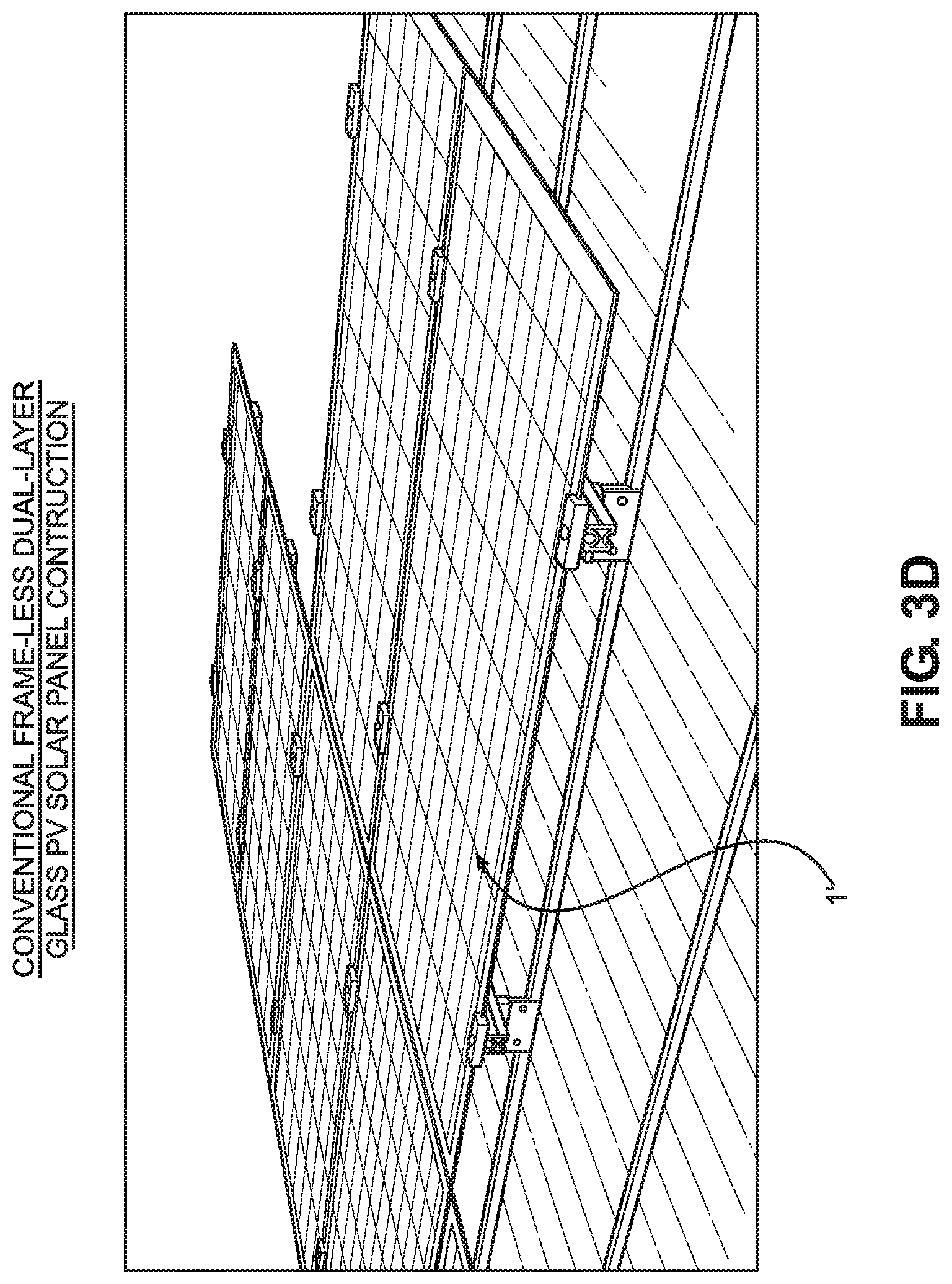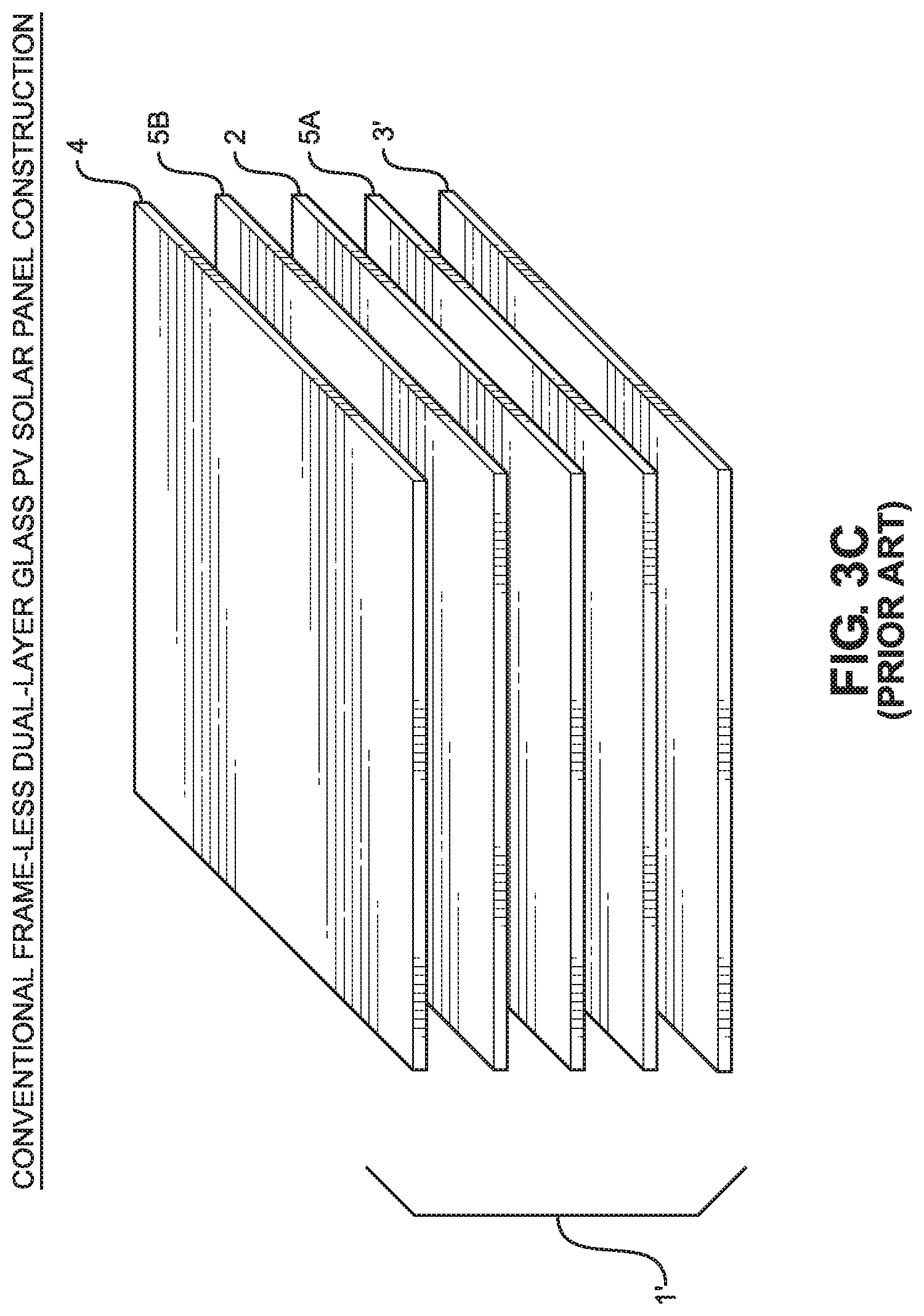 FIGS. 3A, 3B and 1C shows a conventional frame-less solar panel construction 1′, in which an array of photo-voltaic (PV) cell modules 2 are electrically connected together and laminated between (i) a glass substrate 3 or back support sheet (e.g. Econolite® material), and (ii) an optically transparent top glass panel 4 using an EVA-type adhesive layers 5A and 5B.