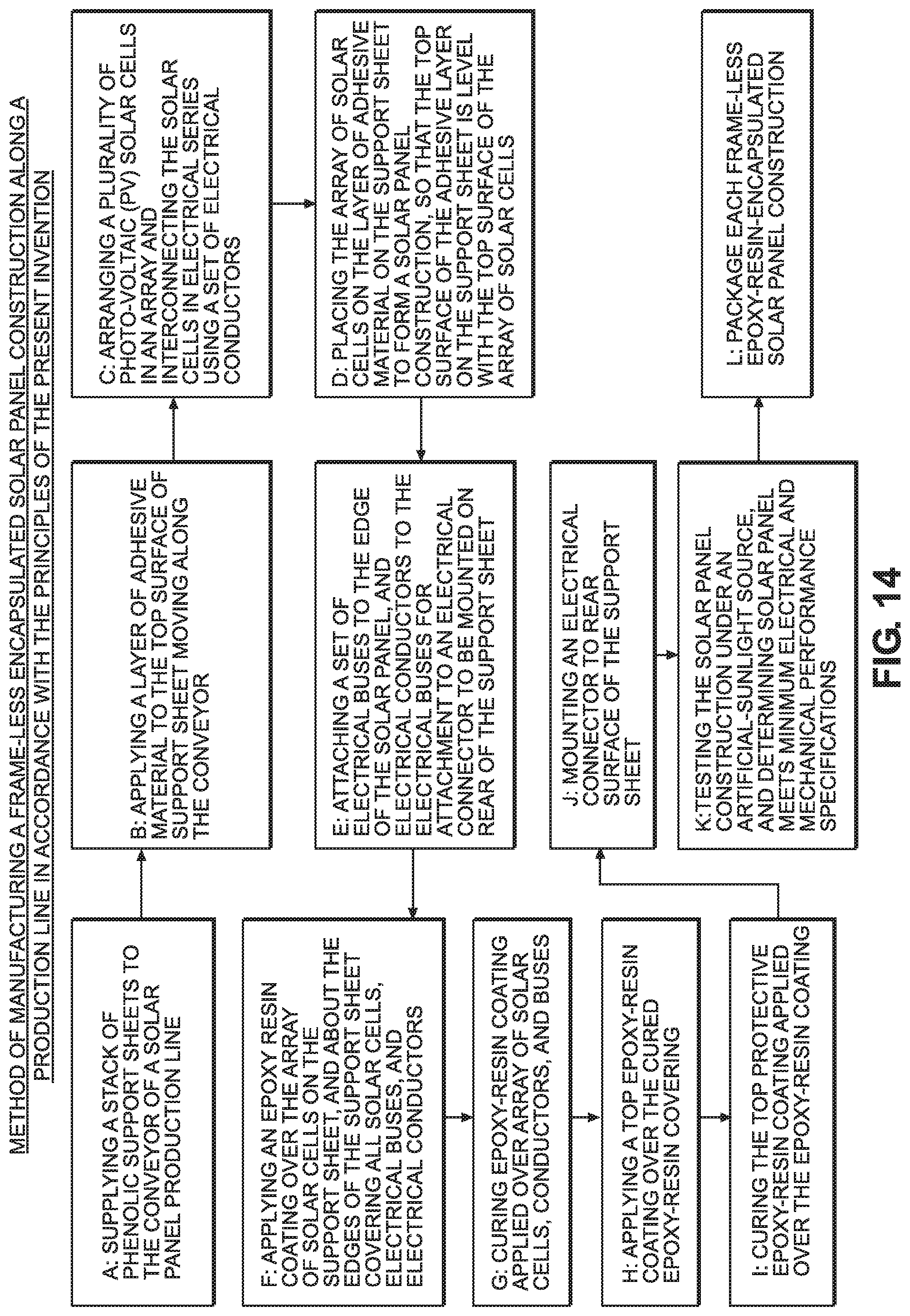 FIG. 14 describes the primary steps carried out during the process of manufacturing the frame-less epoxy-resin encapsulated solar panel 10 of the present invention, using the production line modeled in FIGS. 12 and 13. As shown, the method comprises: (a) supplying a stack of phenolic support sheets 15 to the conveyor transport system 27 of a solar panel production line; (b) applying a layer of adhesive material to the top surface of support sheet moving along the conveyor; (c) arranging a plurality of photo-voltaic (PV) solar cell modules in an array and interconnecting the solar cell modules in electrical series using a set of electrical conductors; (d) placing the array of solar cell modules on the layer of adhesive material on the support sheet to form a solar panel construction, so that the top surface of the adhesive layer on the support sheet is level with the top surface of the array of solar cell modules; (e) attaching a set of electrical buses 14 to the edge of the solar panel, and electrical conductors 13 to the electrical buses 14 for attachment to an electrical connector in the electrical junction box 19 to be mounted on rear of the support sheet 12; (f) applying an encapsulating epoxy-resin coating 17 over the array of solar cell modules on the support sheet, and about the edges of the support sheet covering all solar cell modules 12, electrical 13 and electrical conductors 14; (g) curing the epoxy resin coating 17 applied over the array of solar cell modules 12, electrical buses 13 and electrical conductors 14; (h) applying a top-protective epoxy-resin coating 18 over the applied and cured epoxy-resin coating 17; (i) curing the top-protective epoxy-resin coating 18 applied over the epoxy-resin coating 17; (j) mounting an electrical connector junction box 19 to rear surface of the support sheet 12; (k) testing the solar panel construction under an artificial-sun light source, and determining that solar panel meets its minimum electrical and mechanical performance specifications; and (l) package each frame-less epoxy-resin encapsulated solar panel 10 produced from the production line of the automated factory system 25.