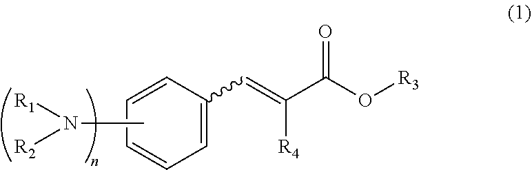 Patent Document 6 discloses an ultraviolet absorber containing a specific cinnamic acid derivative and salts thereof. It is disclosed that the ultraviolet absorber absorbs ultraviolet light in the long wavelength region (approximately 400 to 320 nm) of ultraviolet light and has applications for cosmetics in particular. There is no description in relation to the effect of suppressing the transmission of blue light of approximately 420 nm. In addition, it is not disclosed that it is possible to use the compound by addition to a plastic spectacle lens.