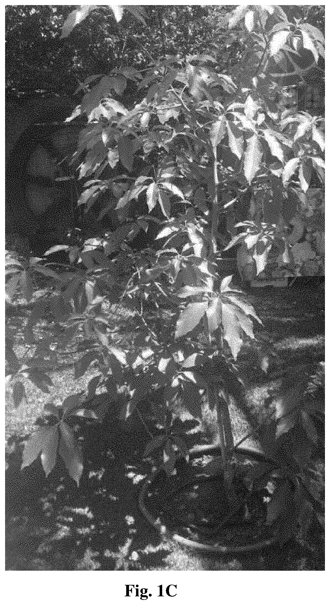 [0055]FIGS. 1A-C demonstrate the effect of fertilizing avocado tree infected with sooty mold and other parasites and pests with parts of Opuntia ficus-indica. FIG. 1A is a close-up on infected leaves of the avocado tree taken on Jul. 12, 2014. The photo in FIG. 1A shows the infected leaves turning yellow at their center and brownish at their margins due to the sticky layer of sooty mold that covered them and blocked sun rays from reaching the leaves and initiate photosynthesis. The photo in FIG. 1B was taken on Sep. 3, 2014 before spreading parts of Opuntia ficus-indica on the tree bed. Evidently, the leaves in FIG. 1B deteriorated further turning brown and crumbling, many of them falling off of the avocado tree and accumulating as dead leaves on the tree bed. A mixture of fresh parts of Opuntia ficus-indica including fresh skins fruits and grounded spiny stalks was then prepared and distributed on the tree bed in the vicinity of the stump and above its roots. The soil in the plant bed was turned over together with the mixture and watered. The photo in FIG. 1C was taken on May 1, 2015 after regular fertilization of the avocado tree with the mixture spread over the period of time between Sep. 3, 2014 and May 1, 2015. The tree was watered regularly every time a quota of the mixture was distributed on the tree bed. This photo shows a healthy avocado tree with freshly grown wide, green leaves absent of any cover of white dust or any other symptoms suggesting the presence of parasites.