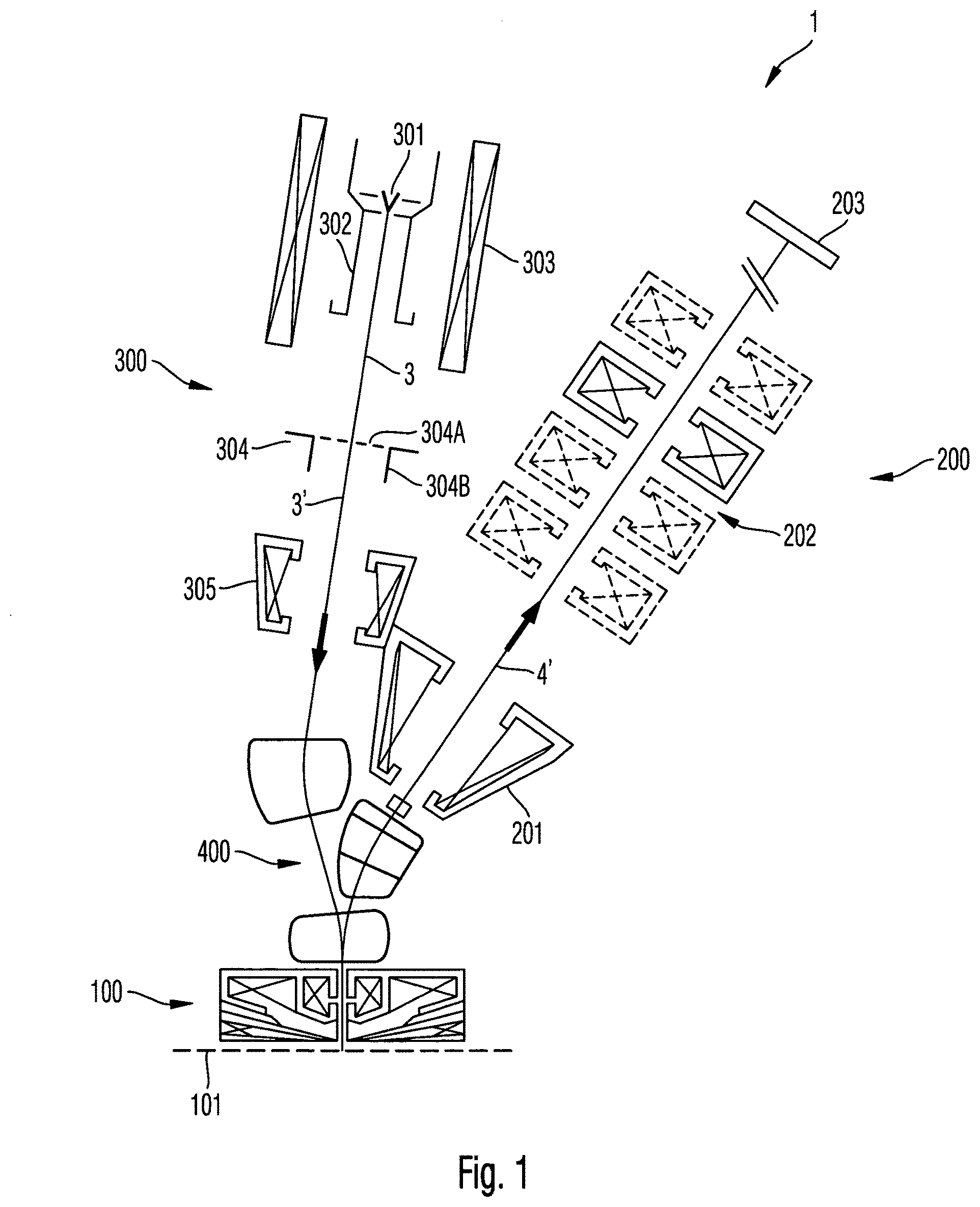 Deflection angle γ for the secondary electron beam path 4′ provided by field region 407 will change, accordingly. After leaving field region 407, the secondary electron beam path passes a drift region 409 which is substantially free of magnetic fields before entering a further magnetic field region 411 providing a homogeneous magnetic field deflecting the secondary electron beam path 4′ further to the right. Field strength of field region 411 may be adjusted by a controller 413. After leaving the field region 411, the secondary electron beam path immediately enters a further field region 415 providing a homogeneous magnetic field, a field strength of which may be also adjusted by controller 413. Controller 413 operates in dependence of a setting of the landing energy of primary electron beams and adjusts the magnetic field strength in field regions 411 and 415 such that the primary electron beam path leaves field region 415 at a pre-defined position and in a pre-defined direction which are independent of the landing energy of the primary electrons and the deflection angle γ, respectively. Thus, the two field regions 411, 415 perform a function of two subsequent beam deflectors which allows to adjust the secondary electron beam to coincide with the pre-defined secondary electron beam path 4′ when the same leaves magnetic field region 415.