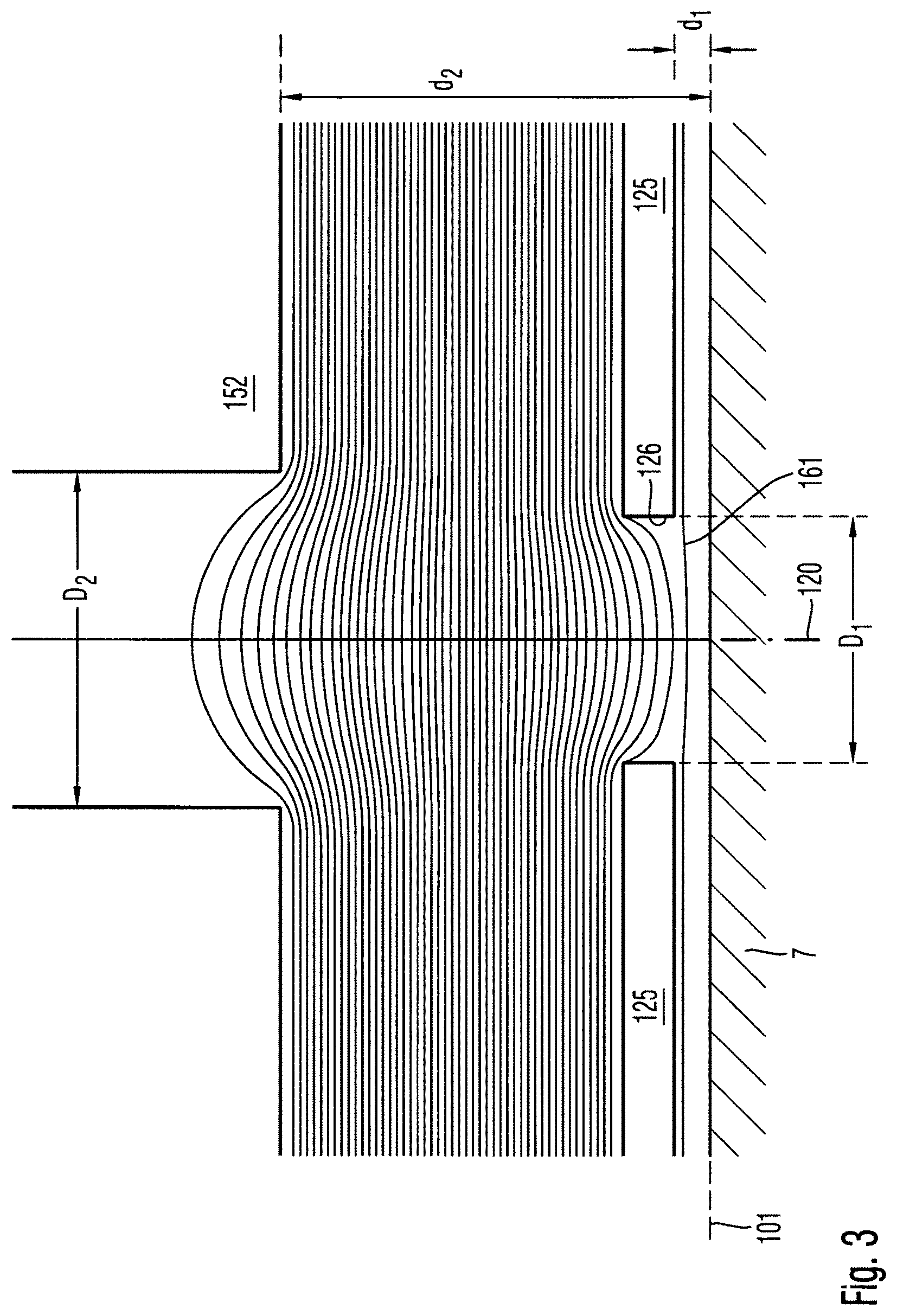 As illustrated in FIG. 3, a lower edge of second pole piece 125 is disposed, at its radial inner end 126, at a distance d1from the surface of object 7 which surface coincides with object plane 101. The lower end of beam tube 152 is disposed at a distance d2from the object plane 101. A diameter of the bore defined by radial inner end 126 of pole piece 125 is denoted D1and a diameter of the beam tube 152 at its lower end is denoted D2.