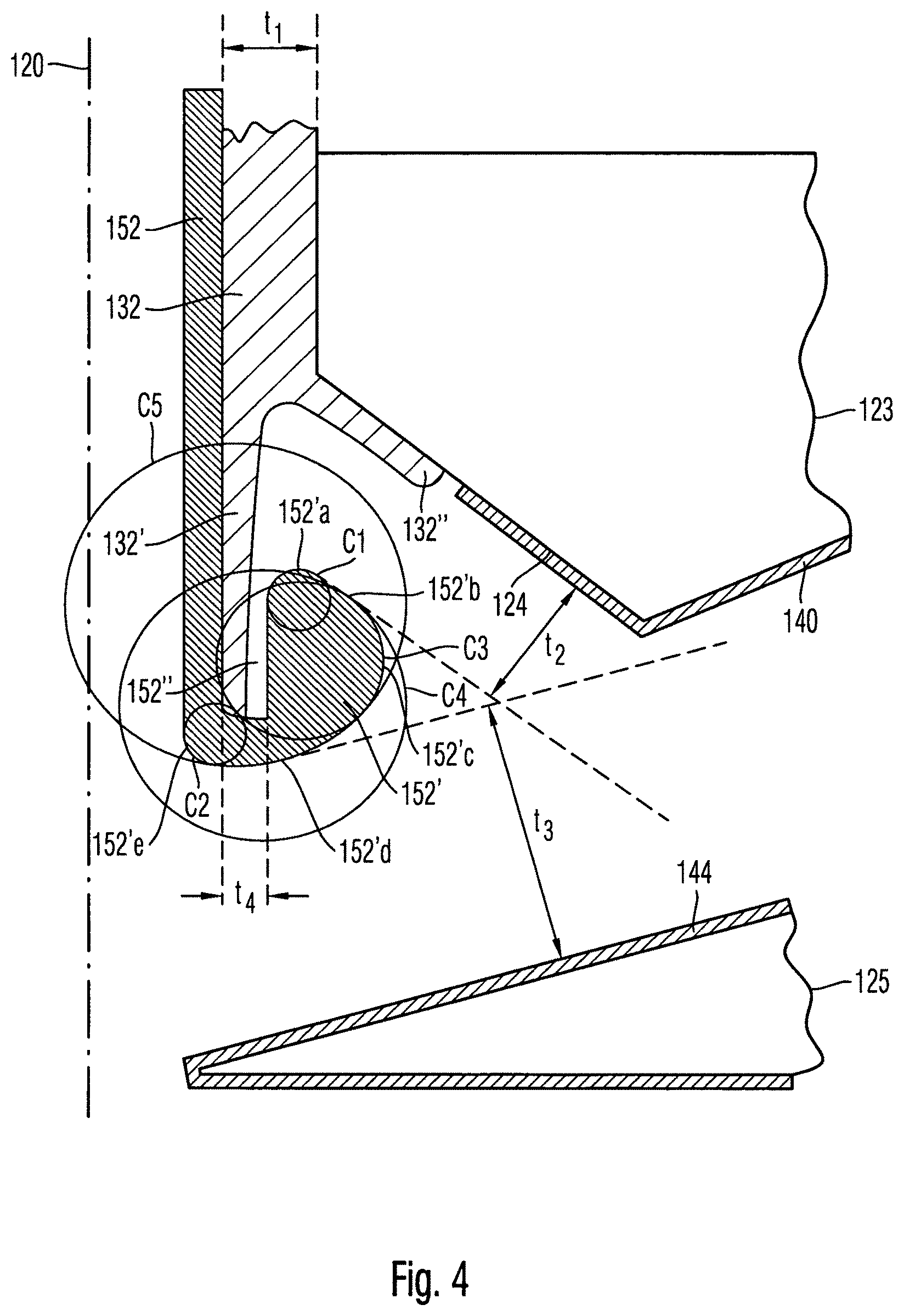 In FIG. 4, an exemplary embodiment of a shape of beam tube 152 and insulation 132 between the beam tube 152 and the first pole piece 123 is depicted. Beam tube 152 is, for the largest part, a straight pipe having a substantially constant wall thickness down to a lower end. Lower end of beam tube 152 is constituted by a part of beam tube 152, which is turned by about 180° in a direction of a radial outer side of beam tube 152. The lower end is formed into a rounded rim, leaving a gap 152″ between a radially outer side of the straight section of beam tube 152 and rounded rim 152′. Gap 152″ has a substantially rectangular shape and extends parallel to the wall of the straight part of beam tube 152. A width t4, i.e. a dimension in radial direction, of gap 152″ is about 2 mm. A cross-section of rim 152′ may be suitably described by means of radii of circles fitted to an outer surface of rim 152′, i.e. a surface facing away from the straight part of beam tube 152. On an uppermost part 152a of rim 152′, i.e. a part farthest away from the object plane 101, the surface profile of rim 152′ may be described by a radius of circle C1, which radius is about 1.2 mm, an adjacent part 152b described by a radius of circle C4, which is about 11 mm, further adjacent part 152c by a radius of circle C3, which radius is about 3 mm, a radially outer lower end 152d of rim 152′ by a radius of circle C5, which radius is about 6 mm, and a radially inner lower end 152e of rim 152′ by a radius of circle C2, which radius is about 1.2 mm. The uppermost part 152a of rim 152′ is spaced a distance t2of about 5 mm apart from a radial inner end 124 of the first pole piece 123. The radially lower end 152d of rim 152′ is spaced a distance t3of about 10 mm apart from electrode 144 disposed on the second pole piece 125.