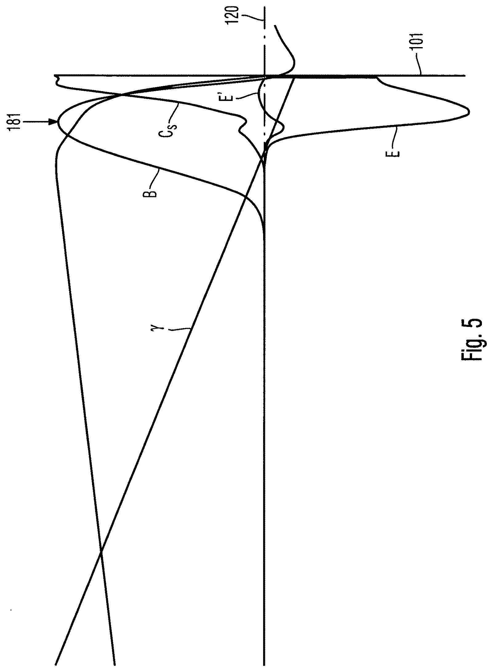 Line CSin FIG. 5 further indicates the dependency of the field curvature, and line E′ a dependency of the derivative of the electrical field strength E along the optical axis 120.