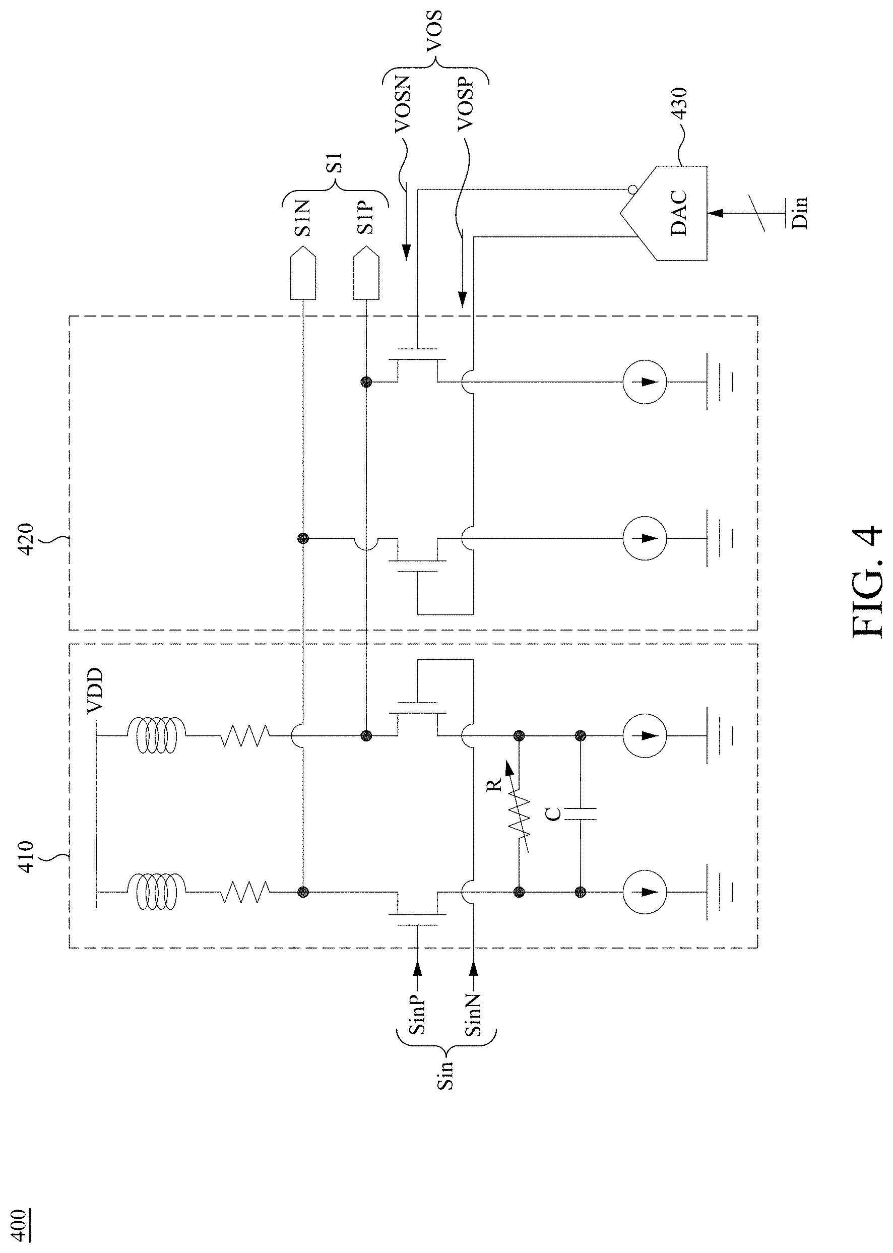 This application claims priority to U.S. Provisional Application Ser. No. 62/797,939, filed Jan. 28, 2019, which is herein incorporated by reference. Programmable integrated circuits (ICs) are usually provided to receive and/or transmit a high-speed digital data stream from along a data channel. At the end of a long serial data communication, such as in systems with serializer/de-serializer (“SERDES”) receivers, an incoming waveform may not look like the waveform that was sent from a data transmitting device. To compensate for these changes in the incoming waveform, equalization is normally applied to correct the received signal. Aspects of the present disclosure are best understood from the following detailed description when read with the accompanying figures. It is noted that, in accordance with the standard practice in the industry, various features are not drawn to scale. In fact, the dimensions of the various features may be arbitrarily increased or reduced for clarity of discussion. The following disclosure provides many different embodiments, or examples, for implementing different features of the provided subject matter. Specific examples of components and arrangements are described below to simplify the present disclosure. These are, of course, merely examples and are not intended to be limiting. For example, the formation of a first feature over or on a second feature in the description that follows may include embodiments in which the first and second features are formed in direct contact, and may also include embodiments in which additional features may be formed between the first and second features, such that the first and second features may not be in direct contact. In addition, the present disclosure may repeat reference numerals and/or letters in the various examples. This repetition is for the purpose of simplicity and clarity and does not in itself dictate a relationship between the various embodiments and/or configurations discussed. The terms used in this specification generally have their ordinary meanings in the art and in the specific context where each term is used. The use of examples in this specification, including examples of any terms discussed herein, is illustrative, and in no way limits the scope and meaning of the disclosure or of any exemplified term. Likewise, the present disclosure is not limited to various embodiments given in this specification. Although the terms “first,” “second,” etc., may be used herein to describe various elements, these elements should not be limited by these terms. These terms are used to distinguish one element from another. For example, a first element could be termed a second element, and, similarly, a second element could be termed a first element, without departing from the scope of the embodiments. As used herein, the term “and/or” includes any and all combinations of one or more of the associated listed items. In this document, the term “coupled” may also be termed as “electrically coupled”, and the term “connected” may be termed as “electrically connected”. “Coupled” and “connected” may also be used to indicate that two or more elements cooperate or interact with each other. Furthermore, spatially relative terms, such as “underlying,” “below,” “lower,” “overlying,” “upper” and the like, may be used throughout the description for ease of understanding to describe one element or feature's relationship to another element(s) or feature(s) as illustrated in the figures. The spatially relative terms are intended to encompass different orientations of the device in use or operation in addition to the orientation depicted in the figures. The structure may be otherwise oriented (e.g., rotated 90 degrees or at other orientations) and the spatially relative descriptors used herein may likewise be interpreted accordingly. For illustration in In some embodiments, the transmitter 110 is implemented by an integrated circuit (IC) arranged in a device. The receiver 120 is also implemented by an IC arranged in another device different from where the transmitter 110 is arranged. In various embodiments, the transmitter 110 and the receiver 120 are implemented by the same IC. In some embodiments, the channel 130 is implemented by a physical transmission line. In various embodiments, the channel 130 is implemented by medium, including at least one of air, water or metal, with or without physical structure for transmitting signal to the receiver 120. For illustration in In some embodiments, the power of the signal D2 is less than the power of the signal D1, which results from the loss of the channel 130 and is caused by the limited channel bandwidth. The channel bandwidth may be limited and reduced by several effects including, for example, skin effect, dielectric loss and impedance discontinuities between any two of material with different dielectric or size. The limited channel bandwidth may cause the signal delay in the following transmission. The delayed signal may overlap with the subsequent signal, which leads to the inter-symbol interference (ISI). In some embodiments, the signal D1 and the signal D2 are each implemented by a 2-level pulse-amplitude modulation (PAM-2) signal with one bit for each symbol. In some other embodiments, the signal D1 and the signal D2 are each implemented by a 4-level pulse-amplitude modulation (PAM-4) signal with two bits for each symbol, in order to have high signal transmission speed. If one symbol of the PAM-4 signals delays, two bits of such symbol may be error resulted from the ISI. In order to eliminate the ISI of the signal D2, and to reduce the difference between the signal D2 and the signal D1, equalization circuits are included in the receiver 120, which will be discussed below with reference to For illustration in The input terminals of the voltage shifting amplifier circuit 220 are connected to the input terminal 210, and the output