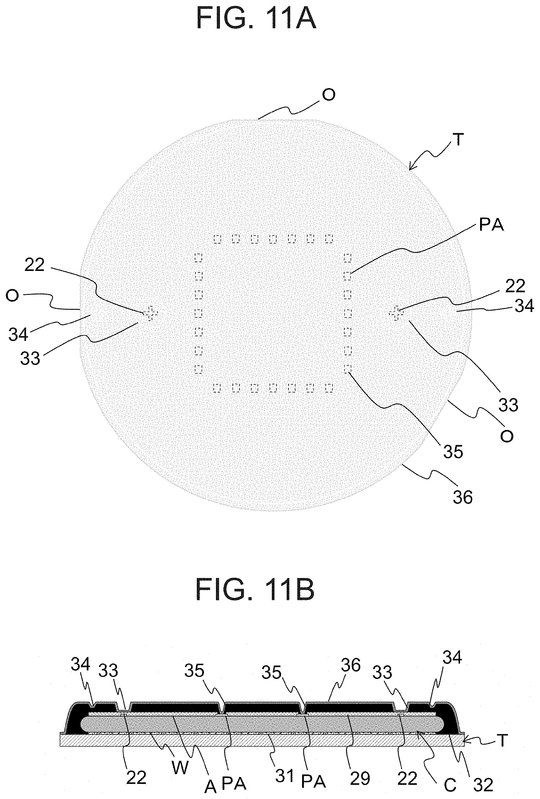a mounting step of mounting the plurality of wafers on the substrate by using the first alignment mark and the positioning portion of at least one of the plurality of wafers as benchmarks; a resin layer forming step of forming a resin layer on the plurality of wafers in a state where the positioning portion is exposed; a removing step of making the first alignment mark of at least one of the plurality of wafers visually recognizable by removing a part of the resin layer by using the positioning portion exposed from the resin layer as a benchmark; a mark forming step of forming a second alignment mark on the resin layer by using the first alignment mark as a benchmark; and a wiring pattern forming step of forming a wiring pattern to be conducted to the pad portion on the resin layer by using the second alignment mark as a benchmark. 7. A semiconductor package comprising: