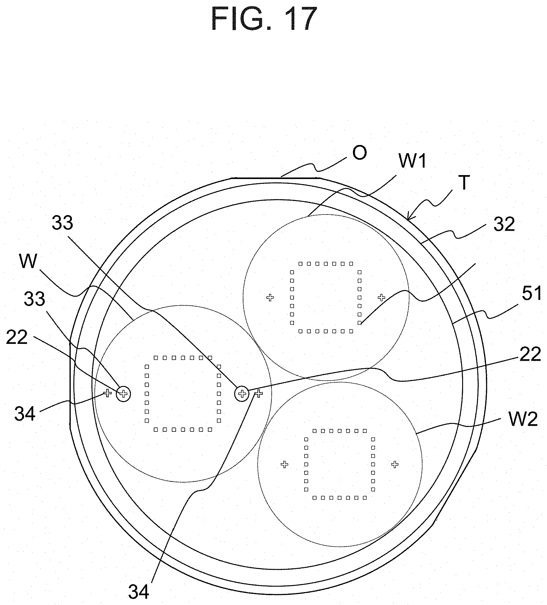 a base substrate including a pad portion; a first alignment mark formed on an upper surface of the base substrate; a plurality of wafers disposed on the base substrate; a substrate including a positioning portion for positioning provided on an outer edge thereof and the plurality of wafers packaged on an upper surface thereof, and having an outer shape larger than that of the base substrate; a resin layer formed on the plurality of wafers in a state in which the positioning portion is exposed and the first alignment mark of at least one of the plurality of wafers is visually recognizable; a second alignment mark formed on the resin layer; and a wiring pattern formed on the resin layer and electrically connected to the pad portion. 9. The method of manufacturing a semiconductor package according to the substrate has a disk shape, and the positioning portion is formed by cutting part of an outer periphery of the substrate along a straight line. 10. The method of manufacturing a semiconductor package according to the substrate has a disk shape, and the positioning portion is formed by cutting part of an outer periphery of the substrate along a straight line. 11. The method of manufacturing a semiconductor package according to the wafer has a disk shape having an outer diameter of 12.5 mm, and the substrate has a disk shape having an outer diameter of 13.5 mm. 12. The method of manufacturing a semiconductor package according to the wafer has a disk shape having an outer diameter of 12.5 mm, and the substrate has a disk shape having an outer diameter of 13.5 mm. 13. The method of manufacturing a semiconductor package according to the wafer has a disk shape having an outer diameter of 12.5 mm, and the substrate has a disk shape having an outer diameter of 13.5 mm. 14. The method of manufacturing a semiconductor package according to the wafer has a disk shape having an outer diameter of 12.5 mm, and the substrate has a disk shape having an outer diameter of 13.5 mm. 15. The method of manufacturing a semiconductor package according to the wafer has a disk shape having an outer diameter of 12.5 mm, and the substrate has a disk shape having an outer diameter of 13.5 mm.