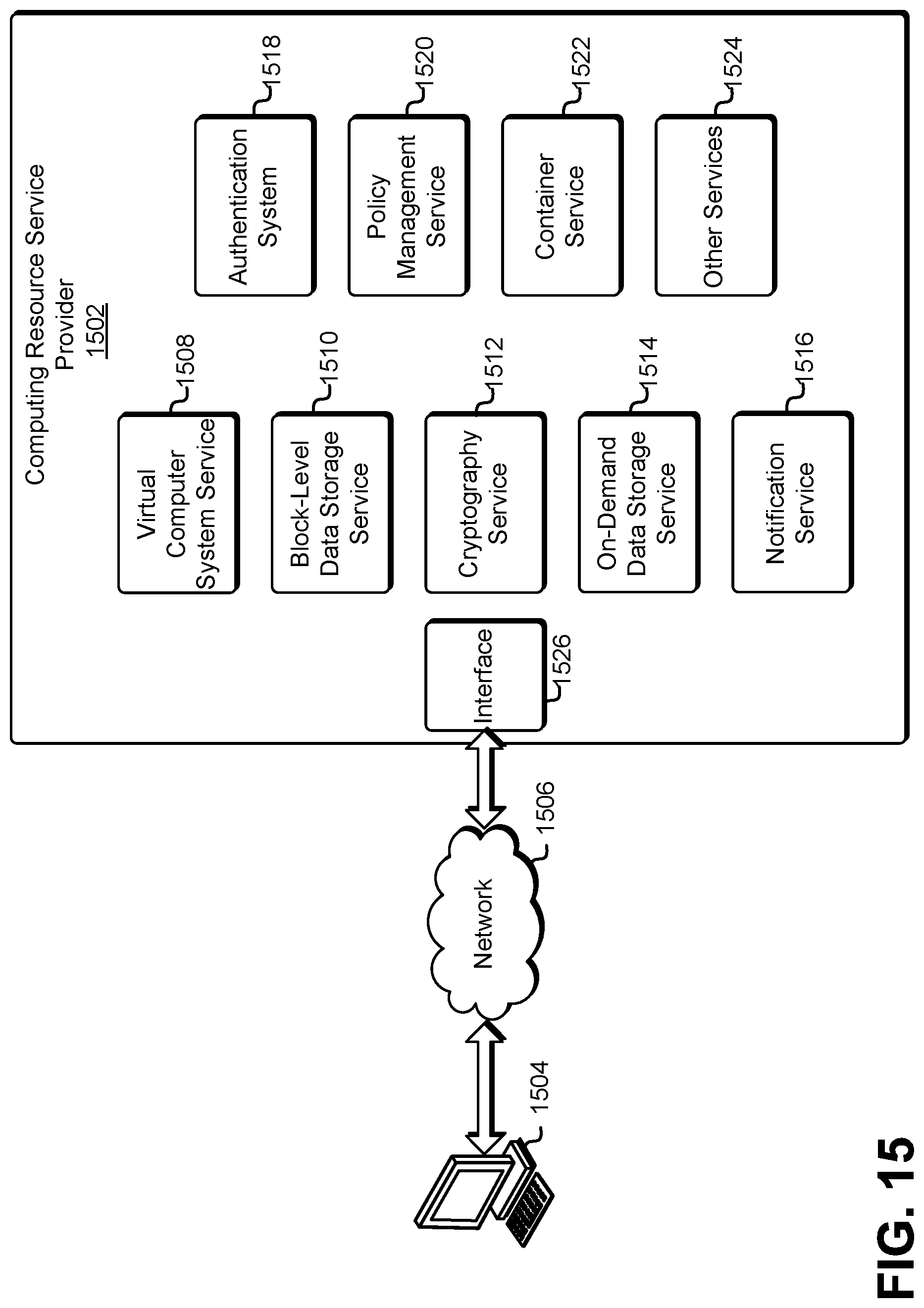 The computing resource service provider 1502 may provide various computing resource services to its customers. The services provided by the computing resource service provider 1502, in this example, include a virtual computer system service 1508, a block-level data storage service 1510, a cryptography service 1512, an on-demand data storage service 1514, a notification service 1516, an authentication system 1518, a policy management service 1520, a container service 1522 and one or more other services 1524. It is noted that not all embodiments described include the services 1508-24 described with reference to FIG. 15 and additional services may be provided in addition to or as an alternative to services explicitly described. As described, each of the services 1508-24 may include one or more web service interfaces that enable the customer 1504 to submit appropriately configured API calls to the various services through web service requests. In addition, each of the services may include one or more service interfaces that enable the services to access each other (e.g., to enable a virtual computer system of the virtual computer system service 1508 to store data in or retrieve data from the on-demand data storage service 1514 and/or to access one or more block-level data storage devices provided by the block-level data storage service 1510).