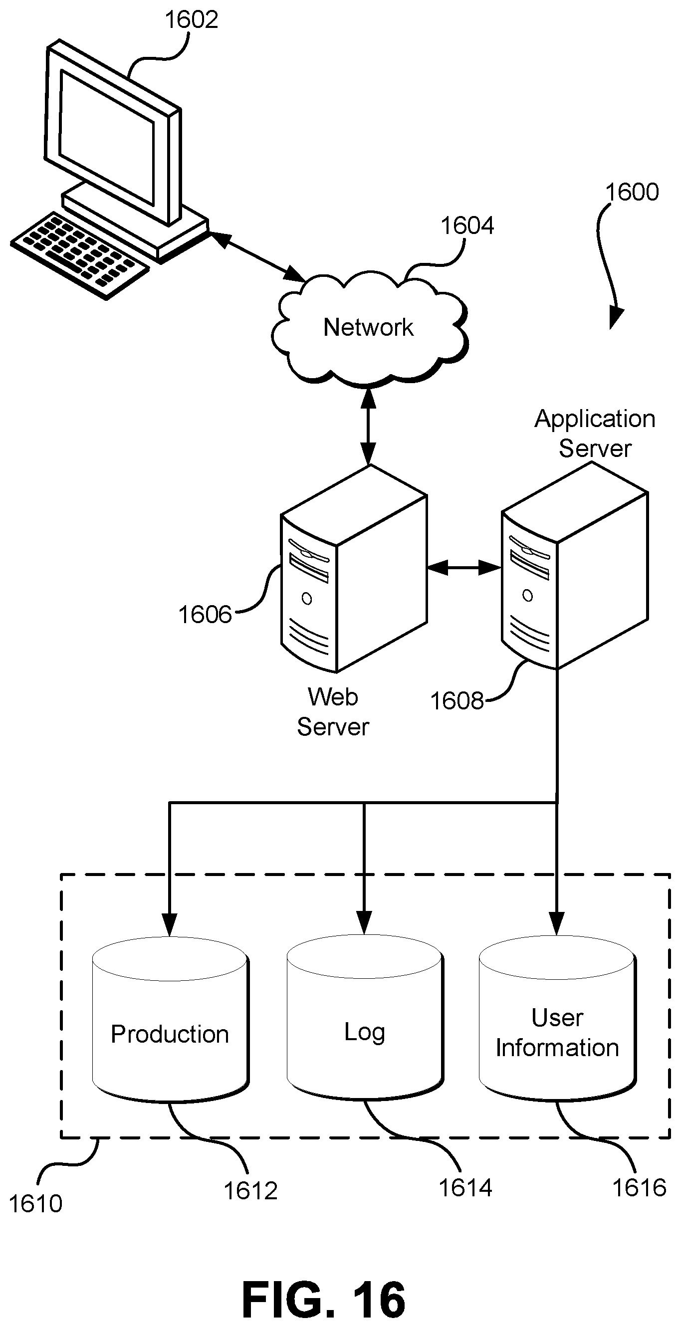FIG. 16 illustrates aspects of an example environment 1600 for implementing aspects in accordance with various embodiments. As will be appreciated, although a web-based environment is used for purposes of explanation, different environments may be used, as appropriate, to implement various embodiments. The environment includes an electronic client device 1602, which can include any appropriate device operable to send and/or receive requests, messages or information over an appropriate network 1604 and, in some embodiments, convey information back to a user of the device. Examples of such client devices include personal computers, cell phones, handheld messaging devices, laptop computers, tablet computers, set-top boxes, personal data assistants, embedded computer systems, electronic book readers, and the like. The network can include any appropriate network, including an intranet, the Internet, a cellular network, a local area network, a satellite network or any other network and/or combination thereof. Components used for such a system can depend at least in part upon the type of network and/or environment selected. Protocols and components for communicating via such a network are well known and will not be discussed in detail. Communication over the network can be enabled by wired or wireless connections and combinations thereof. In this example, the network includes the Internet, as the environment includes a web server 1606 for receiving requests and serving content in response thereto, although for other networks an alternative device serving a similar purpose could be used as would be apparent to one of ordinary skill in the art.