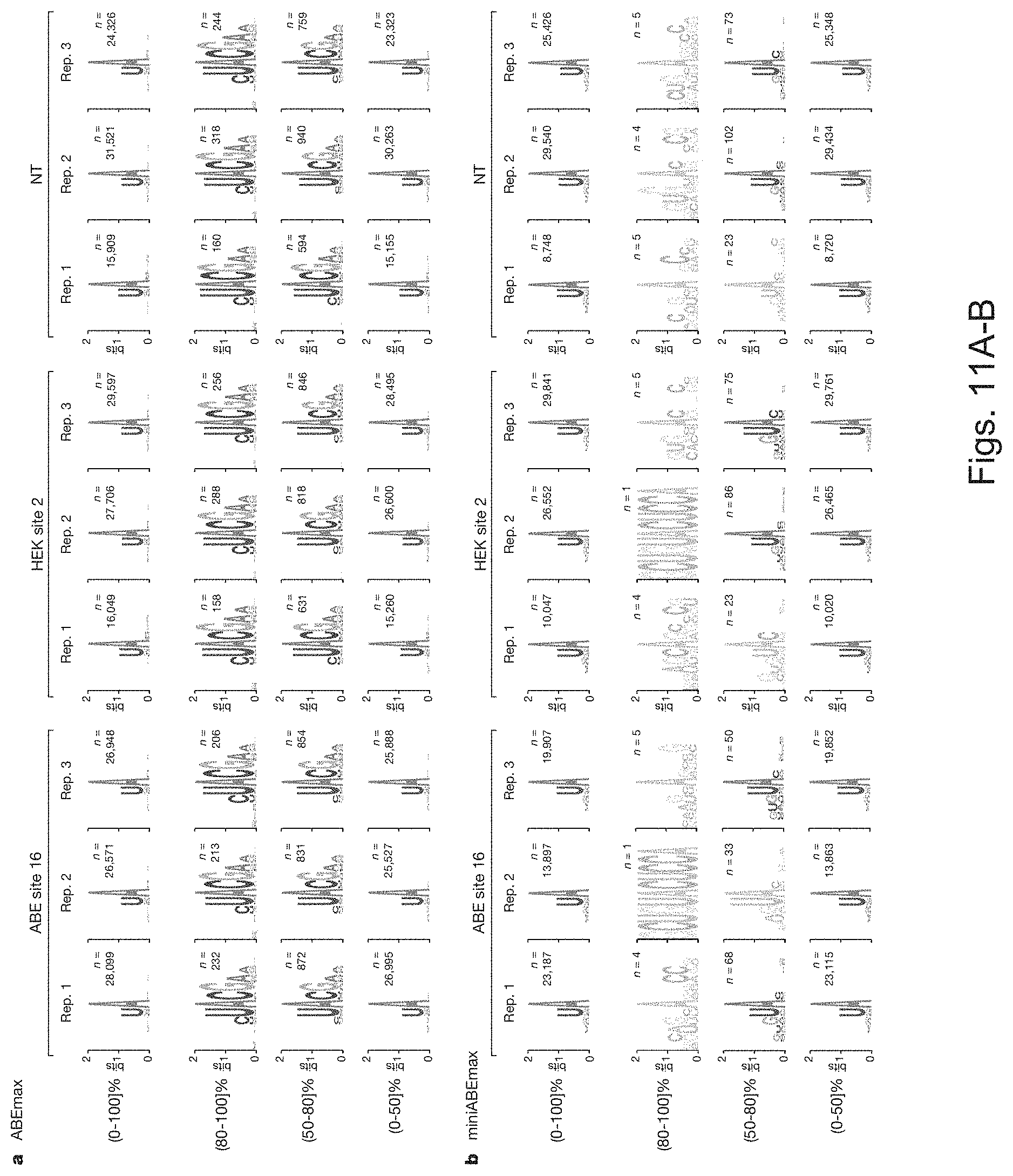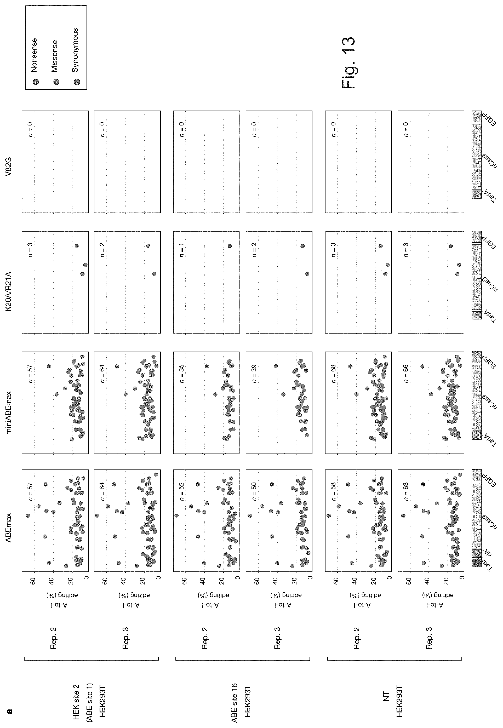 minABEmax ABE site 10 All GFP Rep. 1 — 43 1 44 Rep. 2 — 33 1 34 Rep. 3 — 39 1 40 minABEmax-K20A/R21A ABE site 10 All GFP Rep. 1 — 0 1 1 Rep. 2 — 0 1 1 Rep. 3 — 1 1 2 minABEmax-V82G ABE site 10 All GFP Rep. 1 — 0 0 0 Rep. 2 — 0 0 0 Rep. 3 — 0 0 0 HEK299T ABEmax HEK site 2 All GFP Rep. 1 — 30 0 030 Rep. 2 — 45 0 45 Rep. 3 — 47 0 47 minABEmax HEK site 2 All GFP Rep. 1 — 35 1 36 Rep. 2 — 57 1 59 Rep. 3 — 63 1 64 minABEmax-K20A/R21A HEK site 2 All GFP Rep. 1 — 0 1 1 Rep. 2 — 2 1 3 Rep. 3 — 1 1 2 minABEmax V82G HEK site 2 All GFP Rep. 1 — 0 0 0 Rep. 2 — 0 0 0 Rep. 3 — 0 0 0 HEK299T ABEmax NT All GFP Rep. 1 — 29 0 29 Rep. 2 — 42 0 42 Rep. 3 — 48 0 48 minABEmax NT All GFP Rep. 1 — 30 1 31 Rep. 2 — 66 1 67 Rep. 3 — 65 1 66 minABEmax-K20A/R21A NT All GFP Rep. 1 — 1 1 2 Rep. 2 — 2 1 3 Rep. 3 — 2 1 3 minABEmax-V82G NT All GFP Rep. 1 — 0 0 0 Rep. 2 — 0 0 0 Rep. 3 — 0 0 0 indicates data missing or illegible when filed