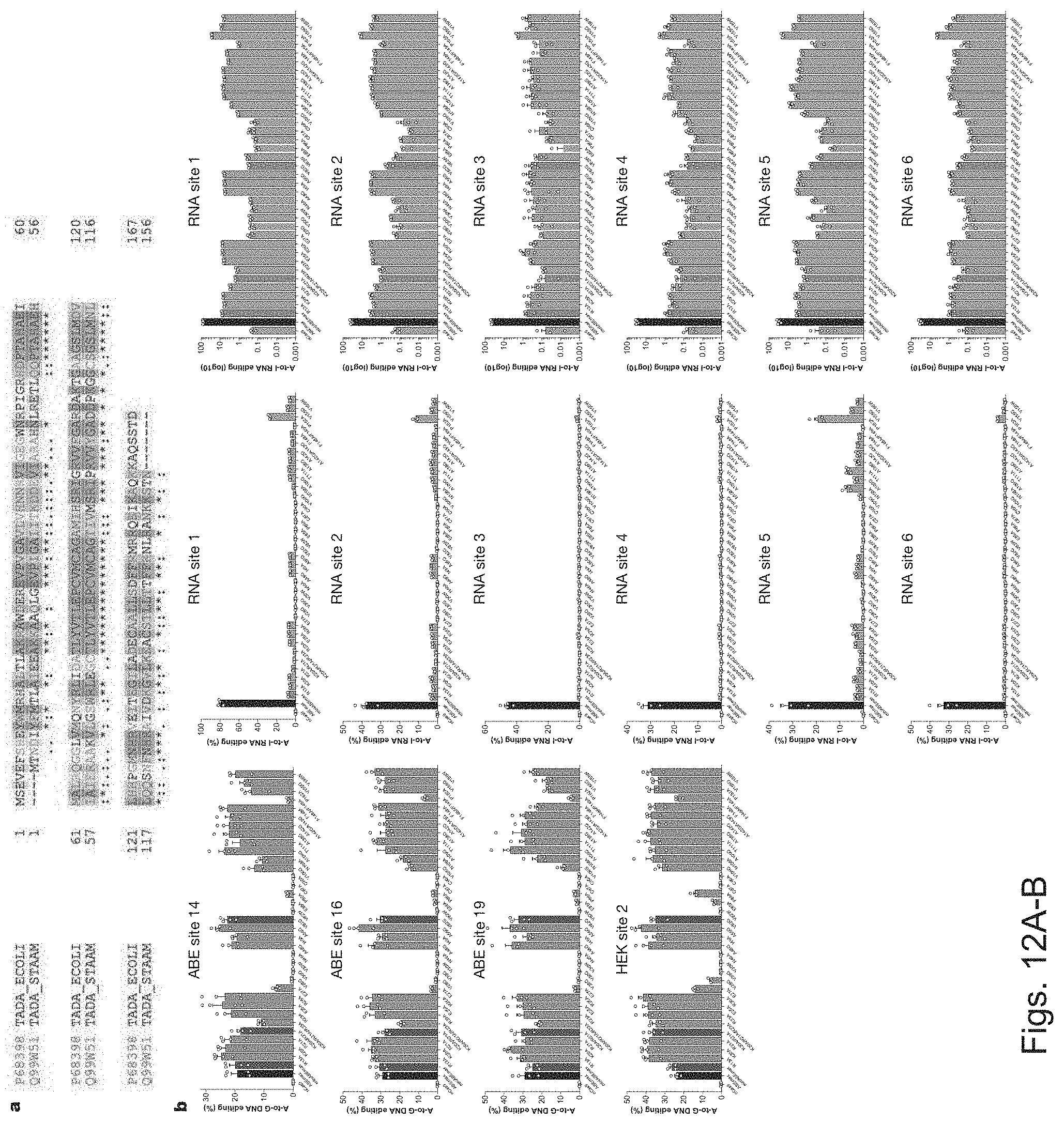 Amino acid substitutions predicted to generate ABE variants with reduced RNA editing. This table lists the residue changes in either or both TadA domains of the TadA-heterodimer (present in e.g. ABE7.10) predicted to cause an RRE phenotype, next to the reasoning behind the proposed changes. Residues to Change Rationale Wild type (WT) Engineered Protein Binding TadA TadA structure prediction S7 S205 x H8 H206 x E9 E207 x Y10 Y208 x W11 W209 x M12 M210 x R13 R211 x x H14 H212 x T17 T215 x K20 K218 x x R21 R219 x x W23 R221 x E25 E223 x x R26 R224 x x E27 E225 x V28 V226 x x P29 P227 x V30 V228 x G31 G229 x H36 L234 x N37 N235 x N38 N236 x N46 N244 x R47 R245 x P48 A246 x I49 I247 x G50 G248 x R51 I249 x H52 H250 x D53 D251 x P54 P252 x T55 T253 x A56 A254 x H57 H255 x x A58 A256 x E59 E257 x R64 R262 x Q65 Q263 x G67 G265 x L68 L266 x Q71 Q269 x N72 N270 x R74 R272 x I76 I274 x D77 D275 x Y81 Y279 x V82 V280 x T83 T281 x L84 F282 x E85 E283 x P86 P284 x x C87 C285 x x V88 V286 x M89 M287 x C90 C288 x x R98 R296 x G100 G298 x R101 R299 x A106 V304 x R107 R305 x D108 N306 x A109 A307 x K110 K308 x T111 T309 x D119 D317 x H122 H320 x H123 Y321 x P124 P322 x G125 G323 x M126 M324 x N127 N325 x H128 H326 x R129 R327 x V130 V328 x E131 E329 x I132 I330 x T133 T331 x E134 E332 x G135 G333 x L137 L335 x A138 A336 x x D139 D337 x E140 E338 x C141 C339 x x A142 A340 x x A143 A341 x x L144 L342 x L145 L343 x x S146 C344 x D147 Y345 x F148 F346 x x F149 F347 x x R150 R348 x x M151 M349 x R152 P350 x x R153 R351 x Q154 Q352 x E155 V353 x x I156 F354 x K157 N355 x K160 K358 x K161 K359 x Exemplary TadA proteins. Some or all residues listed in Table A as well as combinations thereof might also be introduced in any of these TadA orthologues or tRNA adenosine deaminase homologues (same proteins were aligned in FIG. 5). tRNA-specific Uniprot adenosine accession Sequence Seq. deaminase number version # ID P68398 2 1 Q99W51 1 2 Q5XE14 2 3 Q8XGY4 2 4 O67050 1 5 O94642 2 6 P53065 1 7 P47058 1 8 Q6IDB6 1 9 Q4V7V8 1 10 Q0P4H0 1 11 Q5RIV4 2 12 Q5E9J7 1 13 Q6P6J0 1 14 Q7Z6V5 1 15 (SEQ ID NO: 1) MSEVEFSHEYWMRHALTLAKRAWDEREVPVGAVLVHNNRVIGEGWNRPIG RHDPTAHAEIMALRQGGLVMQNYRLIDATLYVTLEPCVMCAGAMIHSRIG RVVFGARDAKTGAAGSLMDVLHHPGMNHRVEITEGILADECAALLSDFFR MRRQEIKAQKKAQSSTD. (SEQ ID NO: 21) SEVEFSHEYWMRHALTLAKRARDEREVPVGAVLVLNNRVIGEGWNRAIGL HDPTAHAEIMALRQGGLVMQNYRLIDATLYVTFEPCVMCAGAMIHSRIGR VVFGVRNAKTGAAGSLMDVLHYPGMNHRVEITEGILADECAALLCYFFRM PRQVFNAQKKAQSSTD. (SEQ ID NO: 22) MSEVEFSHEYWMRHALTLAKRAWDEREVPVGAVLVHNNRVIGEGWNRPIG RHDPTAHAEIMALRQGGLVMQNYRLIDATLYVTLEPCVMCAGAMIHSRIG RVVFGARDAKTGAAGSLMDVLHHPGMNHRVEITEGILADECAALLSDFFR MRRQEIKAQKKAQSSTDSGGSSGGSSGSETPGTSESATPESSGGSSGGSS EVEFSHEYWMRHALTLAKRARDEREVPVGAVLVLNNRVIGEGWNRAIGLH DPTAHAEIMALRQGGLVMQNYRLIDATLYVTFEPCVMCAGAMIHSRIGRV VFGVRNAKTGAAGSLMDVLHYPGMNHRVEITEGILADECAALLCYFFRMP RQVFNAQKKAQSSTD. List of Exemplary Cas9 or Cas12a Orthologs UniProt or GenBank Nickase Mutations/Catalytic Ortholog Accession Number residues Q99ZW2.1 D10A, E762A, H840A, N854A, (SpCas9) N863A, D986A17 J7RUA5.1 D10A and N58018 (SaCas9) G3ECR1.2 D31A and N891A19 (St1Cas9) BAK30384.1 D10, H599* (SpaCas9) Q0P897.1 D8A, H559A20 (CjCas9) A0Q5Y3.1 D11, N99521 (FnCas9) A7HP89.1 D8, H601* (PlCas9) G1UFN3.1 D7, H567* Q9CLT2.1 A0Q7Q2.1 D917, E1006, D125521 (FnCpf1) WP_052585281.1 D986A** (MbCpf1) A. sp. BV3L6 Cpf1 U2UMQ6.1 D908, 993E, Q1226, D126323 (AsCpf1) A0A182DWE3.1 D832A24 (LbCpf1) *predicted based on UniRule annotation on the UniProt database. **Unpublished but deposited at addgene by Ervin Welker: pTE4565 (Addgene plasmid # 88903) List of Exemplary High Fidelity and/or PAM-relaxed RGN Orthologs Published HF/PAM-RGN variants PMID Mutations* 26628643 K810A/K1003A/R1060A (1.0); Cas9 (SpCas9) K848A/K1003A/R1060A(1.1) eSpCas9 29431739 M495V/Y515N/K526E/R661Q; Cas9 (SpCas9) (M495V/Y515N/K526E/R661S; evoCas9 M495V/Y515N/K526E/R661L) 26735016 N497A/R661A/Q695A/Q926A Cas9 (SpCas9) HF1 30082871 R691A Cas9 (SpCas9) HiFi Cas9 28931002 N692A, M694A, Q695A, H698A Cas9 (SpCas9) HypaCas9 30082838 F539S, M763I, K890N Cas9 (SpCas9) Sniper-Cas9 29512652 A262T, R324L, S409I, E480K, E543D, M694I, Cas9 (SpCas9) E1219V xCas9 30166441 R1335V, L1111R, D1135V, G1218R, Cas9 (SpCas9) E1219F, A1322R, T1337R SpCas9-NG 26098369 D1135V, R1335Q, T1337R; Cas9 (SpCas9) D1135V/G1218R/R1335E/T1337R VQR/VRER 26524662 E782K/N968K/R1015H (SaCas9)-KKH enAsCas12a USSN One or more of: E174R, S170R, S542R, K548R, 15/960,271 K548V, N551R, N552R, K607R, K607H, e.g., E174R/S542R/K548R, E174R/S542R/K607R, E174R/S542R/K548V/N552R, S170R/S542R/K548R, S170R/E174R, E174R/S542R, S170R/S542R, E174R/S542R/K548R/N551R, E174R/S542R/K607H, S170R/S542R/K607R, or S170R/S542R/K548V/N552R enAsCas12a-HF USSN One or more of: E174R, S542R, K548R, e.g., 15/960,271 E174R/S542R/K548R, E174R/S542R/K607R, E174R/S542R/K548V/N552R, S170R/S542R/K548R, S170R/E174R, E174R/S542R, S170R/S542R, E174R/S542R/K548R/N551R, E174R/S542R/K607H, S170R/S542R/K607R, or S170R/S542R/K548V/N552R, with the addition of one or more of: N282A, T315A, N515A and K949A enLbCas12a(HF) USSN One or more of T152R, T152K, D156R, D156K, 15/960,271 Q529K, G532R, G532K, G532Q, K538R, K538V, D541R, Y542R, M592A, K595R, K595H, K595S or K595Q, e.g., D156R/G532R/K538R, D156R/G532R/K595R, D156R/G532R/K538V/Y542R, T152R/G532R/K538R, T152R/D156R, D156R/G532R, T152R/G532R, D156R/G532R/K538R/D541R, D156R/G532R/K595H, T152R/G532R/K595R, T152R/G532R/K538V/Y542R, optionally with the addition of one or more of: N260A, N256A, K514A, D505A, K881A, S286A, K272A, K897A enFnCas12a(HF) USSN One or more of T177A, K180R, K180K, E184R, 15/960,271 E184K, T604K, N607R, N607K, N607Q, K613R, K613V, D616R, N617R, M668A, K671R, K671H, K671S, or K671Q, e.g., E184R/N607R/K613R, E184R/N607R/K671R, E184R/N607R/K613V/N617R, K180R/N607R/K613R, K180R/E184R, E184R/N607R, K180R/N607R, E184R/N607R/K613R/D616R, E184R/N607R/K671H, K180R/N607R/K671R, K180R/N607R/K613V/N617R, optionally with the addition of one or more of: N305A, N301A, K589A, N580A, K96