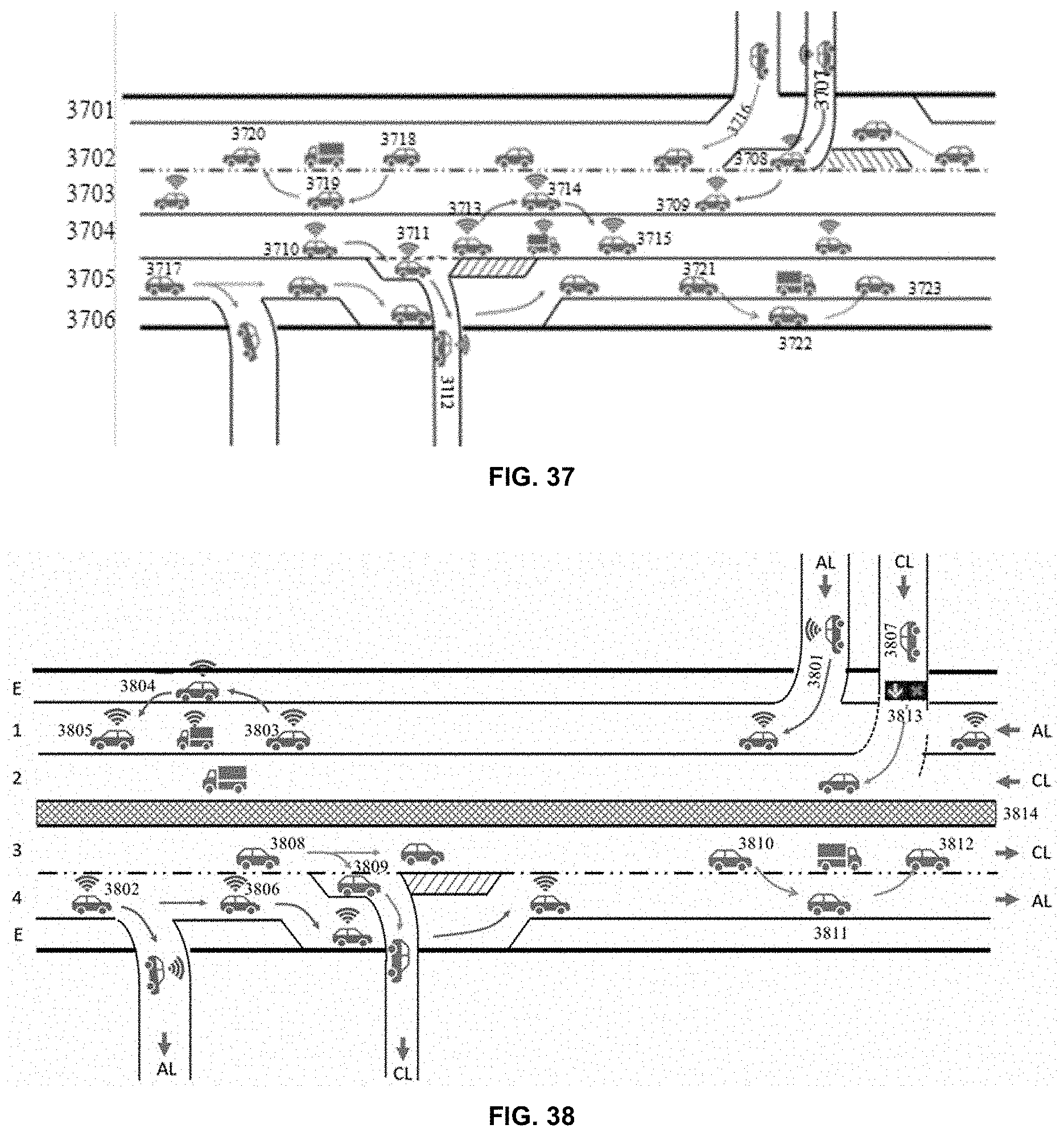 [0069]FIG. 37 is a schematic drawing of a mixed scene comprising vehicle merging, diverging, and overtaking for a multi-lane (e.g., two-way multi-lane) highway in which the innermost lanes (e.g., second and third lanes) are automated lanes.