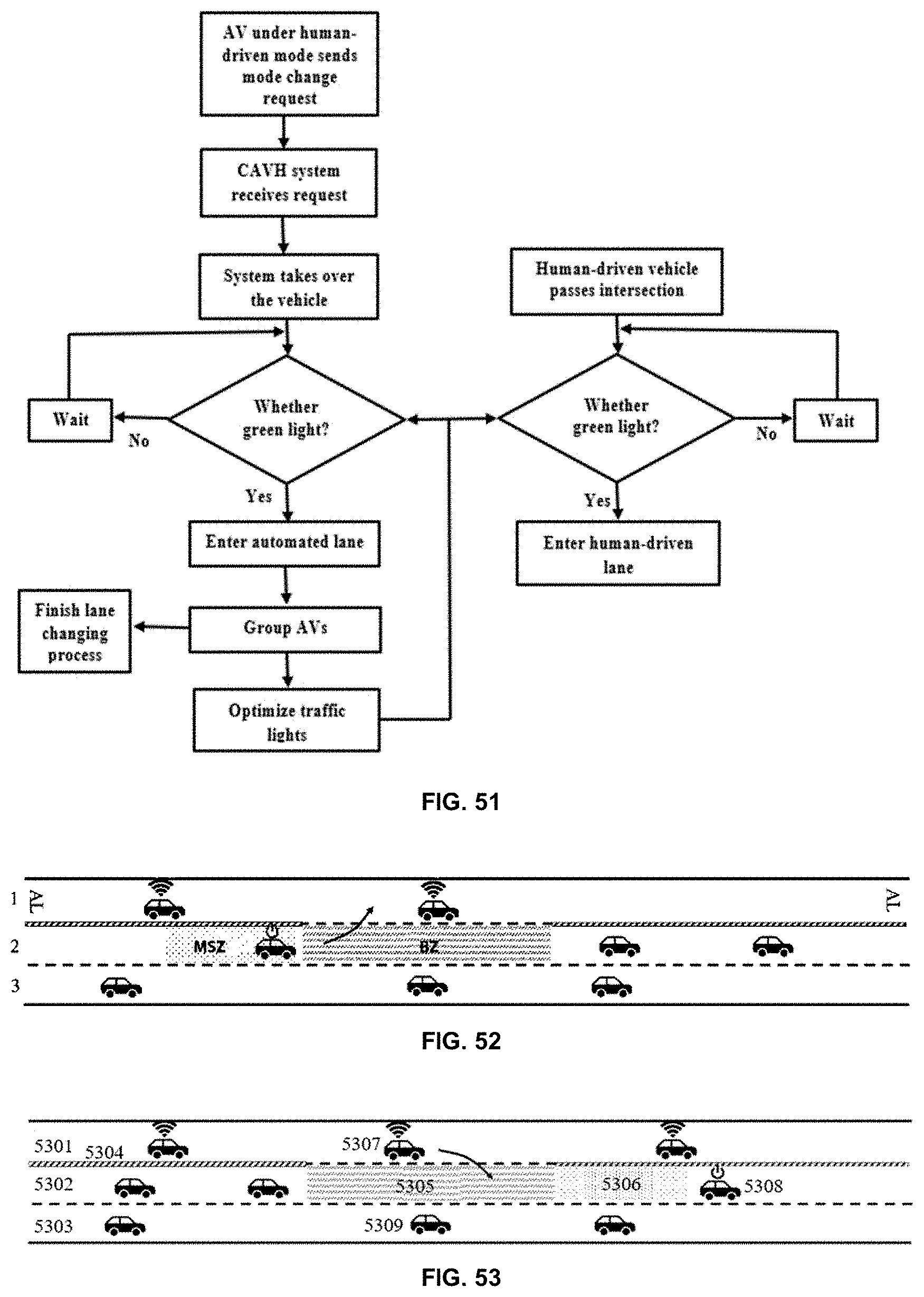 [0218]In some embodiments, as shown in FIG. 50, the technology provides methods and systems for switching an AV from an automated mode to a human-driven mode. For example, in some embodiments, a mode switching request is sent by an AV to the system when the vehicle passes the mode switching zone. Next, the CAVH control center determines whether mode switching requirements are met by the AV. If the requirements are met, the driver is prompted to assume control of the vehicle; if the requirements are not met, the vehicle continues driving on the automated lane. After the driver assumes control of the vehicle, the driver controls the vehicle to complete the deceleration process through the buffer zone and enters the human-driven lane. At this point, the vehicle completes the process of switching to the human-driven lane. In some embodiments, the CAVH Control Center optimizes the remaining AV speeds on the automated lanes and regroups them to form platoons. In some embodiments, the CAVH Control Center updates the status of the associated traffic lights based on the real-time traffic status.
