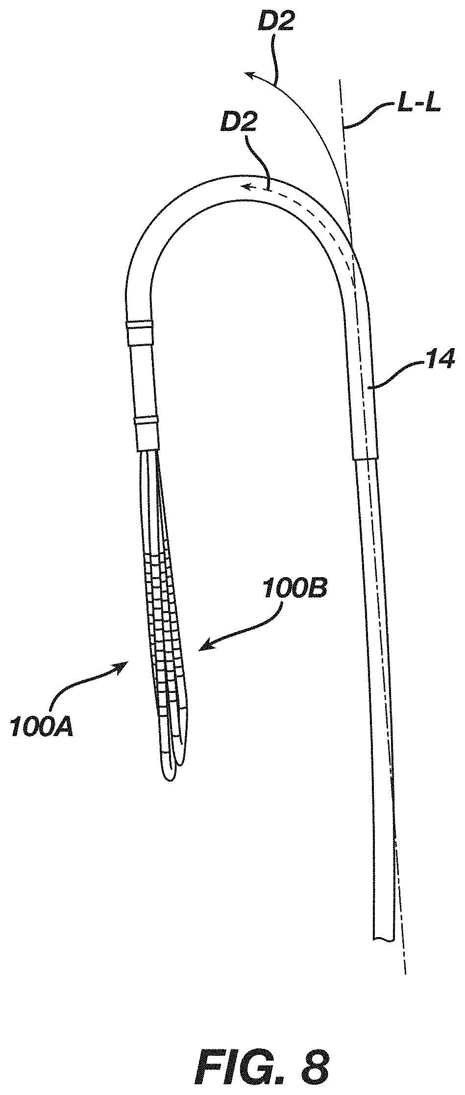first and second openings intersecting the first orthogonal plane and extending along the longitudinal axis, each of the openings configured to receive a puller wire; six apertures disposed between the first and second openings with four apertures intersecting the second orthogonal plane, each of the apertures configured to receive a spine member; an end effector coupled to the distal portion, the end effector including first, second and third closed-loop members, the end effector having an unrestrained configuration in which: