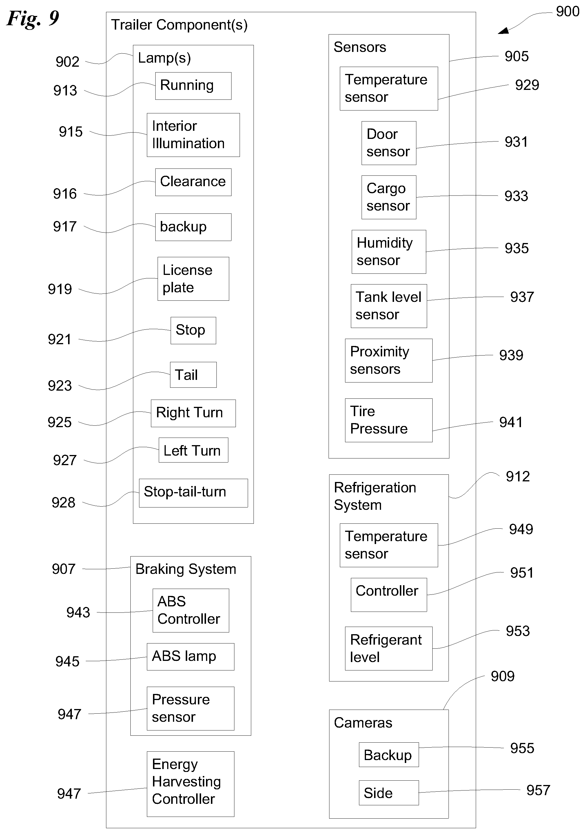 multiple nose box terminals extending from the housing, nose box terminals including a ground cable terminal and a power cable terminal; at least two trailer terminals extending from the circuit housing, the trailer terminals including a trailer ground terminal and at least one trailer power terminal, wherein the control circuit is configured to selectively electrically connect the nose box terminals to the trailer terminals; and a location finding circuit configured to determine a geographic location of the control circuit, wherein the control circuit is configured to send the geographic location to a remote device using a communication link; wherein the control circuit is configured to determine a status of one or more trailer components electrically connected to the at least two trailer terminals; and wherein the control circuit is configured to use the communication link to send data about at least one of the one or more trailer components to the remote device. 52. The mount of an outage detection circuit responsive to one or more trailer components, wherein the control circuit is configured to determine when at least one of the one or more trailer components has failed, and to send data about the at least one trailer component to the remote device using the communication link. 53. The mount of 54. The mount of 55. The mount of an energy harvesting control circuit configured to obtain data defining the status of an energy harvesting device, and to send data defining changes in operation of the energy harvesting device using the communication link. 56. The mount of a memory, wherein the control circuit is configured to record in the memory the status of the one or more trailer components and send the data to the remote device using the communication link. 57. The mount of at least one accelerometer, wherein the control circuit is configured to store accelerometer data received from the accelerometer in the memory, wherein the control circuit is configured to send the accelerometer data to the remote device using the at least one communication link. 58. The mount of a trailer component control circuit that is electrically connected to the at least two trailer terminals, the trailer component control circuit configured to generate trailer component control signals for one or more trailer components, wherein the trailer component control signals are sent to the at least one power terminal. 59. The mount of a Control Area Network (CAN) control circuit having a CAN transceiver, the CAN control circuit electrically connected to at least one CAN terminals adapted to connect to at least one CAN communications cable, wherein the CAN control circuit is configured to generate the trailer component control signals for the one or more trailer components using the CAN transceiver. 60. The mount of an environmental monitoring circuit responsive to one or more environmental sensors, wherein the control circuit is configured to obtain environmental data from the environmental monitoring circuit and send the environmental data to the remote device, wherein the control circuit is configured to send the remote device using the at least one communication link. 61. A control circuit assembly adapted to be placed between a truck trailer and a nosebox comprising: