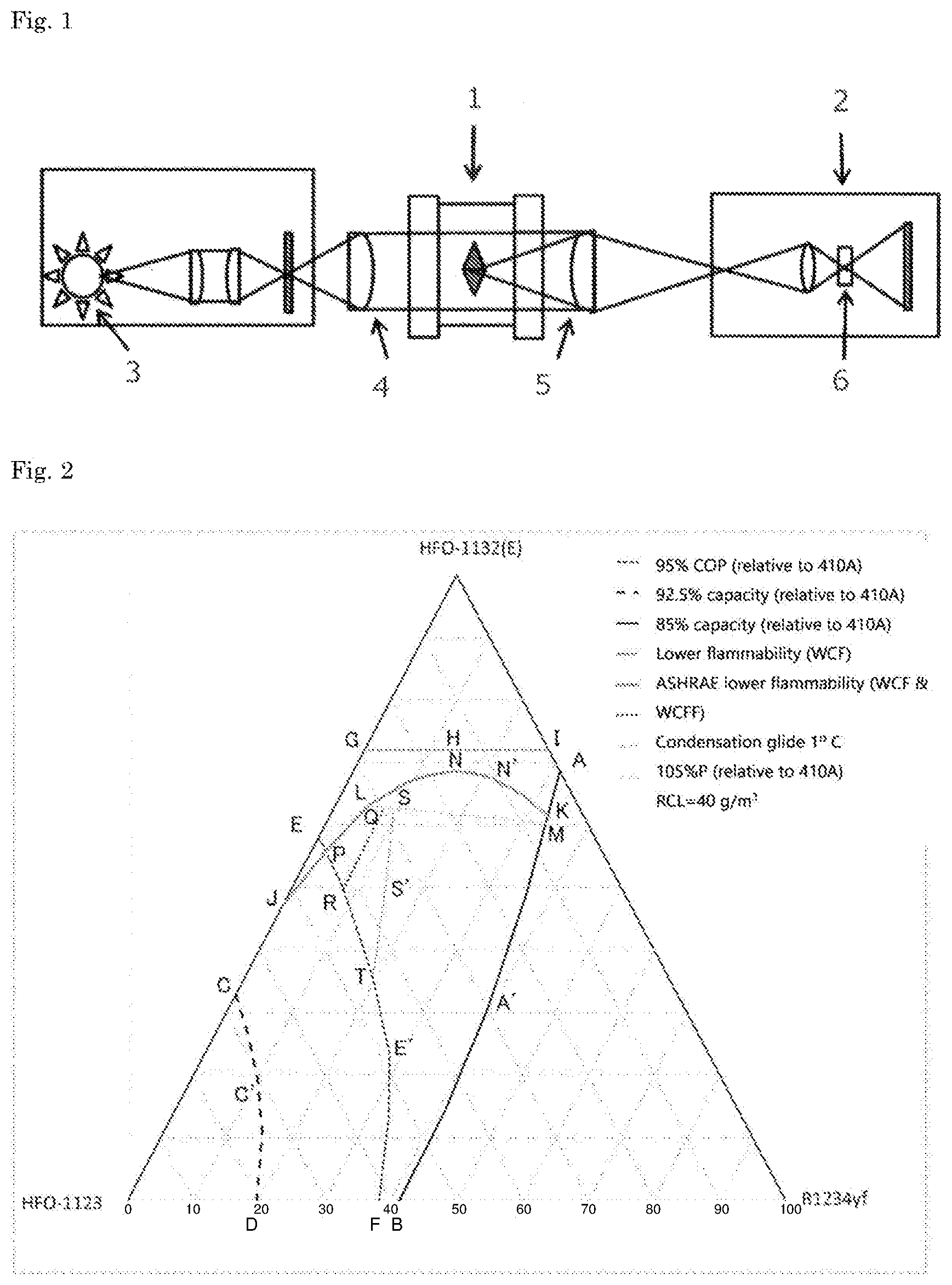 HFO-1132(E) mass % R410A 100.0 68.6 49.0 30.6 14.1 0.0 HFO-1123 mass % 0.0 0.0 14.9 30.0 44.8 58.7 R1234yf mass % 0.0 31.4 36.1 39.4 41.1 41.3 GWP — 2088 1 2 2 2 2 2 COP ratio % (relative 100 99.7 100.0 98.6 97.3 96.3 95.5 to 410A) Refrigerating % (relative 100 98.3 85.0 85.0 85.0 85.0 85.0 capacity ratio to 410A) Condensation glide ° C. 0.1 0.00 1.98 3.36 4.46 5.15 5.35 Discharge pressure % (relative 100.0 99.3 87.1 88.9 90.6 92.1 93.2 to 410A) RCL g/m3 — 30.7 37.5 44.0 52.7 64.0 78.6 HFO-1132(E) mass % 32.9 26.6 19.5 10.9 0.0 58.0 23.4 0.0 HFO-1123 mass % 67.1 68.4 70.5 74.1 80.4 42.0 48.5 61.8 R1234yf mass % 0.0 5.0 10.0 15.0 19.6 0.0 28.1 38.2 GWP — 1 1 1 1 2 1 2 2 COP ratio % (relative 92.5 92.5 92.5 92.5 92.5 95.0 95.0 95.0 to 410A) Refrigerating % (relative 107.4 105.2 102.9 100.5 97.9 105.0 92.5 86.9 capacity ratio to 410A) Condensation glide ° C. 0.16 0.52 0.94 1.42 1.90 0.42 3.16 4.80 Discharge pressure % (relative 119.5 117.4 115.3 113.0 115.9 112.7 101.0 95.8 to 410A) RCL g/m3 53.5 57.1 62.0 69.1 81.3 41.9 46.3 79.0 HFO-1132(E) mass % 47.1 55.8 63.1 68.6 65.0 61.3 HFO-1123 mass % 52.9 42.0 31.9 16.3 7.7 5.4 R1234yf mass % 0.0 2.2 5.0 15.1 27.3 33.3 GWP — 1 1 1 1 2 2 COP ratio % (relative 93.8 95.0 96.1 97.9 99.1 99.5 to 410A) Refrigerating % (relative 106.2 104.1 101.6 95.0 88.2 85.0 capacity ratio to 410A) Condensation glide ° C. 0.31 0.57 0.81 1.41 2.11 2.51 Discharge pressure % (relative 115.8 111.9 107.8 99.0 91.2 87.7 to 410A) RCL g/m3 46.2 42.6 40.0 38.0 38.7 39.7 HFO-1132(E) mass % 63.1 60.3 62.8 49.8 62.6 50.0 35.8 HFO-1123 mass % 31.9 6.2 29.6 42.3 28.3 35.8 44.9 R1234yf mass % 5.0 33.5 7.6 7.9 9.1 14.2 19.3 GWP — 1 2 1 1 1 1 2 COP ratio % (relative 96.1 99.4 96.4 95.0 96.6 95.8 95.0 to 410A) Refrigerating % (relative 101.6 85.0 100.2 101.7 99.4 98.1 96.7 capacity ratio to 410A) Condensation glide ° C. 0.81 2.58 1.00 1.00 1.10 1.55 2.07 Discharge pressure % (relative 107.8 87.9 106.0 109.6 105.0 105.0 105.0 to 410A) RCL g/m3 40.0 40.0 40.0 44.8 40.0 44.4 50.8 HFO-1132(E) mass % 72.0 72.0 72.0 HFO-1123 mass % 28.0 14.0 0.0 R1234yf mass % 0.0 14.0 28.0 GWP — 1 1 2 COP ratio % (relative to 410A) 96.6 982 99.9 Refrigerating % (relative to 410A) 103.1 95.1 86.6 capacity ratio Condensation glide ° C. 0.46 127 1.71 Discharge pressure % (relative to 410A) 108.4 98.7 88.6 RCL g/m3 37.4 37.0 36.6 HFO-1132(E) mass % 10.0 20.0 30.0 40.0 50.0 60.0 70.0 80.0 HFO-1123 mass % 85.0 75.0 65.0 55.0 45.0 35.0 25.0 15.0 R1234yf mass % 5.0 5.0 5.0 5.0 5.0 5.0 5.0 5.0 GWP — 1 1 1 1 1 1 1 1 COP ratio % (relative 91.4 92.0 92.8 93.7 94.7 95.8 96.9 980 to 410A) Refrigerating % (relative 105.7 105.5 105.0 104.3 103.3 102.0 100.6 99.1 capacity ratio to 410A) Condensation glide ° C. 0.40 0.46 0.55 0.66 0.75 0.80 0.79 0.67 Discharge pressure % (relative 120.1 1187 116.7 114.3 111.6 108.7 105.6 102.5 to 410A) RCL g/m3 71.0 61.9 54.9 49.3 44.8 41.0 37.8 35.1 HFO-1132(E) mass % 10.0 20.0 30.0 40.0 50.0 60.0 70.0 80.0 HFO-1123 mass % 80.0 70.0 60.0 50.0 40.0 30.0 20.0 10.0 R1234yf mass % 10.0 10.0 10.0 10.0 10.0 10.0 10.0 10.0 GWP — 1 1 1 1 1 1 1 1 COP ratio % (relative 91.9 92.5 93.3 94.3 95.3 96.4 97.5 98.6 to 410A) Refrigerating % (relative 103.2 102.9 102.4 101.5 100.5 99.2 97.8 96.2 capacity ratio to 410A) Condensation glide ° C. 0.87 0.94 1.03 1.12 1.18 1.18 1.09 0.88 Discharge pressure % (relative 116.7 115.2 113.2 110.8 108.1 105.2 102.1 99.0 to 410A) RCL g/m3 70.5 61.6 54.6 49.1 44.6 40.8 37.7 35.0 HFO-1132(E) mass % 10.0 20.0 30.0 40.0 50.0 60.0 70.0 80.0 HFO-1123 mass % 75.0 65.0 55.0 45.0 35.0 25.0 15.0 5.0 R1234yf mass % 15.0 15.0 15.0 15.0 15.0 15.0 15.0 15.0 GWP — 1 1 1 1 1 1 1 1 COP ratio % (relative 92.4 93.1 93.9 94.8 95.9 97.0 98.1 99.2 to 410A) Refrigerating % (relative 100.5 100.2 99.6 987 97.7 96.4 94.9 93.2 capacity ratio to 410A) Condensation glide ° C. 1.41 1.49 1.56 1.62 1.63 1.55 1.37 1.05 Discharge pressure % (relative 113.1 111.6 109.6 107.2 104.5 101.6 98.6 95.5 to 410A) RCL g/m3 70.0 61.2 54.4 48.9 44.4 40.7 37.5 34.8 HFO-1132(E) mass % 10.0 20.0 30.0 40.0 50.0 60.0 70.0 HFO-1123 mass % 70.0 60.0 50.0 40.0 30.0 20.0 10.0 R1234yf mass % 20.0 20.0 20.0 20.0 20.0 20.0 20.0 GWP — 2 2 2 2 2 2 2 COP ratio % (relative 93.0 93.7 94.5 95.5 96.5 97.6 98.7 to 410A) Refrigerating % (relative 97.7 97.4 96.8 95.9 94.7 93.4 91.9 capacity ratio to 410A) Condensation glide ° C. 2.03 2.09 2.13 2.14 2.07 1.91 1.61 Discharge pressure % (relative 109.4 107.9 105.9 103.5 100.8 980 95.0 to 410A) RCL g/m3 69.6 60.9 54.1 48.7 44.2 40.5 37.4 HFO-1132(E) mass % 10.0 20.0 30.0 40.0 50.0 60.0 70.0 HFO-1123 mass % 65.0 55.0 45.0 35.0 25.0 15.0 5.0 R1234yf mass % 25.0 25.0 25.0 25.0 25.0 25.0 25.0 GWP — 2 2 2 2 2 2 2 COP ratio % (relative 93.6 94.3 95.2 96.1 97.2 98.2 99.3 to 410A) Refrigerating % (relative 94.8 94.5 93.8 92.9 91.8 90.4 88.8 capacity ratio to 410A) Condensation glide ° C. 2.71 2.74 2.73 2.66 2.50 2.22 1.78 Discharge pressure % (relative 105.5 104.0 102.1 99.7 97.1 94.3 91.4 to 410A) RCL g/m3 69.1 60.5 53.8 484 44.0 40.4 37.3 HFO-1132(E) mass % 10.0 20.0 30.0 40.0 50.0 60.0 HFO-1123 mass % 60.0 50.0 40.0 30.0 20.0 10.0 R1234yf mass % 30.0 30.0 30.0 30.0 30.0 30.0 GWP — 2 2 2 2 2 2 COP ratio % (relative 94.3 95.0 95.9 96.8 97.8 98.9 to 410A) Refrigerating % (relative 91.9 91.5 90.8 89.9 88.7 87.3 capacity ratio to 410A) Condensation glide ° C. 3.46 3.43 3.35 3.18 2.90 2.47 Discharge pressure % (relative 101.6 100.1 98.2 95.9 93.3 90.6 to 410A) RCL g/m3 68.7 60.2 53.5 48.2 43.9 40.2 HFO-1132(E) mass % 10.0 20.0 30.0 40.0 50.0 60.0 HFO-1123 mass % 55.0 45.0 35.0 25.0 15.0 5.0 R1234yf mass % 35.0 35.0 35.0 35.0 35.0 35.0 GWP — 2 2 2 2 2 2 COP ratio % (relative 95.0 95.8 96.6 97.5 98.5 99.6 to 410A) Refrigerating % (relative 88.9 88.5 87.8 86.8 85.6 84.1 capacity ratio to 410A) Condensation glide ° C. 4.24 4.15 3.96 3.67 3.24 2.64 Discharge pressure % (relative 97.6 96.1 94.2 92.0 89.5 86.8 to 410A) RCL g/m3 68.2 59.8 53.2 48.0 43.7 40.1 HFO-1132(E) ma