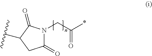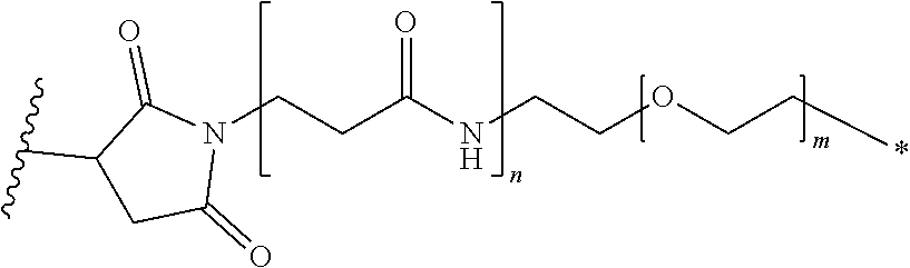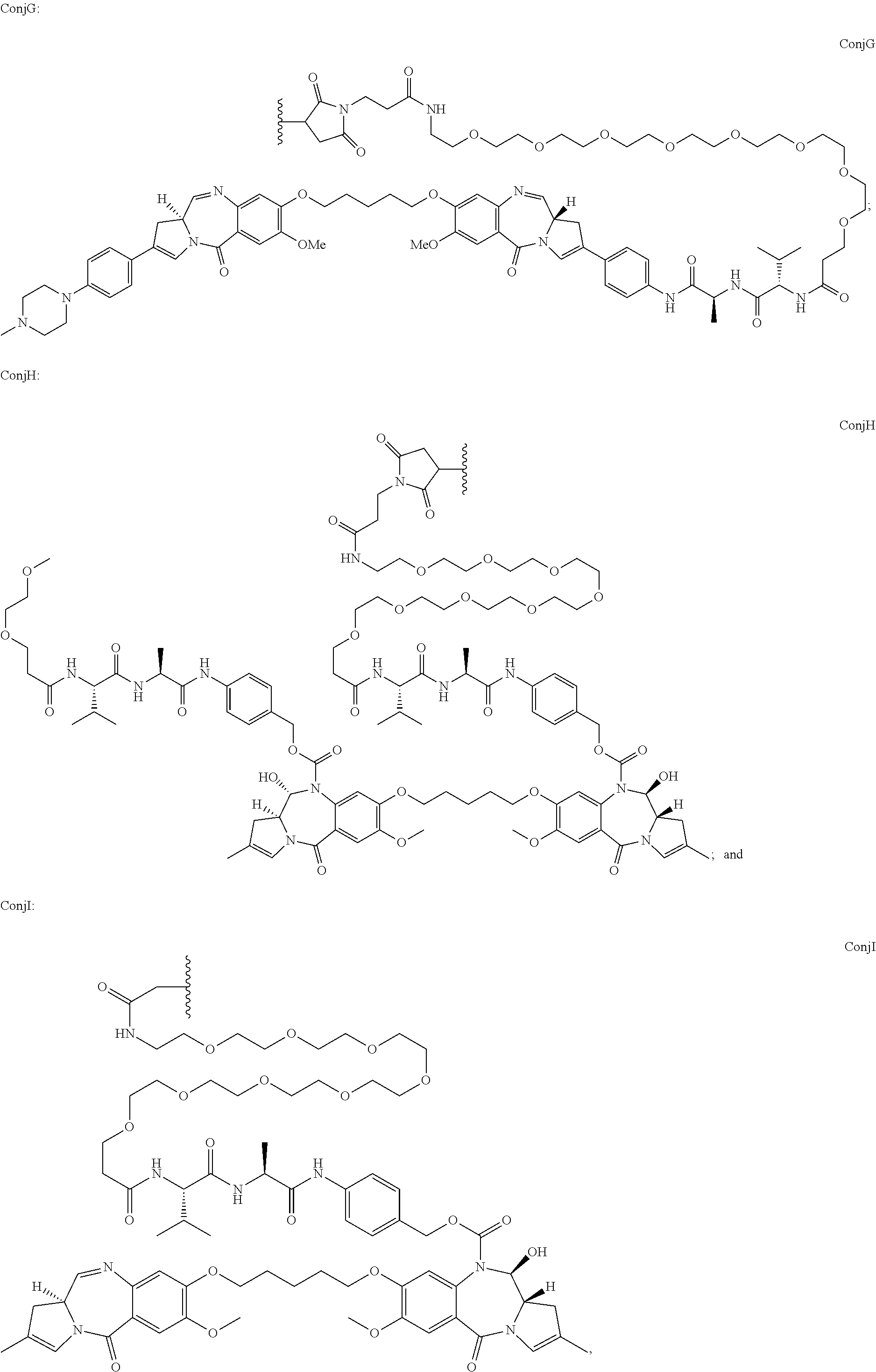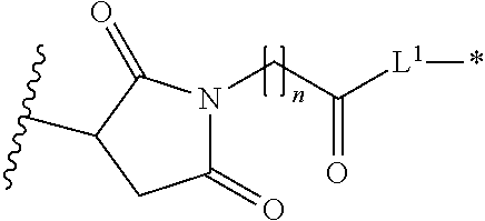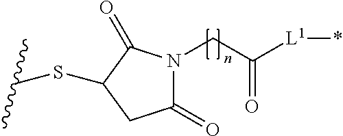 • where the asterisk indicates the point of attachment to L1, the wavy line indicates the point of attachment to the antibody, n is 0 or 1, and m is 0 to 30.
