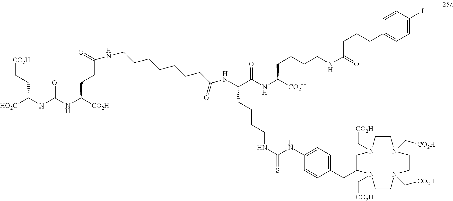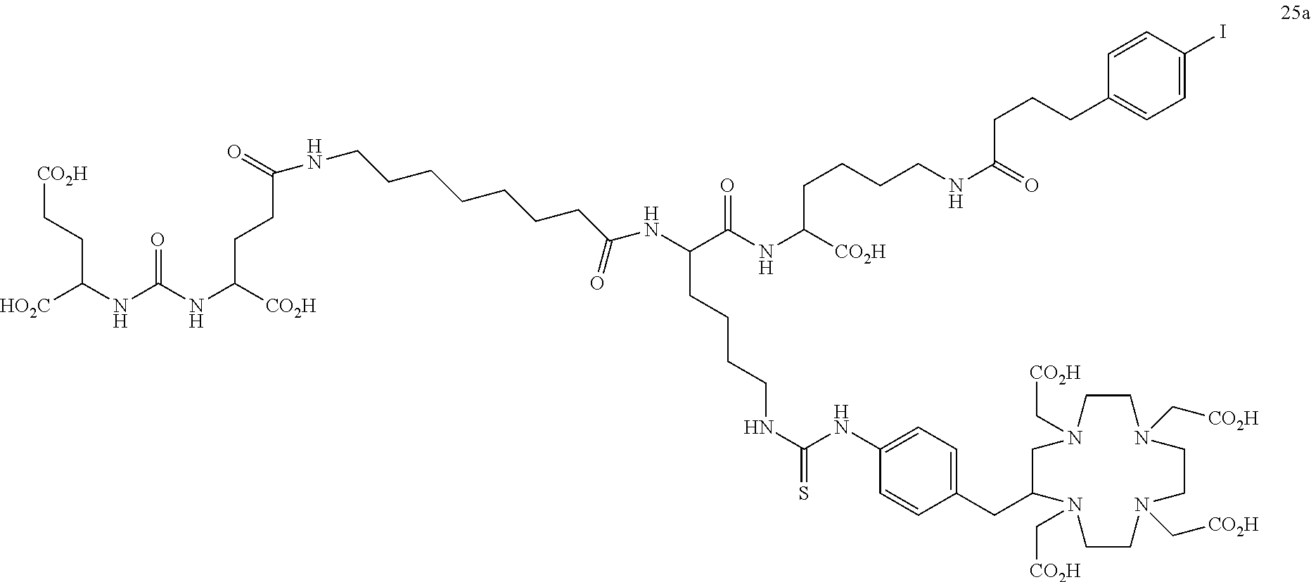 It is to be understood that a “covalently conjugated” chelating agent or a “covalently conjugated” polyaza polycarboxylic macrocycle means a chelating agent or polyaza polycarboxylic macrocycle (such as those listed above) wherein one or more bonds to a hydrogen atom contained therein are replaced by a bond to an atom of the remainder of the compound of the present technology or a pi bond between two atoms is replaced by a bond from one of the two atoms to the compound of the present technology and the other of the two atoms includes a new bond, e.g. to a hydrogen (such as reaction of an —NCS group in a chelating agent to provide the covalently conjugated chelating agent). The present technology also provides compositions and medicaments comprising anyone of the aspects and embodiments of the compounds of the present technology and a pharmaceutically acceptable carrier or one or more excipients or fillers (collectively refered to as “pharmaceutically acceptable carrier” unless otherwise specified). The compositions may be used in the methods and treatments described herein. The present technology also provides pharmaceutical compositions including a pharmaceutically acceptable carrier and an effective amount of a compound of any one of the aspects and embodiments of the compounds of the present technology for imaging and/or treating a condition; and where the condition may include a glioma, a breast cancer, an adrenal cortical cancer, a cervical carcinoma, a vulvar carcinoma, an endometrial carcinoma, a primary ovarian carcinoma, a metastatic ovarian carcinoma, a non-small cell lung cancer, a small cell lung cancer, a bladder cancer, a colon cancer, a primary, gastric adenocarcinoma, a primary colorectal adenocarcinoma, a renal cell carcinoma, and/or a prostate cancer. For example, such conditions may include a mammalian tissue overexpressing PSMA, such as a cancer expressing PSMA (including cancer tissues, cancer related neo-vasculature, or a combination thereof), Crohn's disease, or IBD. In a further related aspect, an imaging method is provided that includes administering a compound of any one of the aspects and embodiments of the compounds of the present technology (e.g., such as administering an effective amount) or administering a pharmaceutical composition comprising an effective amount of a compound of any one of the aspects and embodiments of the compounds of the present technology to a subject and, subsequent to the administering, detecting positron emission, detecting gamma rays from positron emission and annihilation (such as by positron emission tomography), and/or detecting Cerenkov radiation due to positron emission (such as by Cerenkov luminescene imaging). In any embodiment of the imaging method, the subject may be suspected of suffering from a condition that includes a glioma, a breast cancer, an adrenal cortical cancer, a cervical carcinoma, a vulvar carcinoma, an endometrial carcinoma, a primary ovarian carcinoma, a metastatic ovarian carcinoma, a non-small cell lung cancer, a small cell lung cancer, a bladder cancer, a colon cancer, a primary, gastric adenocarcinoma, a primary colorectal adenocarcinoma, a renal cell carcinoma, a prostate cancer, a mammalian tissue overexpressing PSMA, such as a cancer expressing PSMA (including cancer tissues, cancer related neo-vasculature, or a combination thereof), Crohn's disease, or IBD. The detecting step may occur during a surgical procedure on a subject, e.g., to remove a mammalian tissue overexpressing PSMA. The detecting step may include use of a handheld device to perform the detecting step. For example, Cerenkov luminescene images may be acquired by detecting the Cerenkov light using ultra-high-sensitivity optical cameras such as electron-multiplying charge-coupled device (EMCCD) cameras. In any of the above embodiments, the effective amount may be determined in relation to a subject. “Effective amount” refers to the amount of a compound or composition required to produce a desired effect. One non-limiting example of an effective amount includes amounts or dosages that yield acceptable toxicity and bioavailability levels for therapeutic (pharmaceutical) use including, but not limited to, the treatment of e.g., a glioma, a breast cancer, an adrenal cortical cancer, a cervical carcinoma, a vulvar carcinoma, an endometrial carcinoma, a primary ovarian carcinoma, a metastatic ovarian carcinoma, a non-small cell lung cancer, a small cell lung cancer, a bladder cancer, a colon cancer, a primary, gastric adenocarcinoma, a primary colorectal adenocarcinoma, a renal cell carcinoma, and a prostate cancer. Another example of an effective amount includes amounts or dosages that are capable of reducing symptoms associated with e.g., a glioma, a breast cancer, an adrenal cortical cancer, a cervical carcinoma, a vulvar carcinoma, an endometrial carcinoma, a primary ovarian carcinoma, a metastatic ovarian carcinoma, a non-small cell lung cancer, a small cell lung cancer, a bladder cancer, a colon cancer, a primary, gastric adenocarcinoma, a primary colorectal adenocarcinoma, a renal cell carcinoma, or a prostate cancer, such as, for example, reduction in proliferation and/or metastasis. An effective amount of a compound of the present technology may include an amount sufficient to enable detection of binding of the compound to a target of interest including, but not limited to, one or more of a glioma, a breast cancer, an adrenal cortical cancer, a cervical carcinoma, a vulvar carcinoma, an endometrial carcinoma, a primary ovarian carcinoma, a metastatic ovarian carcinoma, a non-small cell lung cancer, a small cell lung cancer, a bladder cancer, a colon cancer, a primary, gastric adenocarcinoma, a primary colorectal adenocarcinoma, a renal cell carcinoma, or a prostate cancer (such as castration resistant prostate cancer). Another example of an effective amount includes amounts or dosages that are capable of providing a