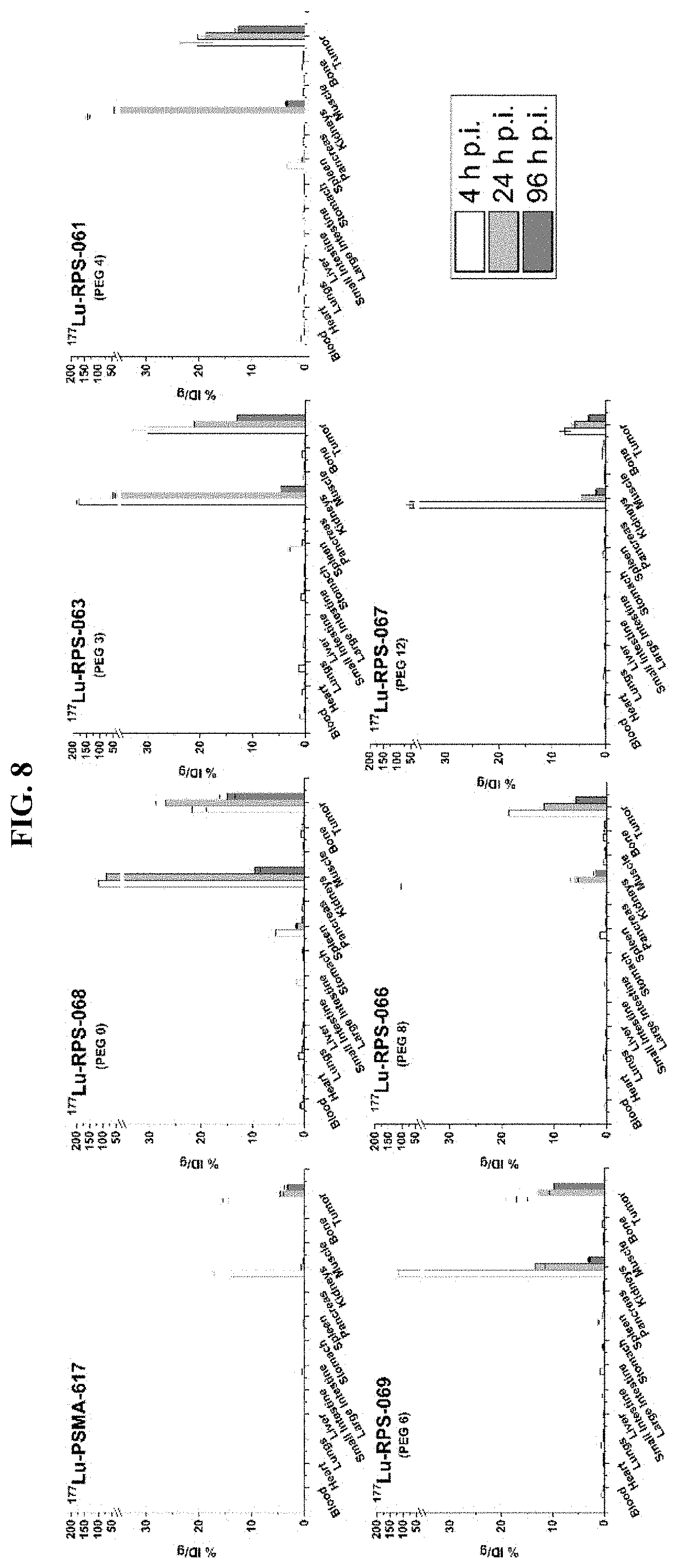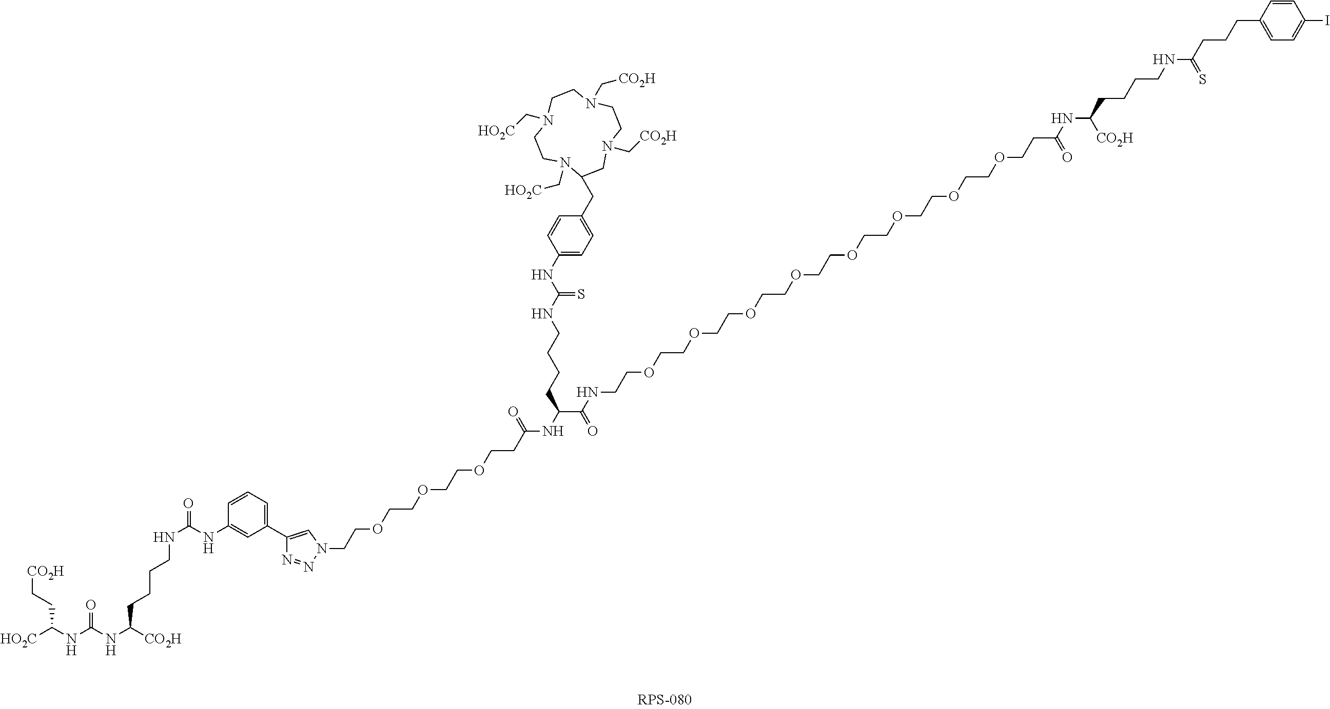 Summary of compound structures and key in vitro and in vivo characteristics. IC50 values were determined by a competitive binding assay in LNCaP cells. Tumor uptake was determined by biodistribution studies with the corresponding177Lu-labeled compound in LNCaP xenograft tumor-bearing mice. (a = 4 h p.i.; b = 24 h p.i.) Max. Mol. Tumor Wt. IC50 Uptakea Cpd. PEG Structure (g/mol) (nM) (% ID/g) PSMA- 617 n.a. 1042.15 6.6 ± 0.7 14.4 ± 2.5 RPS- 068 0 1615.52 2.1 ± 0.1 26.9 ± 2.0b RPS- 3 n = 2 1761.71 1.5 ± 0.3 30.0 ± 6.9 063 RPS- 4 n = 3 1805.76 4.1 ± 0.9 20.4 ± 3.1 061 RPS- 6 n = 5 1893.87 3.8 ± 0.4 17.0 ± 2.1 069 RPS- 8 n = 7 1981.97 5.2 ± 0.4 18.7 ± 1.1 066 RPS- 12 n = 11 2158.18 9.5 ± 1.1 7.6 ± 1.2 067 Section 1.3 References