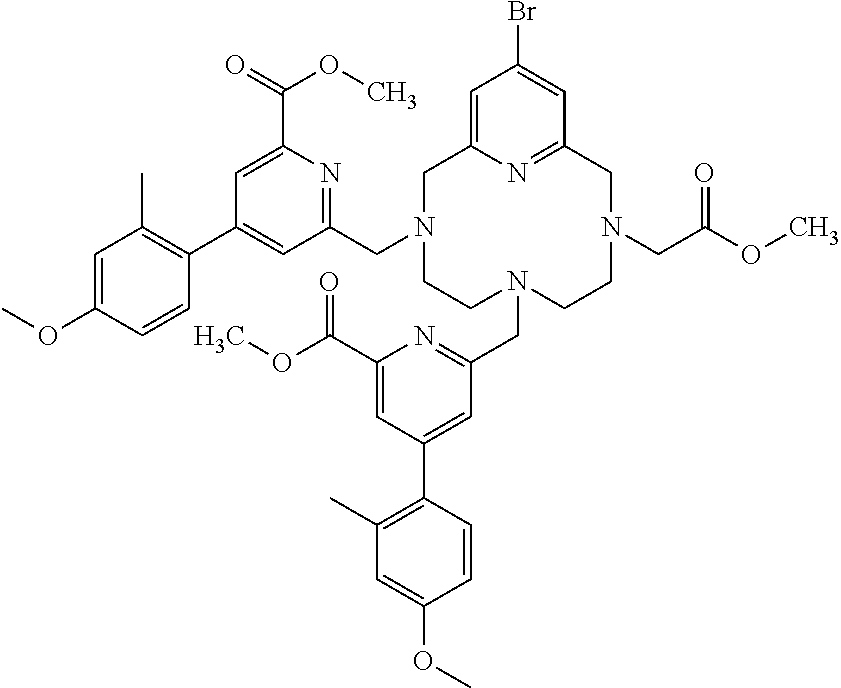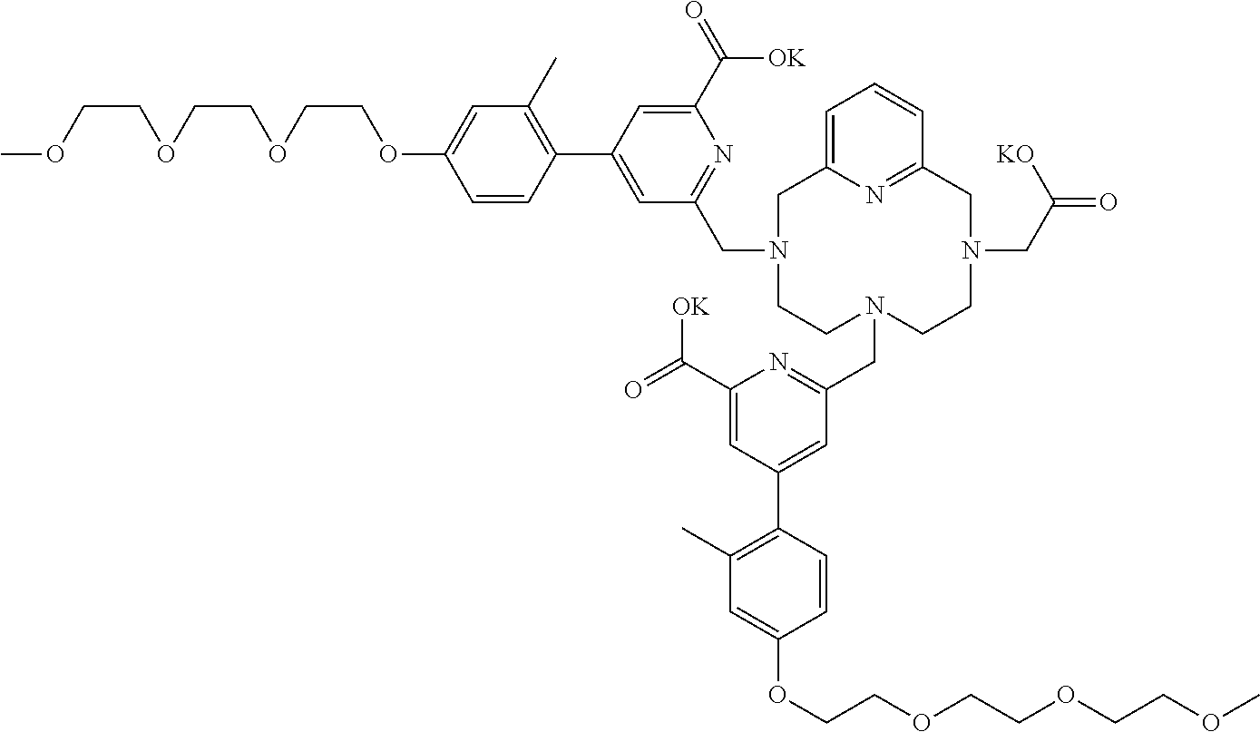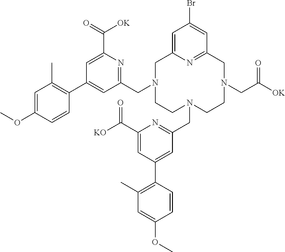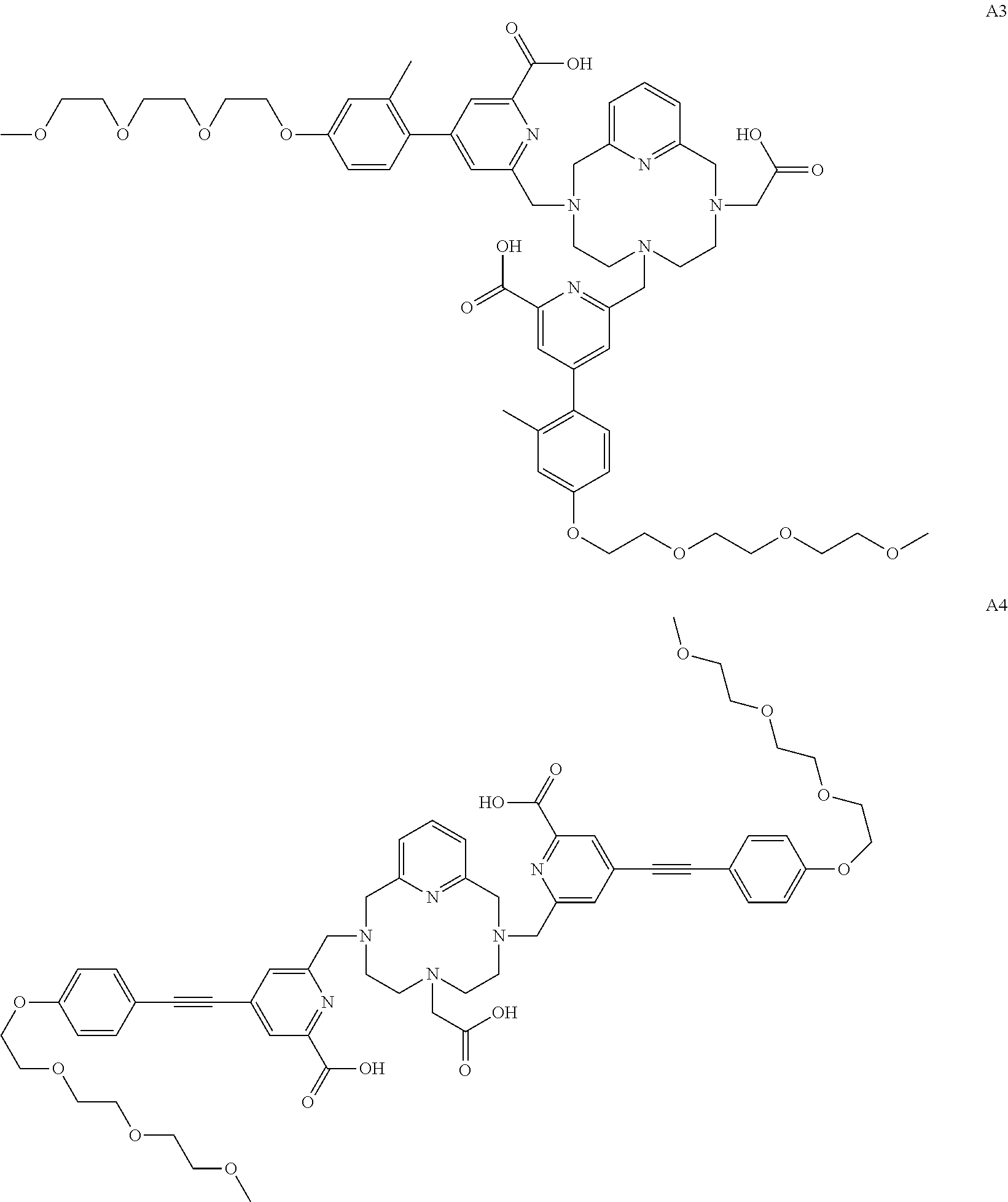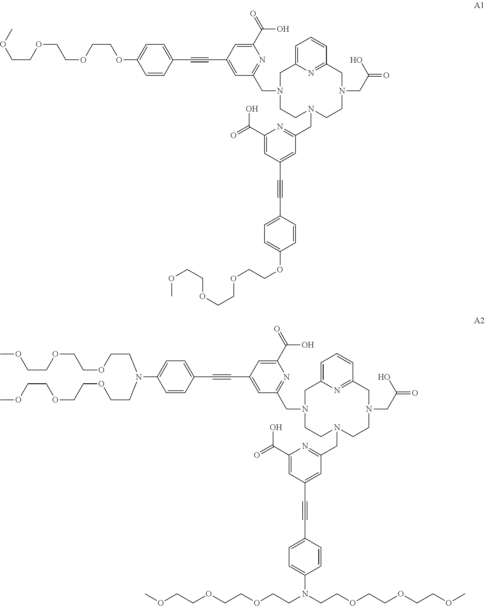 A1 6,6′-((9- (carboxymethyl)- 3,6,9-triaza-1(2,6)- pyridinacyclodecaphane- 3,6- diyl)bis(methylene)) bis(4-((4-(2-(2-(2- methoxyethoxy)ethoxy) ethoxy)phenyl)ethynyl) picolinic acid) A2 6,6′-((9- (carboxymethyl)- 3,6,9-triaza-1(2,6)- pyridinacyclodecaphane- 3,6- diyl)bis(methylene))bis (4-((4-(bis(2-(2-(2- methoxyethoxy)ethoxy) ethyl)amino)phenyl) ethynyl)picolinic acid) A3 6,6′-((9- (carboxymethyl)- 3,6,9-triaza-1(2,6)- pyridinacyclodecaphane- 3,6- diyl)bis(methylene)) bis(4-(4-(2-(2-(2- methoxyethoxy)ethoxy) ethoxy)-2- methylphenyl)picolinic acid) A4 6,6′-((6- (carboxymethyl)- 3,6,9-triaza-1(2,6)- pyridinacyclodecaphane- 3,9- diyl)bis(methylene)) bis(4-((4-(2-(2-(2- methoxyethoxy)ethoxy) ethoxy)phenyl)ethynyl) picolinic acid) A5 3,3′-((((((((((9- (carboxymethyl)- 3,6,9-triaza-1(2,6)- pyridinacyclodecaphane- 3,6- diyl)bis(methylene)) bis(6-carboxypyridine- 2,4-diyl))bis(ethyne- 2,1-diyl))bis(4,1- phenylene))bis(oxy)) bis(ethane-2,1- diyl))bis(1H-1,2,3- triazole-4,1- diyl))bis(propane-3,1- diyl))bis(dimethyl- ammoniumdiyl))bis (propane-1-sulfonate) A6 6,6′-((14-bromo-9- (carboxymethyl)- 3,6,9-triaza-1(2,6)- pyridinacyclodecaphane- 3,6- diyl)bis(methylene)) bis(4-(4-methoxy-2- methylphenyl)picolinic acid) S1 potassium 6,6′-((9- (carboxylatomethyl)- 3,6,9-triaza-1(2,6)- pyridinacyclodecaphane- 3,6- diyl)bis(methylene)) bis(4-((4-(2-(2-(2- methoxyethoxy)ethoxy) ethoxy)phenyl)ethynyl) picolinate) S2 potassium 6,6′-((9- (carboxylatomethyl)- 3,6,9-triaza-1(2,6)- pyridinacyclodecaphane- 3,6- diyl)bis(methylene)) bis(4-((4-(bis(2-(2-(2- methoxyethoxy)ethoxy) ethyl)amino)phenyl) ethynyl)picolinate) S3 potassium 6,6′-((9- (carboxylatomethyl)- 3,6,9-triaza-1(2,6)- pyridinacyclodecaphane- 3,6- diyl)bis(methylene)) bis(4-(4-(2-(2-(2- methoxyethoxy)ethoxy) ethoxy)-2- methylphenyl)picolinate) S4 potassium 6,6′-((6- (carboxylatomethyl)- 3,6,9-triaza-1(2,6)- pyridinacyclodecaphane- 3,9- diyl)bis(methylene)) bis(4-((4-(2-(2-(2- methoxyethoxy)ethoxy) ethoxy)phenyl)ethynyl) picolinate) S5 potassium 6,6′-((9- (carboxylatomethyl)- 3,6,9-triaza-1(2,6)- pyridinacyclodecaphane- 3,6- diyl)bis(methylene)) bis(4-((4-(2-(1-(3- (dimethyl(3- sulfonatopropyl) ammonio)propyl)-1H- 1,2,3-triazol-4- yl)ethoxy)phenyl) ethynyl)picolinate) S6 potassium 6,6′-((14- bromo-9- (carboxylatomethyl)- 3,6,9-triaza-1(2,6)- pyridinacyclodecaphane- 3,6- diyl)bis(methylene)) bis(4-(4-methoxy-2- methylphenyl)picolinate) E1 dimethyl 6,6′-((9-(2- methoxy-2-oxoethyl)- 3,6,9-triaza-1(2,6)- pyridinacyclodecaphane- 3,6- diyl)bis(methylene)) bis(4-((4-(2-(2-(2- methoxyethoxy)ethoxy) ethoxy)phenyl)ethynyl) picolinate) E2 dimethyl 6,6′-((9-(2- methoxy-2-oxoethyl)- 3,6,9-triaza-1(2,6)- pyridinacyclodecaphane- 3,6- diyl)bis(methylene)) bis(4-((4-(bis(2-(2-(2- methoxyethoxy)ethoxy) ethyl)amino)phenyl) ethynyl)picolinate) E3 dimethyl 6,6′-((9-(2- methoxy-2-oxoethyl)- 3,6,9-triaza-1(2,6)- pyridinacyclodecaphane- 3,6- diyl)bis(methylene)) bis(4-(4-(2-(2-(2- methoxyethoxy)ethoxy) ethoxy)-2- methylphenyl)picolinate) E4 dimethyl 6,6′-((6-(2- methoxy-2-oxoethyl)- 3,6,9-triaza-1(2,6)- pyridinacyclodecaphane- 3,9- diyl)bis(methylene)) bis(4-((4-(2-(2-(2- methoxyethoxy)ethoxy) ethoxy)phenyl)ethynyl) picolinate) E5 3,3′-((((((((((9-(2- methoxy-2-oxoethyl)- 3,6,9-triaza-1(2,6)- pyridinacyclodecaphane- 3,6- diyl)bis(methylene)) bis(6- (methoxycarbonyl) pyridine-2,4- diyl))bis(ethyne-2,1- diyl))bis(4,1- phenylene))bis(oxy)) bis(ethane-2,1- diyl))bis(1H-1,2,3- triazole-4,1- diyl))bis(propane-3,1- diyl))bis(dimethyl- ammoniumdiyl))bis (propane-1-sulfonate) E6 dimethyl 6,6′-((14- bromo-9-(2-methoxy- 2-oxoethyl)-3,6,9- triaza-1(2,6)- pyridinacyclodecaphane- 3,6- diyl)bis(methylene)) bis(4-(4-methoxy-2- methylphenyl)picolinate) 117 dimethyl 6,6′-((9-(2- methoxy-2-oxoethyl)- 3,6,9-triaza-1(2,6)- pyridinacyclodecaphane- 3,6- diyl)bis(methylene)) bis(4-((4-((4- (triisopropylsilyl)but- 3-yn-1- yl)oxy)phenyl)ethynyl) picolinate) 118 dimethyl 6,6′-((9-(2- methoxy-2-oxoethyl)- 3,6,9-triaza-1(2,6)- pyridinacyclodecaphane- 3,6- diyl)bis(methylene)) bis(4-((4-(but-3-yn-1- yloxy)phenyl)ethynyl) picolinate) EXAMPLES