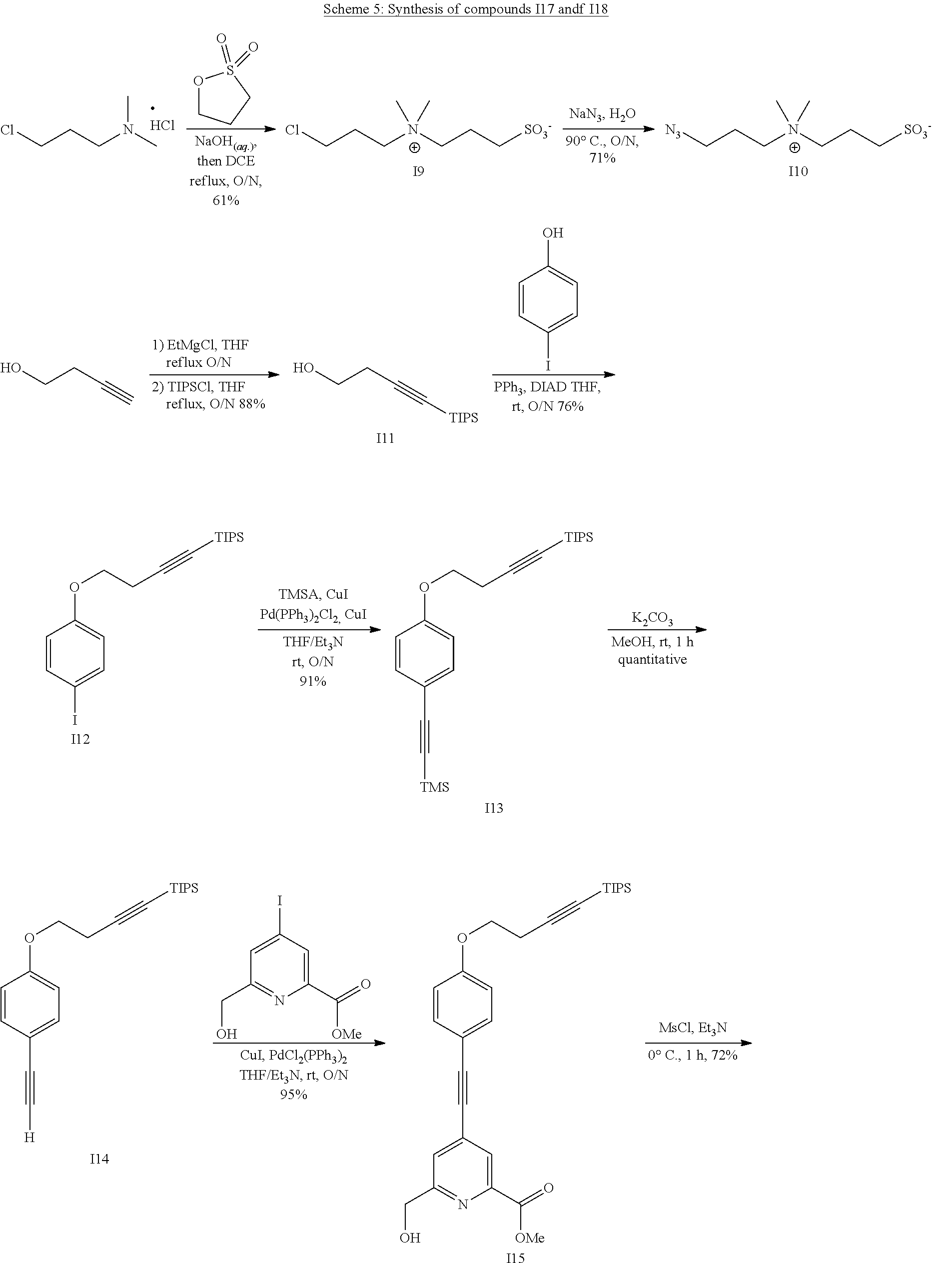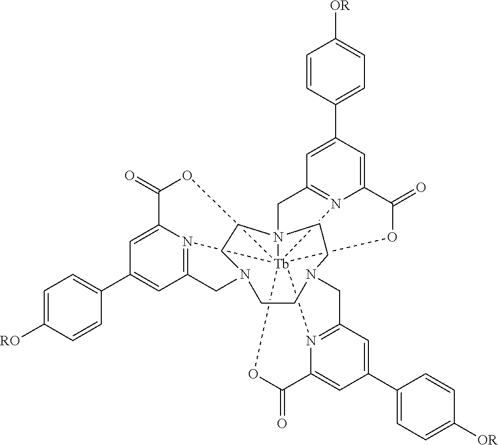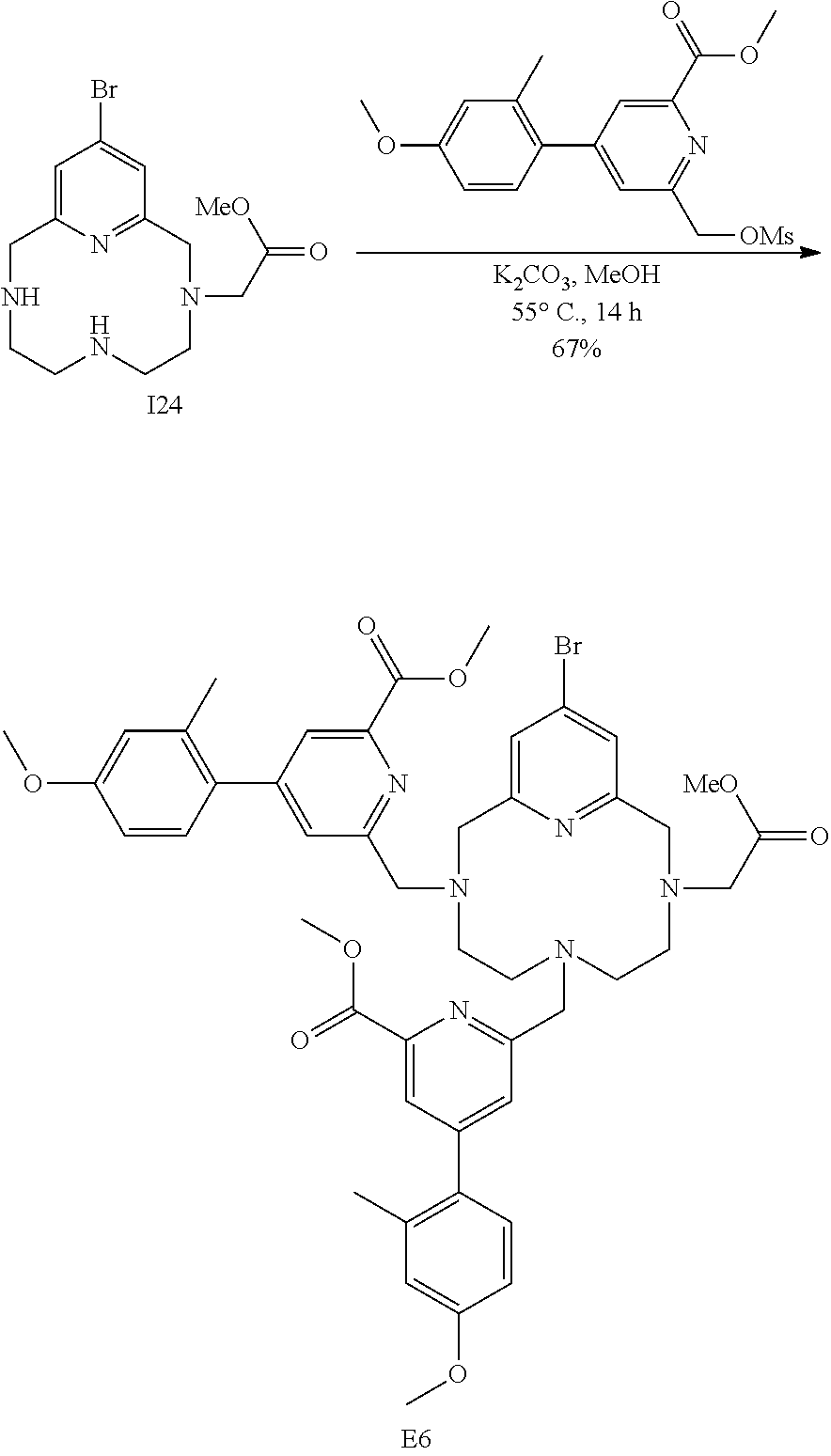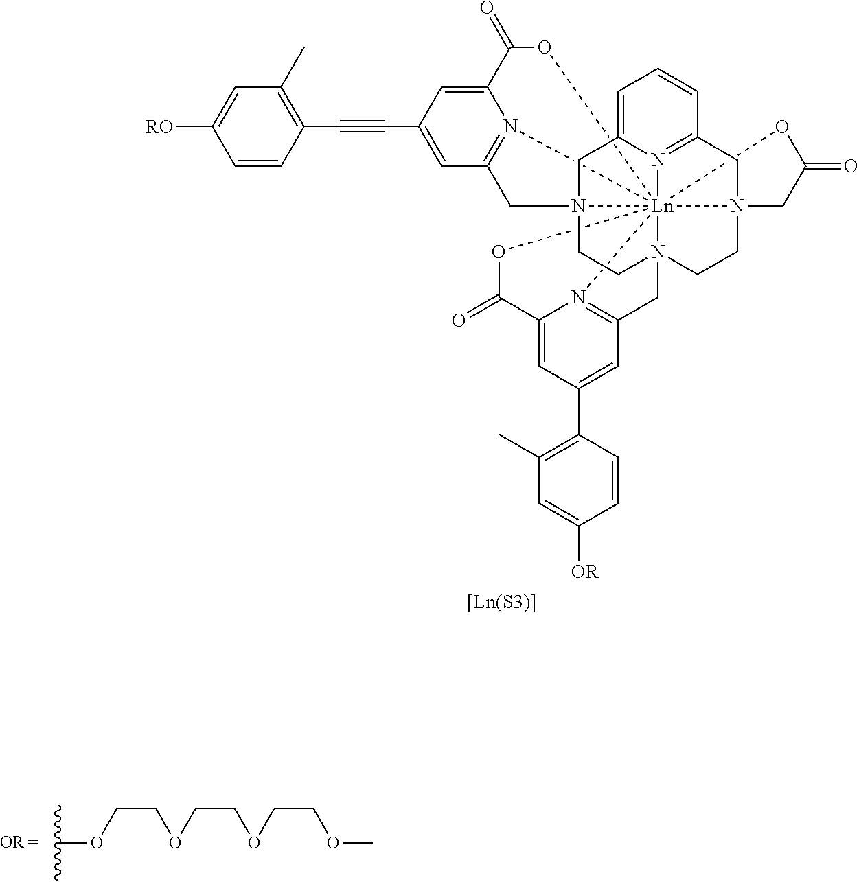 A1 6,6′-((9- (carboxymethyl)- 3,6,9-triaza-1(2,6)- pyridinacyclodecaphane- 3,6- diyl)bis(methylene)) bis(4-((4-(2-(2-(2- methoxyethoxy)ethoxy) ethoxy)phenyl)ethynyl) picolinic acid) A2 6,6′-((9- (carboxymethyl)- 3,6,9-triaza-1(2,6)- pyridinacyclodecaphane- 3,6- diyl)bis(methylene))bis (4-((4-(bis(2-(2-(2- methoxyethoxy)ethoxy) ethyl)amino)phenyl) ethynyl)picolinic acid) A3 6,6′-((9- (carboxymethyl)- 3,6,9-triaza-1(2,6)- pyridinacyclodecaphane- 3,6- diyl)bis(methylene)) bis(4-(4-(2-(2-(2- methoxyethoxy)ethoxy) ethoxy)-2- methylphenyl)picolinic acid) A4 6,6′-((6- (carboxymethyl)- 3,6,9-triaza-1(2,6)- pyridinacyclodecaphane- 3,9- diyl)bis(methylene)) bis(4-((4-(2-(2-(2- methoxyethoxy)ethoxy) ethoxy)phenyl)ethynyl) picolinic acid) A5 3,3′-((((((((((9- (carboxymethyl)- 3,6,9-triaza-1(2,6)- pyridinacyclodecaphane- 3,6- diyl)bis(methylene)) bis(6-carboxypyridine- 2,4-diyl))bis(ethyne- 2,1-diyl))bis(4,1- phenylene))bis(oxy)) bis(ethane-2,1- diyl))bis(1H-1,2,3- triazole-4,1- diyl))bis(propane-3,1- diyl))bis(dimethyl- ammoniumdiyl))bis (propane-1-sulfonate) A6 6,6′-((14-bromo-9- (carboxymethyl)- 3,6,9-triaza-1(2,6)- pyridinacyclodecaphane- 3,6- diyl)bis(methylene)) bis(4-(4-methoxy-2- methylphenyl)picolinic acid) S1 potassium 6,6′-((9- (carboxylatomethyl)- 3,6,9-triaza-1(2,6)- pyridinacyclodecaphane- 3,6- diyl)bis(methylene)) bis(4-((4-(2-(2-(2- methoxyethoxy)ethoxy) ethoxy)phenyl)ethynyl) picolinate) S2 potassium 6,6′-((9- (carboxylatomethyl)- 3,6,9-triaza-1(2,6)- pyridinacyclodecaphane- 3,6- diyl)bis(methylene)) bis(4-((4-(bis(2-(2-(2- methoxyethoxy)ethoxy) ethyl)amino)phenyl) ethynyl)picolinate) S3 potassium 6,6′-((9- (carboxylatomethyl)- 3,6,9-triaza-1(2,6)- pyridinacyclodecaphane- 3,6- diyl)bis(methylene)) bis(4-(4-(2-(2-(2- methoxyethoxy)ethoxy) ethoxy)-2- methylphenyl)picolinate) S4 potassium 6,6′-((6- (carboxylatomethyl)- 3,6,9-triaza-1(2,6)- pyridinacyclodecaphane- 3,9- diyl)bis(methylene)) bis(4-((4-(2-(2-(2- methoxyethoxy)ethoxy) ethoxy)phenyl)ethynyl) picolinate) S5 potassium 6,6′-((9- (carboxylatomethyl)- 3,6,9-triaza-1(2,6)- pyridinacyclodecaphane- 3,6- diyl)bis(methylene)) bis(4-((4-(2-(1-(3- (dimethyl(3- sulfonatopropyl) ammonio)propyl)-1H- 1,2,3-triazol-4- yl)ethoxy)phenyl) ethynyl)picolinate) S6 potassium 6,6′-((14- bromo-9- (carboxylatomethyl)- 3,6,9-triaza-1(2,6)- pyridinacyclodecaphane- 3,6- diyl)bis(methylene)) bis(4-(4-methoxy-2- methylphenyl)picolinate) E1 dimethyl 6,6′-((9-(2- methoxy-2-oxoethyl)- 3,6,9-triaza-1(2,6)- pyridinacyclodecaphane- 3,6- diyl)bis(methylene)) bis(4-((4-(2-(2-(2- methoxyethoxy)ethoxy) ethoxy)phenyl)ethynyl) picolinate) E2 dimethyl 6,6′-((9-(2- methoxy-2-oxoethyl)- 3,6,9-triaza-1(2,6)- pyridinacyclodecaphane- 3,6- diyl)bis(methylene)) bis(4-((4-(bis(2-(2-(2- methoxyethoxy)ethoxy) ethyl)amino)phenyl) ethynyl)picolinate) E3 dimethyl 6,6′-((9-(2- methoxy-2-oxoethyl)- 3,6,9-triaza-1(2,6)- pyridinacyclodecaphane- 3,6- diyl)bis(methylene)) bis(4-(4-(2-(2-(2- methoxyethoxy)ethoxy) ethoxy)-2- methylphenyl)picolinate) E4 dimethyl 6,6′-((6-(2- methoxy-2-oxoethyl)- 3,6,9-triaza-1(2,6)- pyridinacyclodecaphane- 3,9- diyl)bis(methylene)) bis(4-((4-(2-(2-(2- methoxyethoxy)ethoxy) ethoxy)phenyl)ethynyl) picolinate) E5 3,3′-((((((((((9-(2- methoxy-2-oxoethyl)- 3,6,9-triaza-1(2,6)- pyridinacyclodecaphane- 3,6- diyl)bis(methylene)) bis(6- (methoxycarbonyl) pyridine-2,4- diyl))bis(ethyne-2,1- diyl))bis(4,1- phenylene))bis(oxy)) bis(ethane-2,1- diyl))bis(1H-1,2,3- triazole-4,1- diyl))bis(propane-3,1- diyl))bis(dimethyl- ammoniumdiyl))bis (propane-1-sulfonate) E6 dimethyl 6,6′-((14- bromo-9-(2-methoxy- 2-oxoethyl)-3,6,9- triaza-1(2,6)- pyridinacyclodecaphane- 3,6- diyl)bis(methylene)) bis(4-(4-methoxy-2- methylphenyl)picolinate) 117 dimethyl 6,6′-((9-(2- methoxy-2-oxoethyl)- 3,6,9-triaza-1(2,6)- pyridinacyclodecaphane- 3,6- diyl)bis(methylene)) bis(4-((4-((4- (triisopropylsilyl)but- 3-yn-1- yl)oxy)phenyl)ethynyl) picolinate) 118 dimethyl 6,6′-((9-(2- methoxy-2-oxoethyl)- 3,6,9-triaza-1(2,6)- pyridinacyclodecaphane- 3,6- diyl)bis(methylene)) bis(4-((4-(but-3-yn-1- yloxy)phenyl)ethynyl) picolinate) EXAMPLES