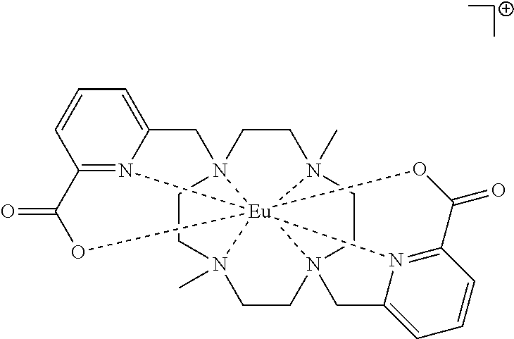 [Eu(S1)] 336 30% 41000 12300 1.05 (H2O) (H2O) (MeOH) (H2O) [Sm(S1)] 335 1% 47000 470 <0.01 (H2O) (H2O) (MeOH) (H2O) [Dy(S3)] 302 2% 15000 300 — (H2O) (H2O) (MeOH) [Tb(S3)] 300 72% 18000 10800 1.59 (H2O) (H2O) (MeOH) (H2O) [Eu(S4)] 333 10% 44000 4400 0.77 (H2O) (H2O) (MeOH) (H2O) (*)B = Φ * εmax and is estimated with Φ in H2O and ε in MeOH Example 3-2: Comparative Spectroscopic Data of Chelates
